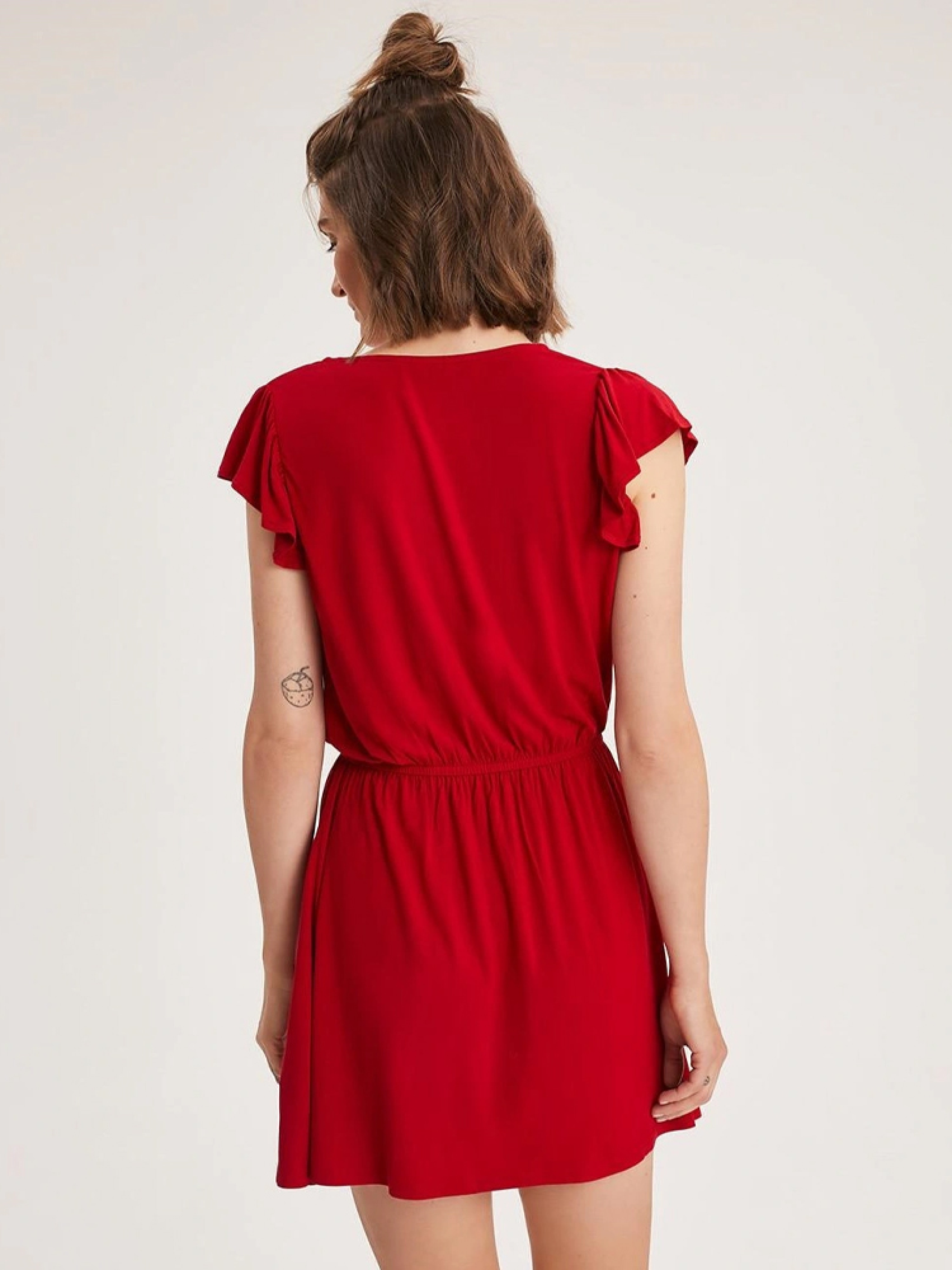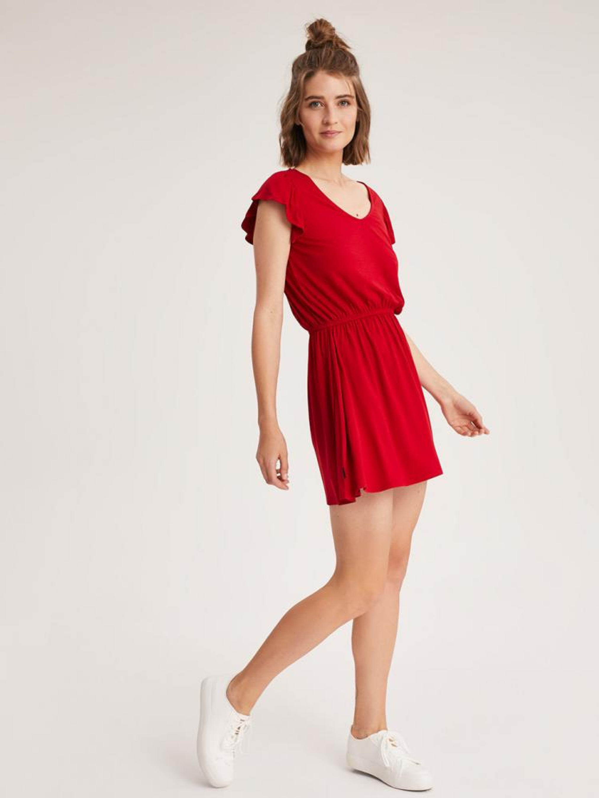 Короткое платье ASTREA с оборкой на рукавах и V-образным вырезом горловины. Изделие однотонного красного цвета, изготовлено из качественной вискозы. На талии прошита эластичная резинка. Длина платья до бедра. Легкое, приятное на ощупь и комфортное для ежедневного использования весной, летом. Сезон: Весна/Лето. Состав: 95% вискоза 5% эластан