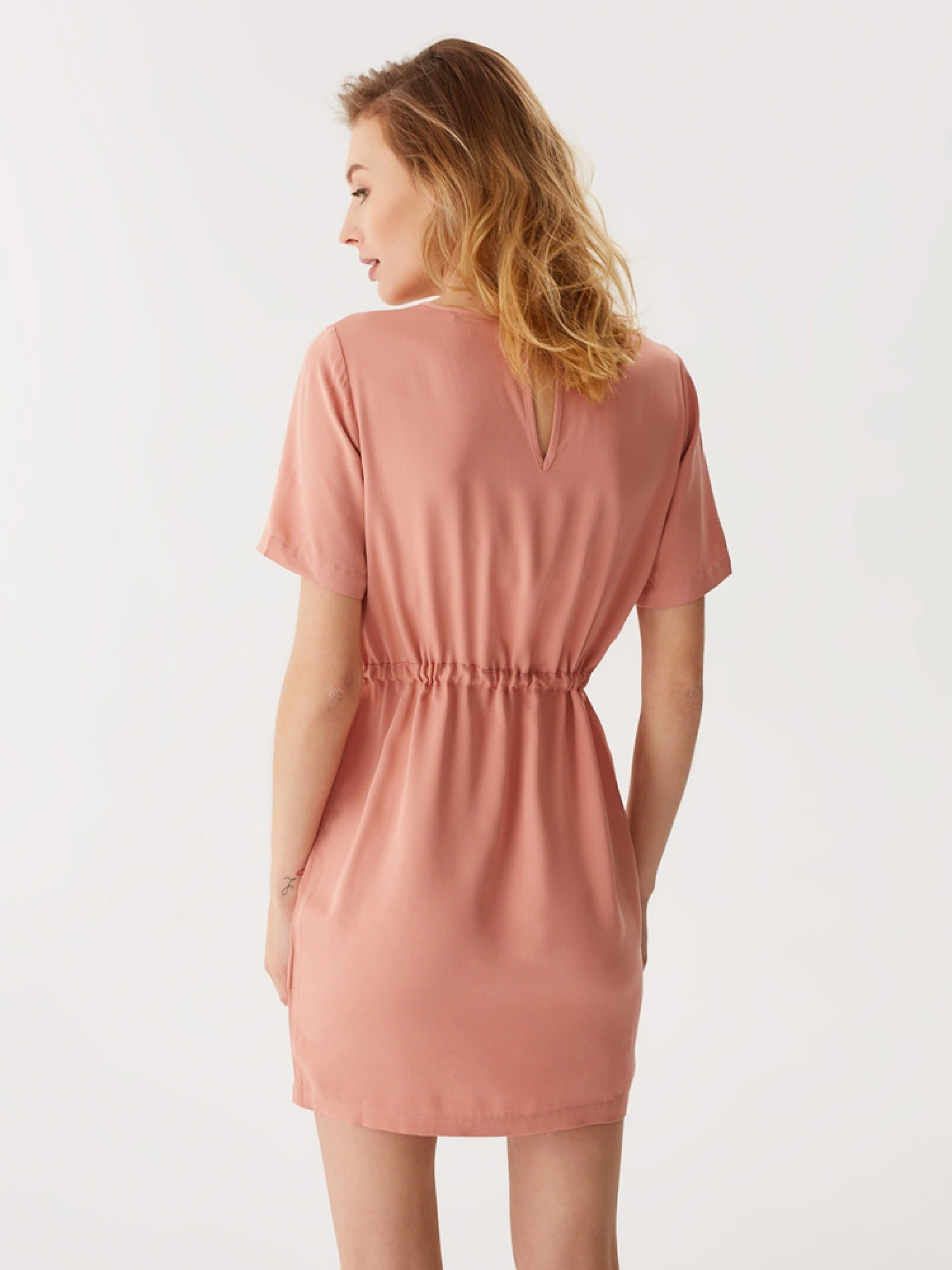 Легкое женское платье DESTI с длиной выше колена можно приобрести в нежном пепельно-розовом цвете. Модель идет с накладными карманами спереди и кулиской со шнурком, того же тона что и все изделие, для удобной регулировки талии. Платье, приятное на ощупь и комфортное для ежедневного использования в теплые дни весны и лета. Сезон: Весна/Лето. Состав: 100% вискоза