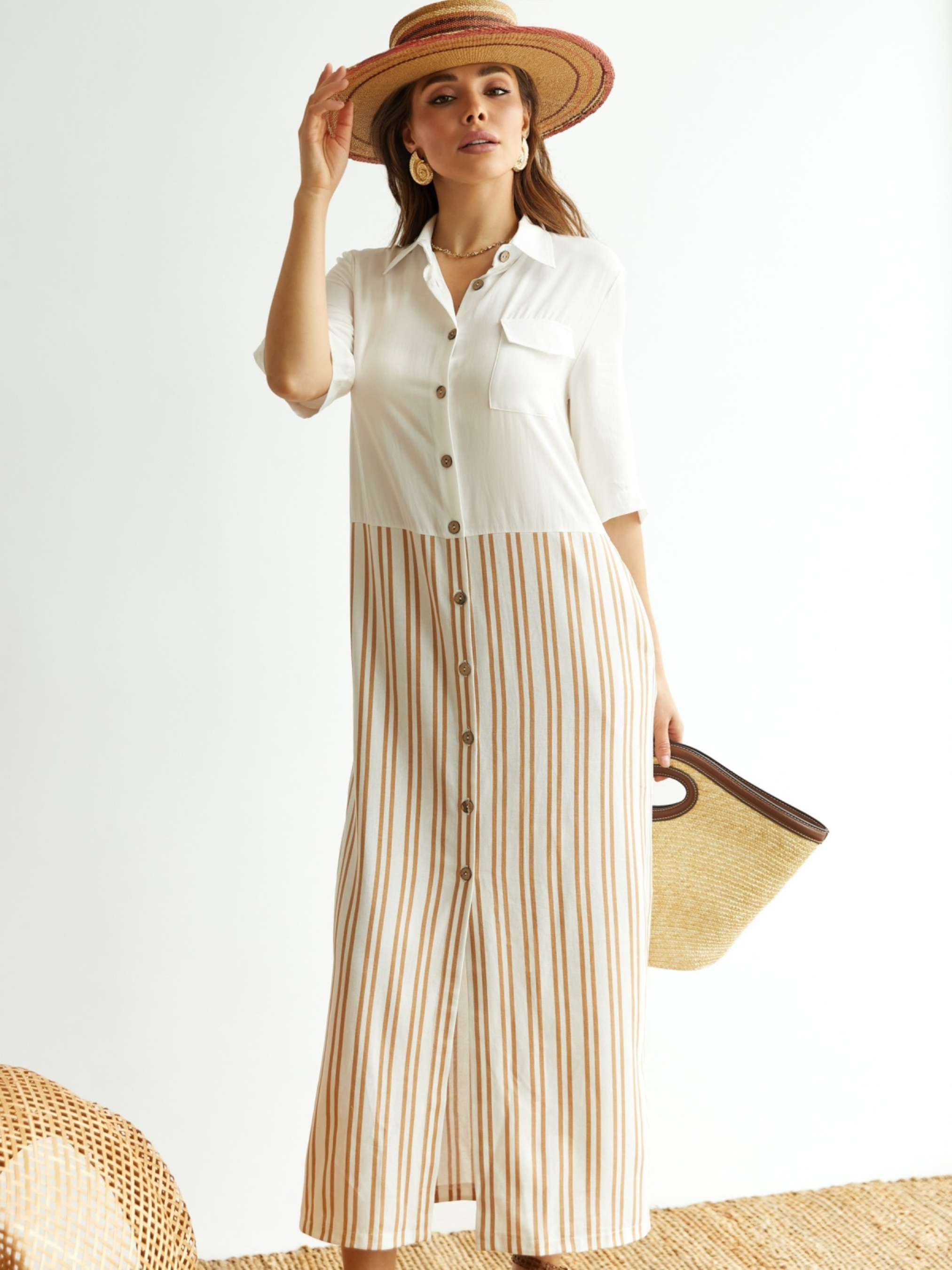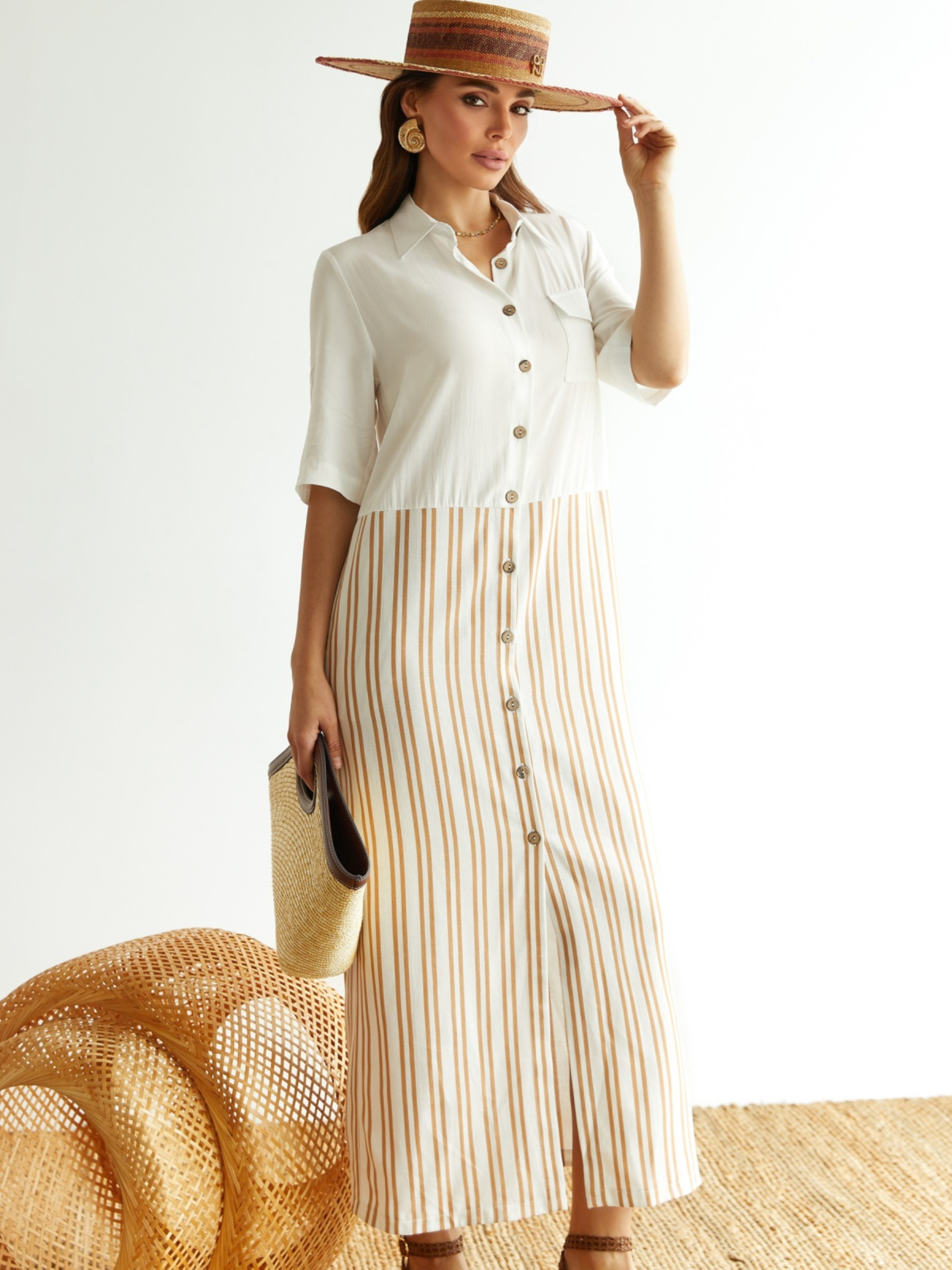 Платье-рубашка свободного кроя с отложным воротником и короткими рукавами.. Вертикальная полоска визуально удлиняет силуэт, создавая эффект стройности. Прорезные карманы в боковых швах добавляют удобства. Модель гармонично смотрится на фигурах типа «прямоугольник» и «овал», подчёркивая линии без излишнего облегания.