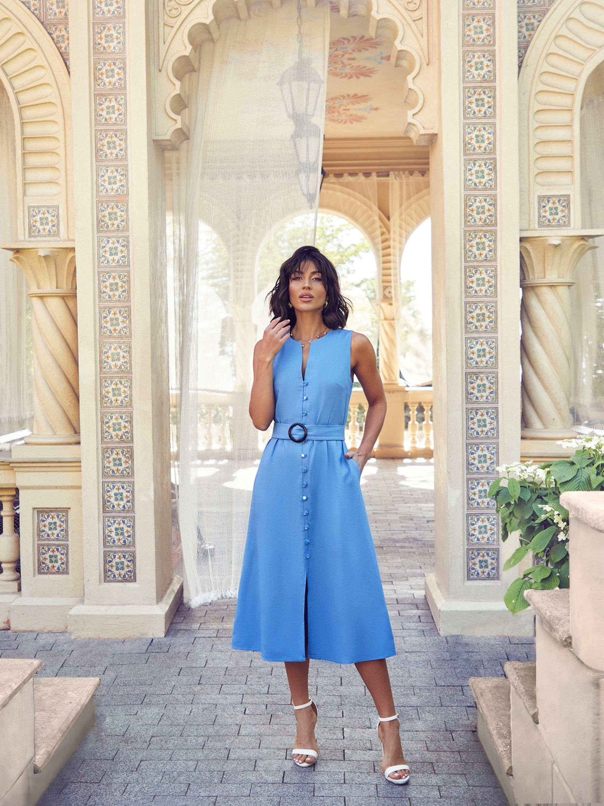 Элегантное платье без рукавов из льняной ткани с узким треугольным вырезом. Модель отрезная по талии с юбкой-трапецией, декорированной рядом пуговиц. В боковых швах предусмотрены карманы. Застегивается на пуговицы по полочке и скрытую молнию сзади. Пояс с массивной пряжкой в комплекте.