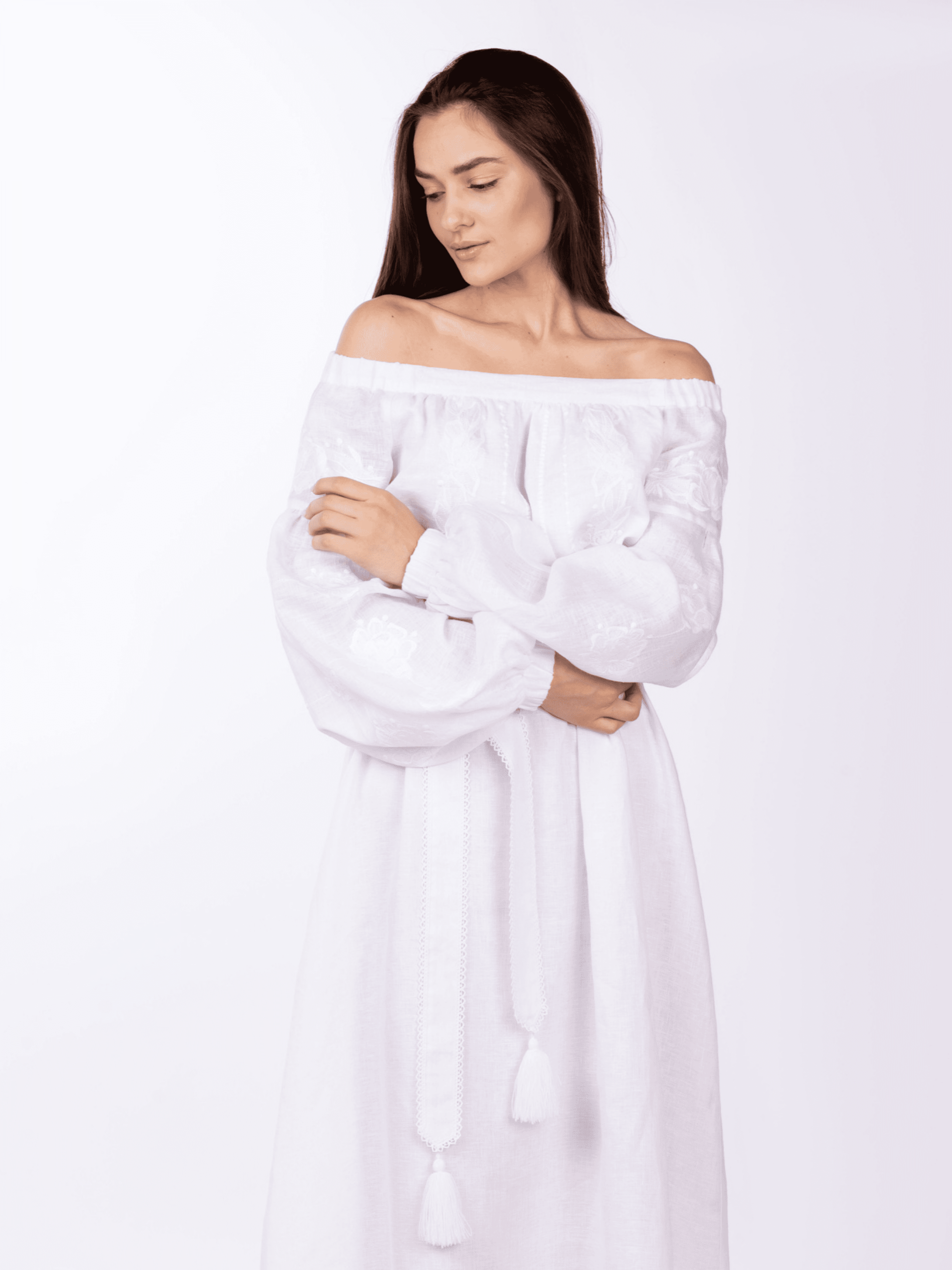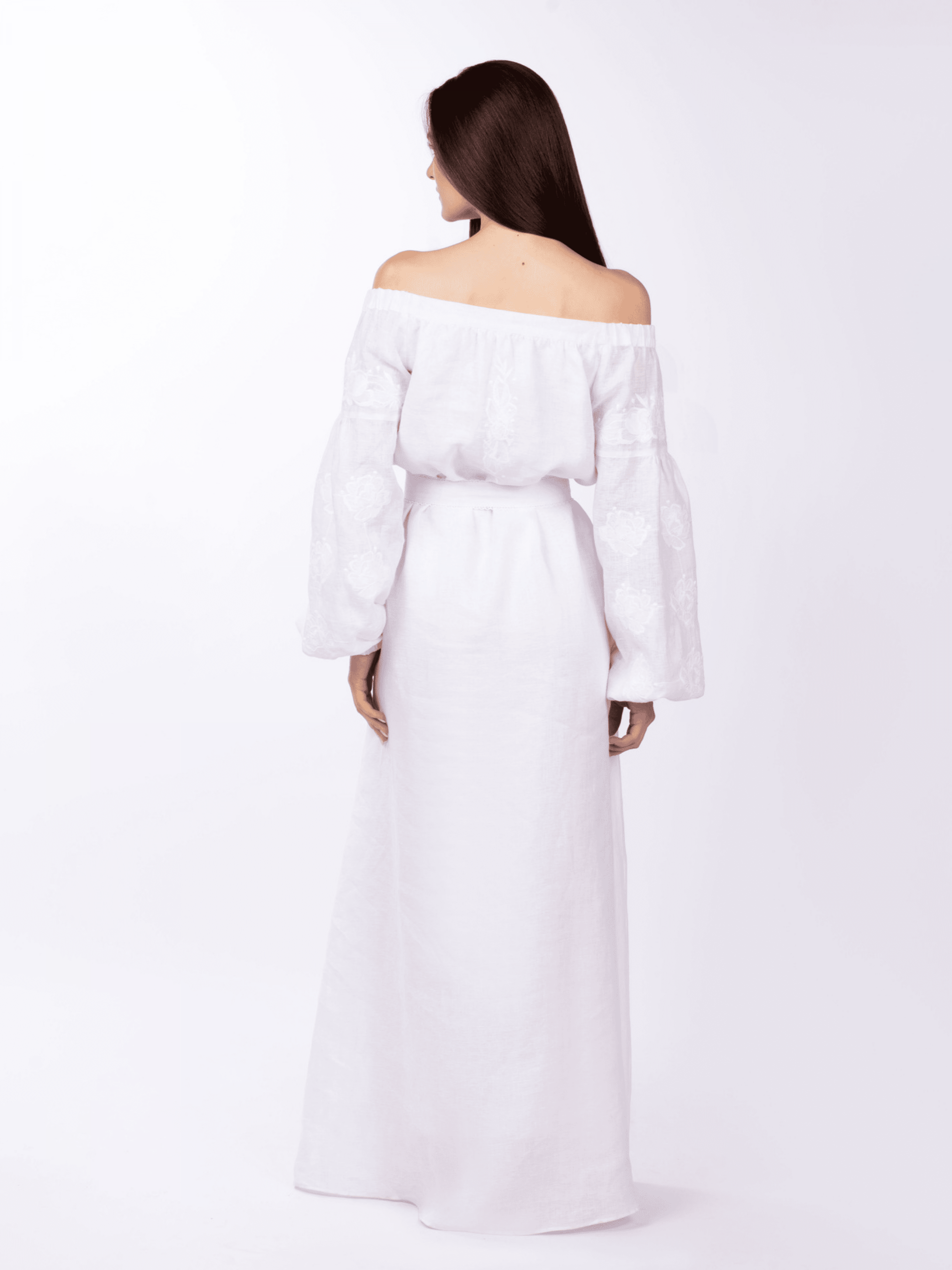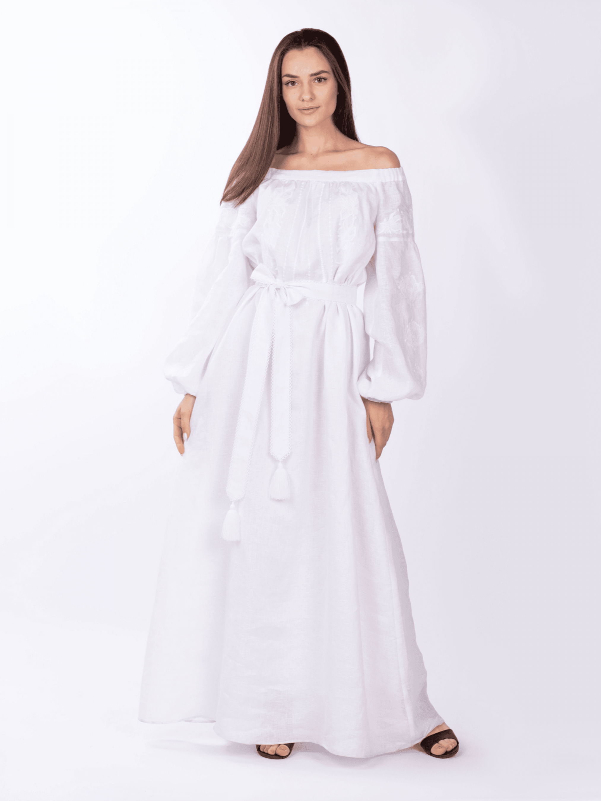 У цю сукню Ви закохаєтесь з першого дотику. Невагомість лляної тканини ніби огортає турботою та ласкою тендітне жіноче тіло. Трапецеподібний силует та відкриті плечі дарують виробу нотки впевненості та елегантності, а мереживний поясок вдало підкреслить Вашу талію. Пілочка, спинка та рукави сукні вишиті білосніжним рослинним орнаментом на природньому білому полотні. Даний елемент вишивки створює ефект рельєфу зі світловими змінами, змінює форму малюнка, поглинаючи та відбиваючи світло. Багата гра орнаменту зі світлом створює такий собі 3D ефект по-українськи. В цій сукні-максі Ви матимете неперевершений вигляд, а традиційні квіткові орнаменти підкреслюватимуть Вашу етнічну приналежність.