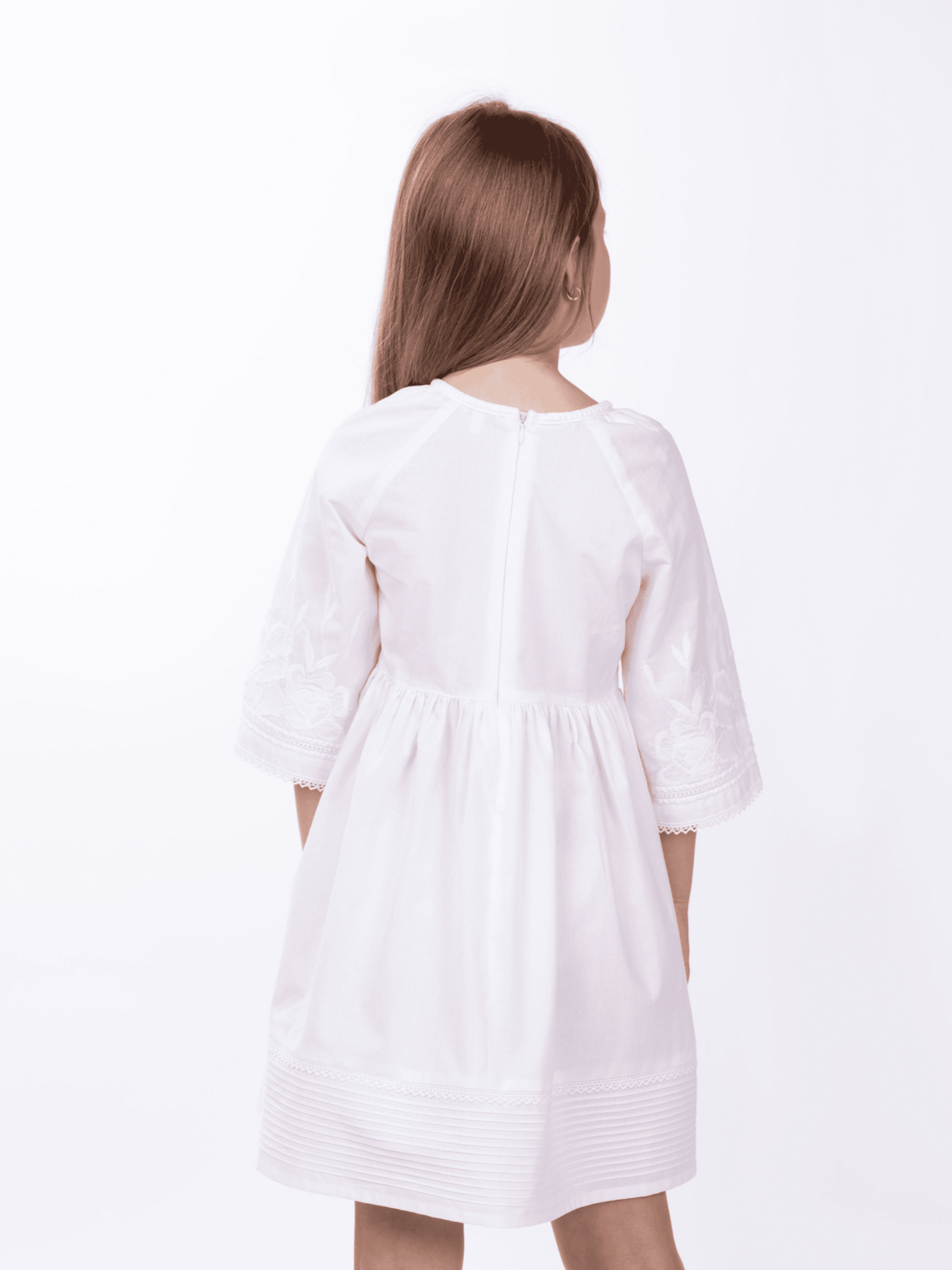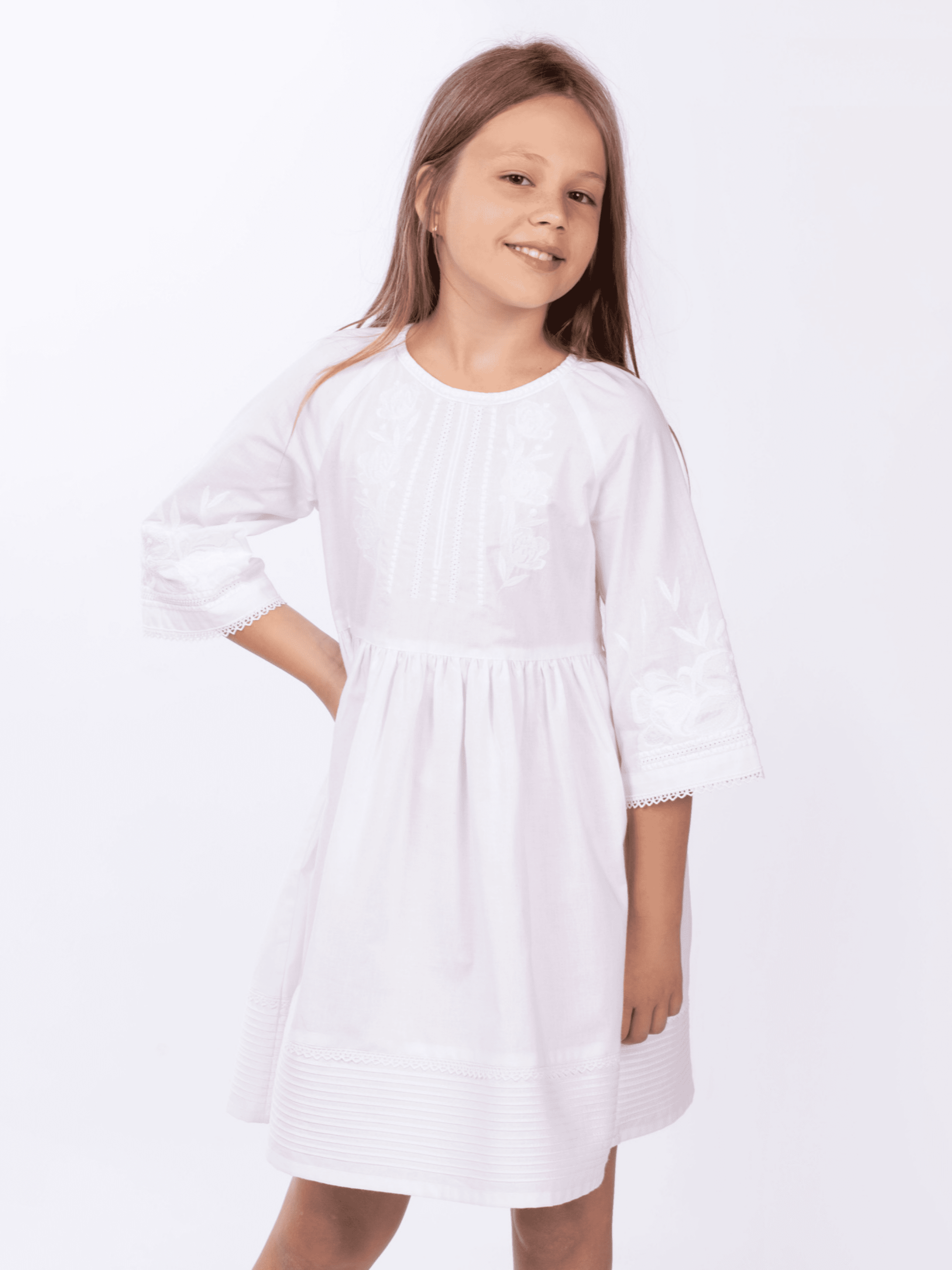 Неймовірно ніжна бавовняна сукня для маленьких красунь. Білосніжна вишивка – символ дитячої чистоти та невинності. В цій сукні кожна дівчинка відчує себе чарівною принцесою. Напівприлягаючий силует виробу буде зручним для активних та непосидючих. На грудях та рукавах-регланах сукня оздоблена вишитим рослинним візерунком у техніці гладь, а її краї прикрашає тоненька мережка. Така вишита сукня буде чудовим варіантом на будь-яку святкову подію, а символіка української орнаментики підкреслить вагомість традицій в сьогоденні.