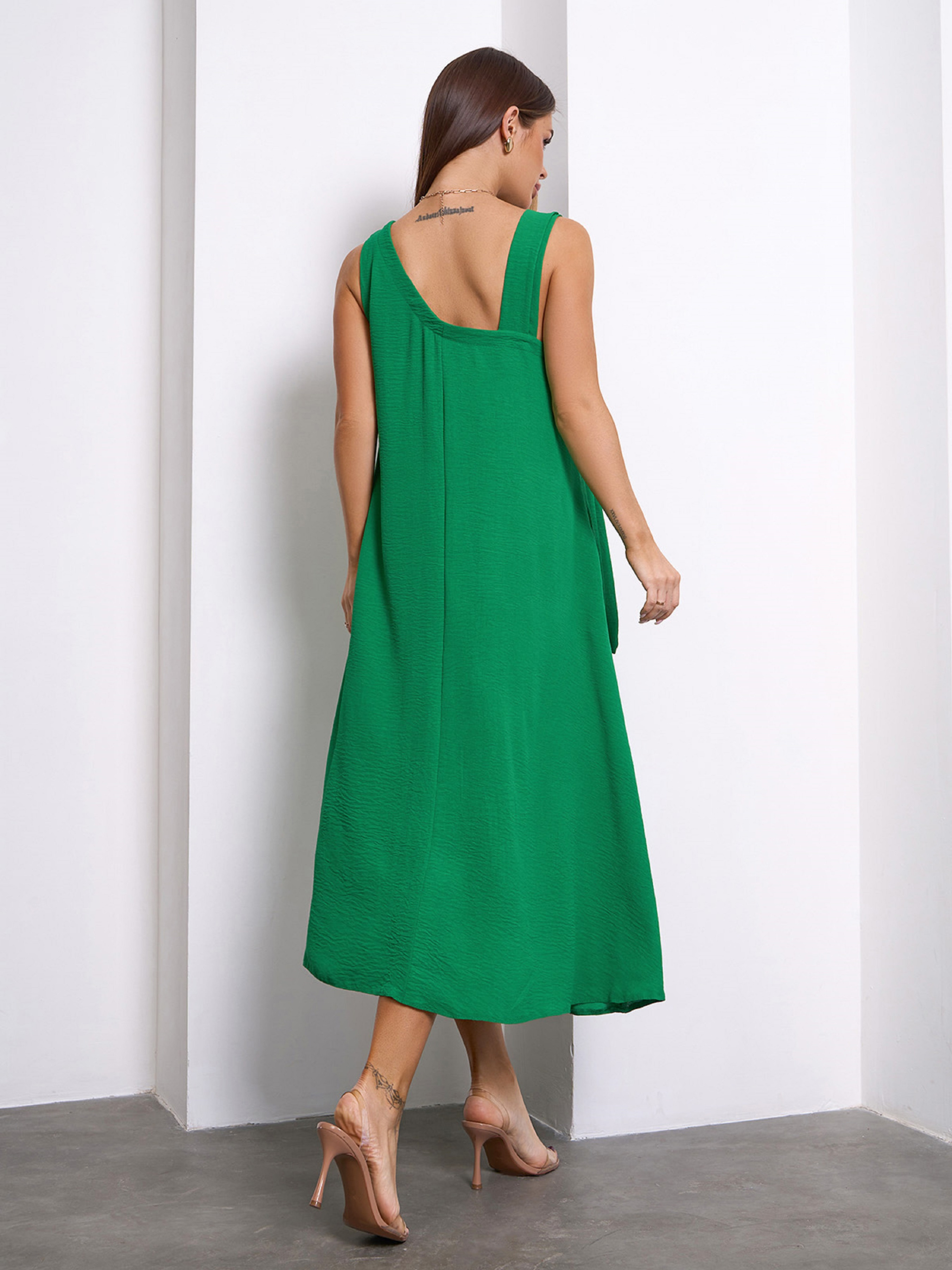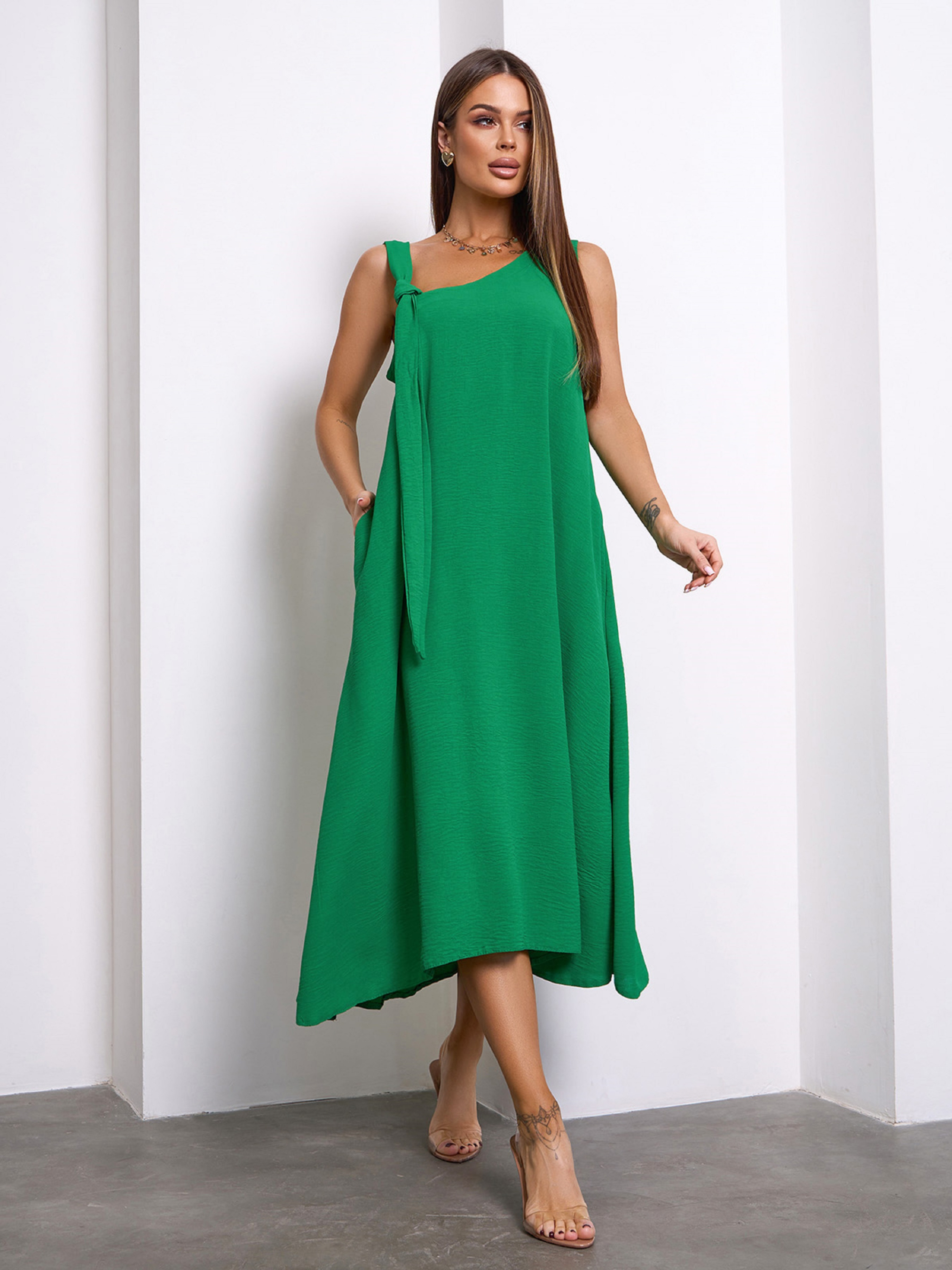 Зеленый свободный сарафан кроя трапеции с асимметричной проймой горловины. Сарафан с регулируемой бретелей-завязкой и расклешенным кроем. Модель выполнена из текстурированного крепа с миди длиной и боковыми карманами. Полуобхват: Грудь: S (45), M (47), L (49), XL (51), Талия: S (54), M (56), L (58), XL (60), Бедра: S (65), M (67), L (69), XL (71), Длина изделия - 112, Ткань: Низкой эластичности. Состав: 59% полиэстер, 21% эластан, 20% хлопок