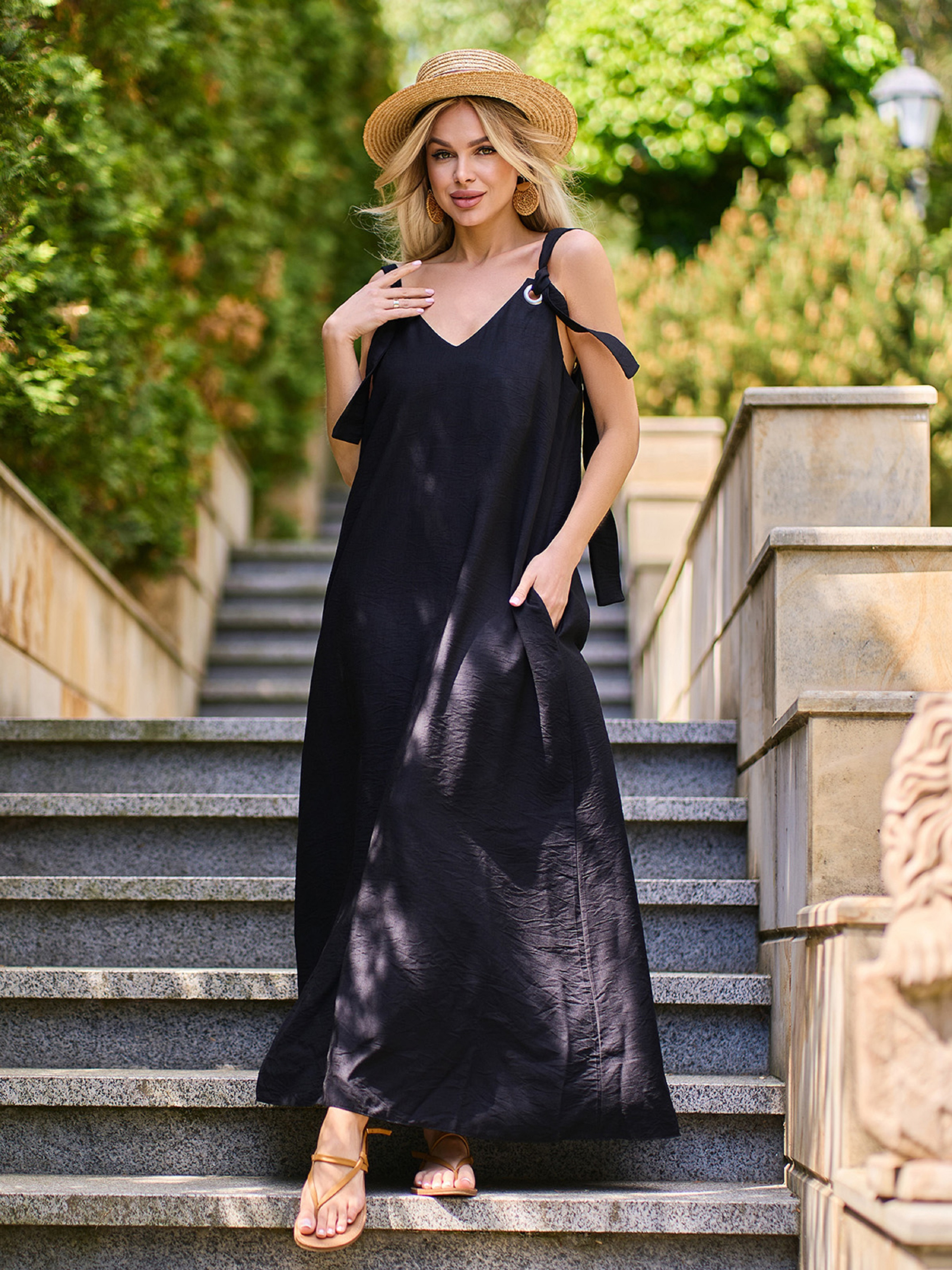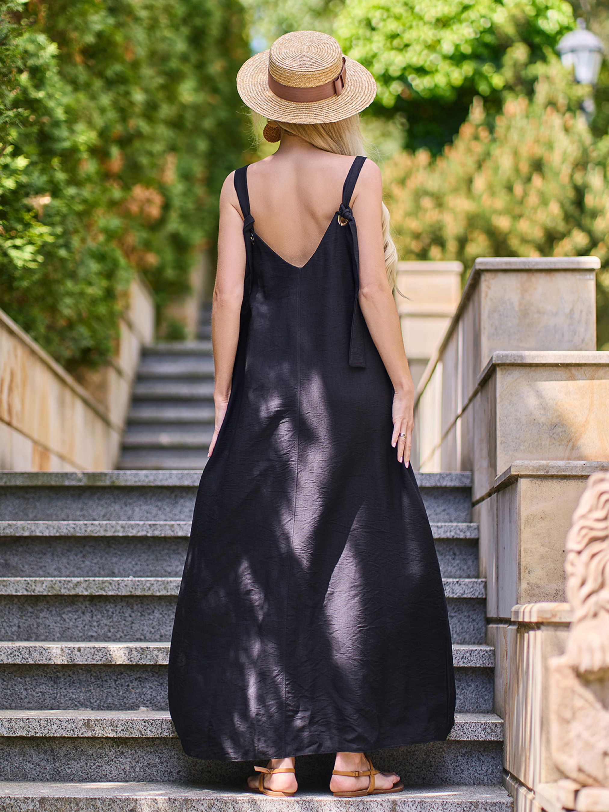 Черный легкий сарафан расклешенного кроя трапеции с открытой спинкой, выполненный из текстурированного льна. Модель с V-образными проймами горловины и плечевыми завязками на люверсах. Сарафан с карманами. Полуобхват: Грудь: S (46), M (48), L (50), XL (52), Талия: S (54), M (56), L (58), XL (60), Бедра: S (62), M (64), L (66), XL (68), Длина изделия - 142, Ткань: Низкой эластичности. Состав: 65% лен, 20% хлопок, 15% полиэстер