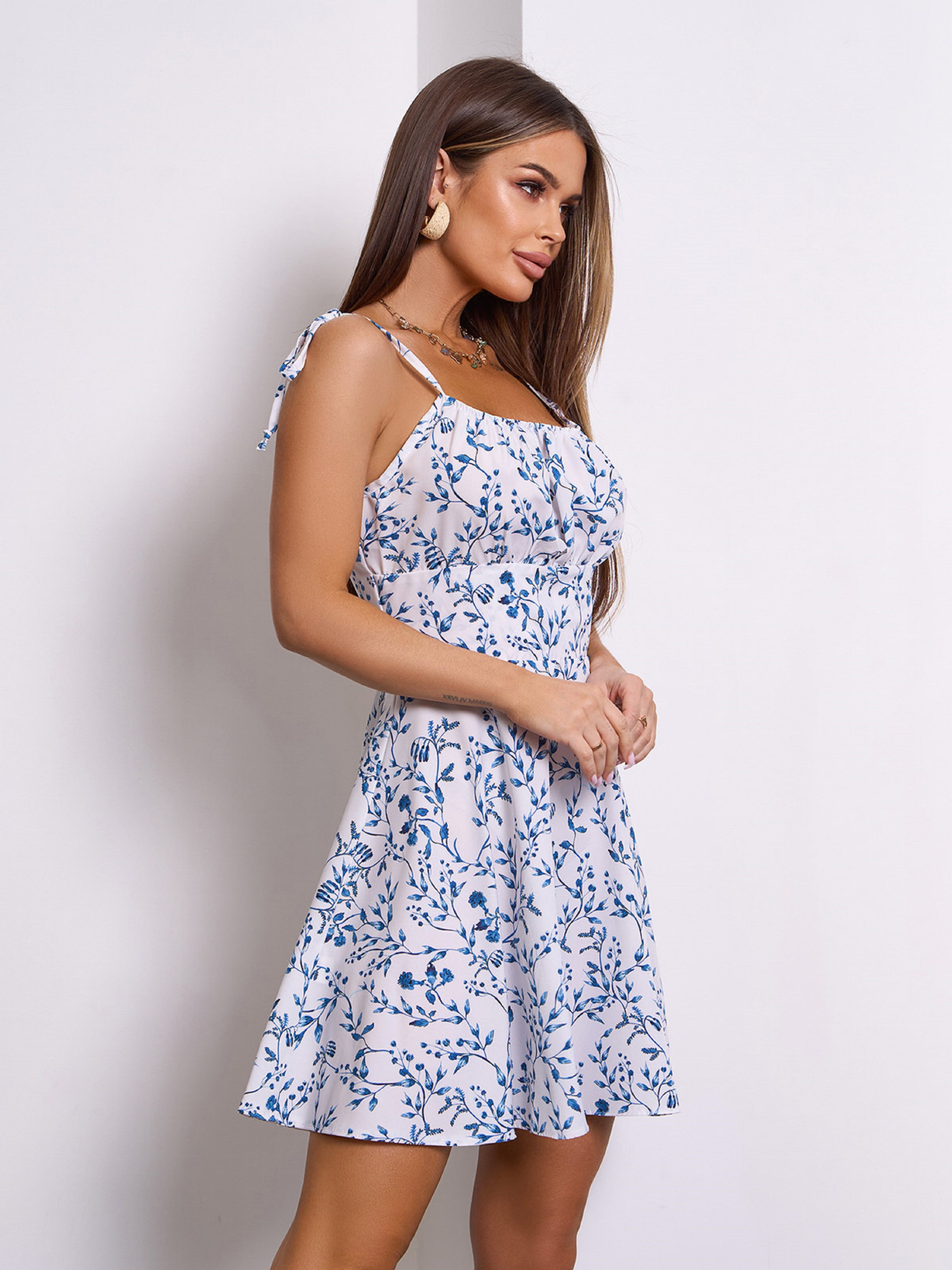 Бело-голубой летний сарафан из цветочного софта с резинками вдоль горловины и жаткой на спинке. Сарафан приталенного кроя с бретельками-завязками и расклешенным коротким низом. Полуобхват: Грудь: S (37), M (39), L (41), XL (43), Талия: S (35), M (37), L (39), XL (41), Бедра: S (71), M (69), L (71), XL (71), Длина изделия - 82, Ткань: Низкой эластичности. Состав: 50% хлопок, 50% полиэстер