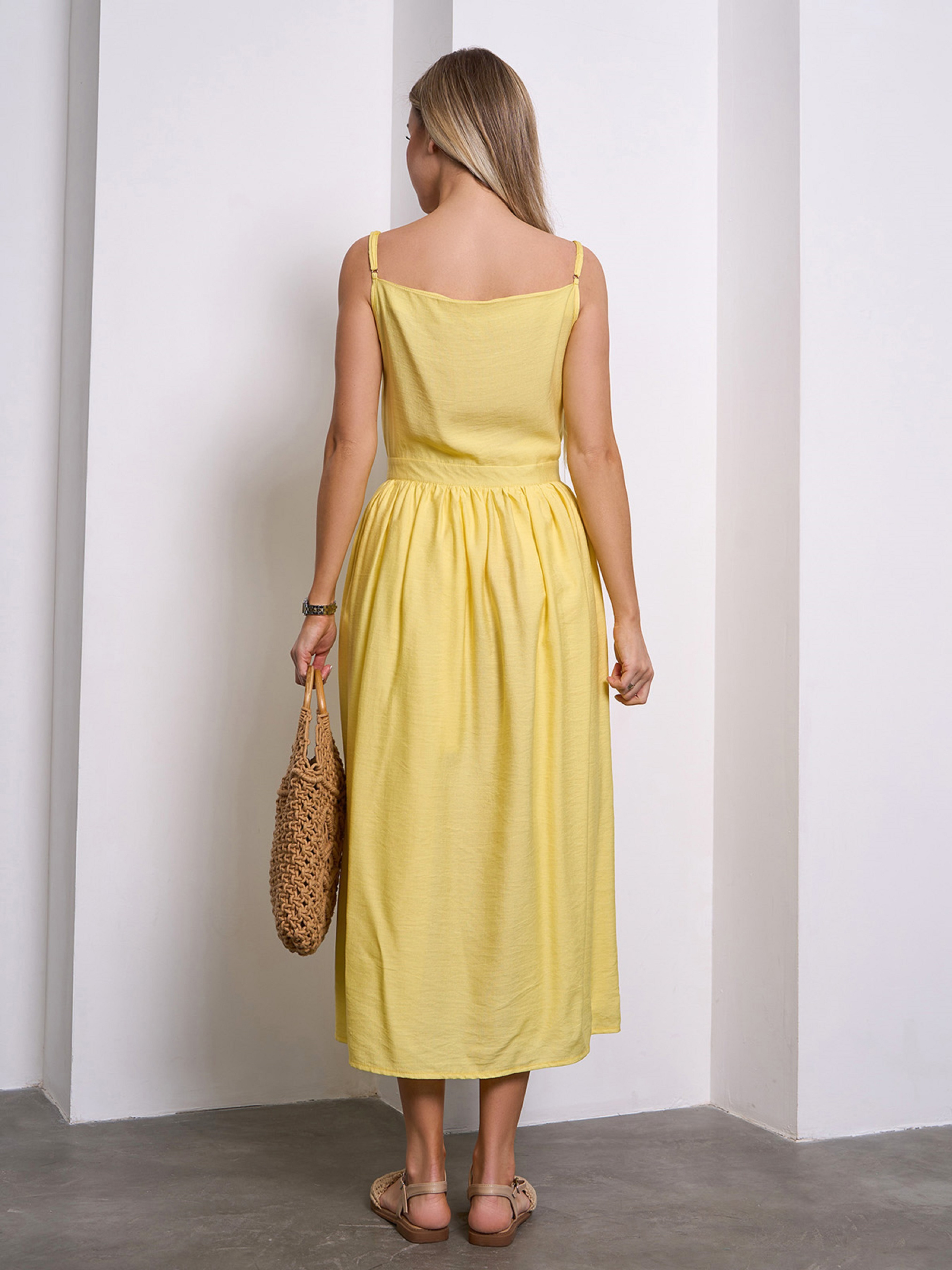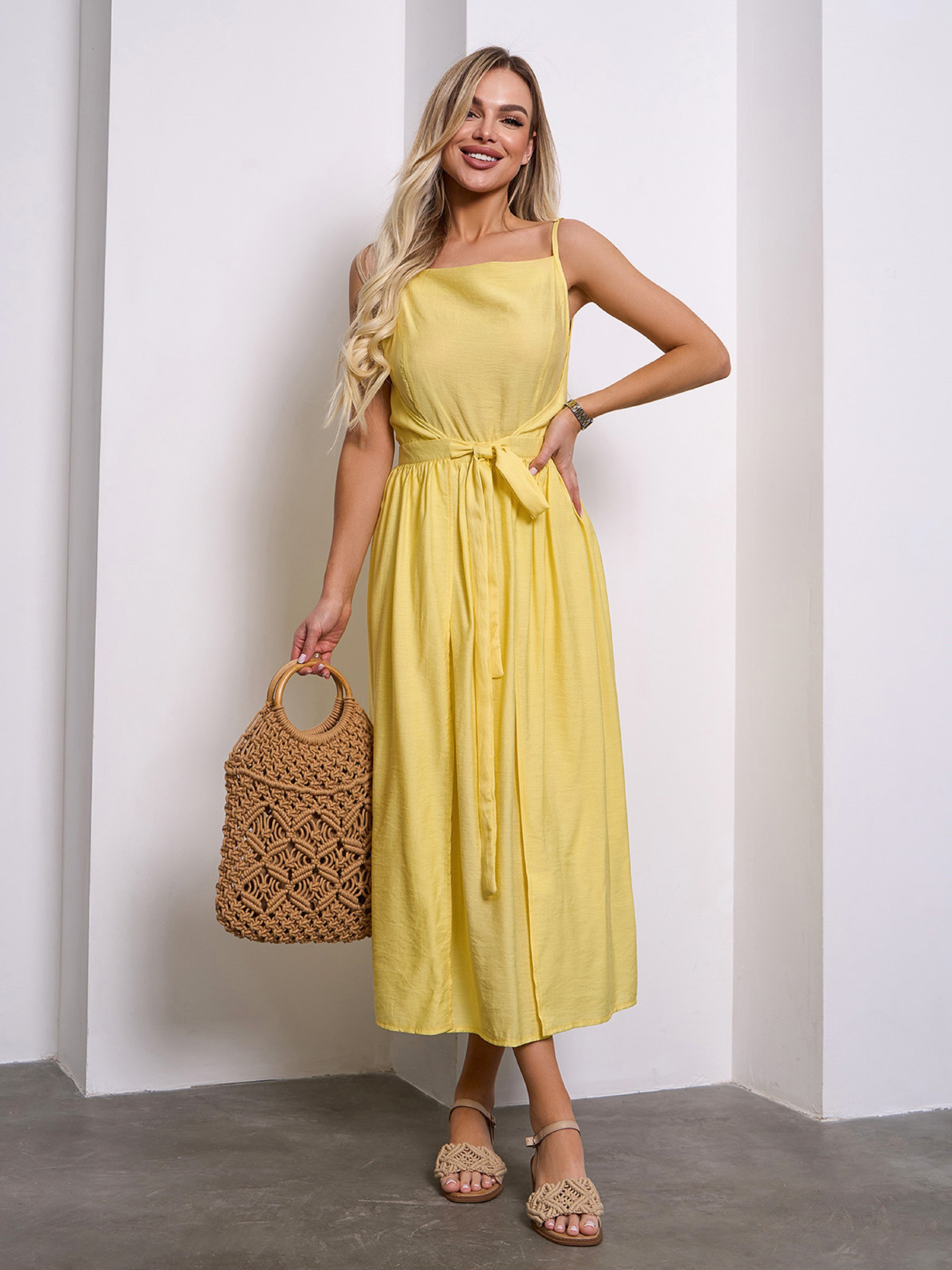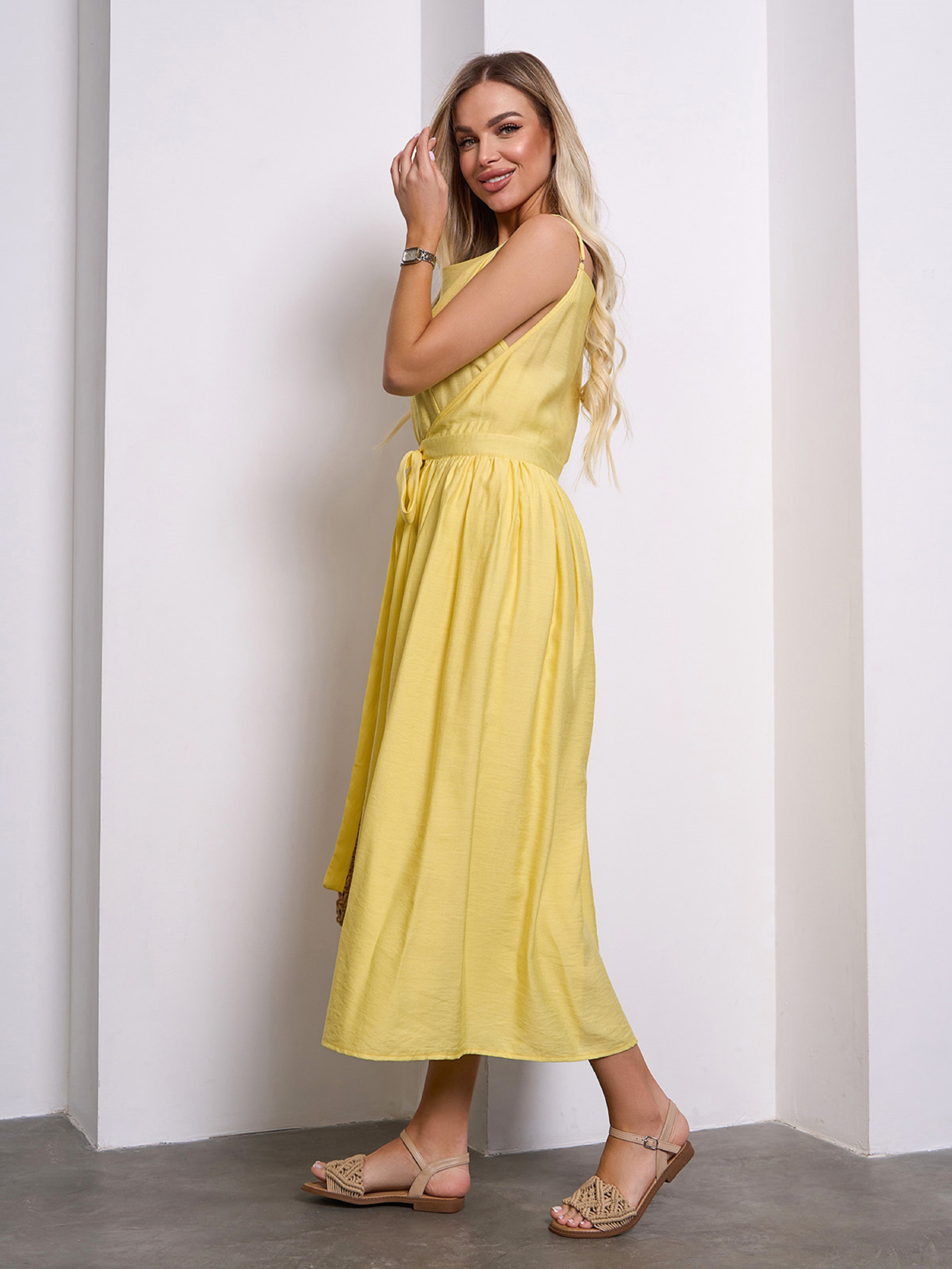 Молодежный сарафан оригинального фасона на запах, выполненный из однотонного желтого льна. Модель приталенного кроя с тонкими регулируемыми бретелями и расклешенным низом миди длины. Модель состоит из двух частей, которые фиксируются по очереди завязками на талии. Полуобхват: Грудь: S (45), M (47), L (49), XL (51), Талия: S (31), M (33), L (35), XL (37), Бедра: S (67), M (69), L (71), XL (73), Длина изделия - 117, Ткань: Низкой эластичности. Состав: 65% лен, 20% хлопок, 15% полиэстер
