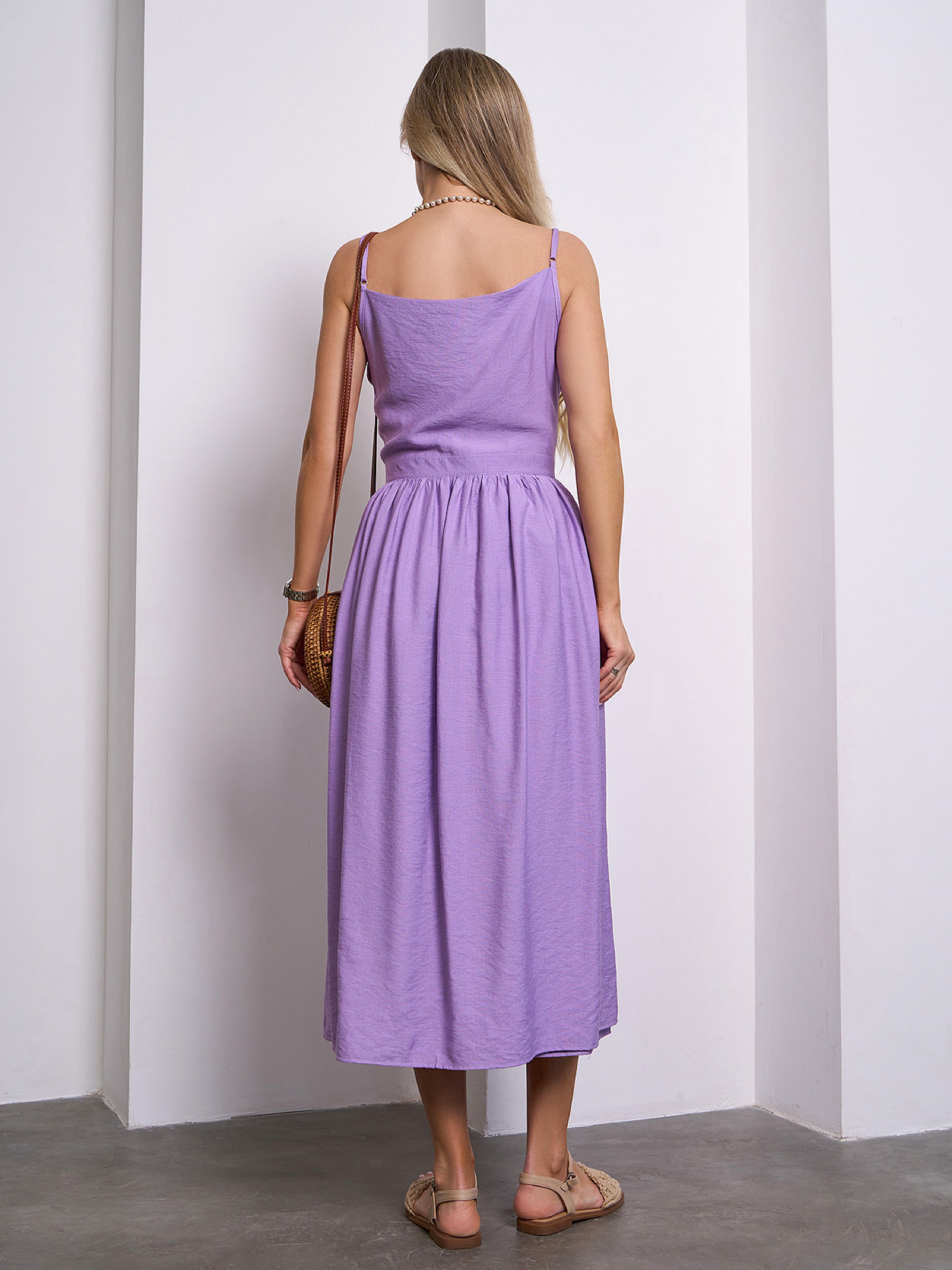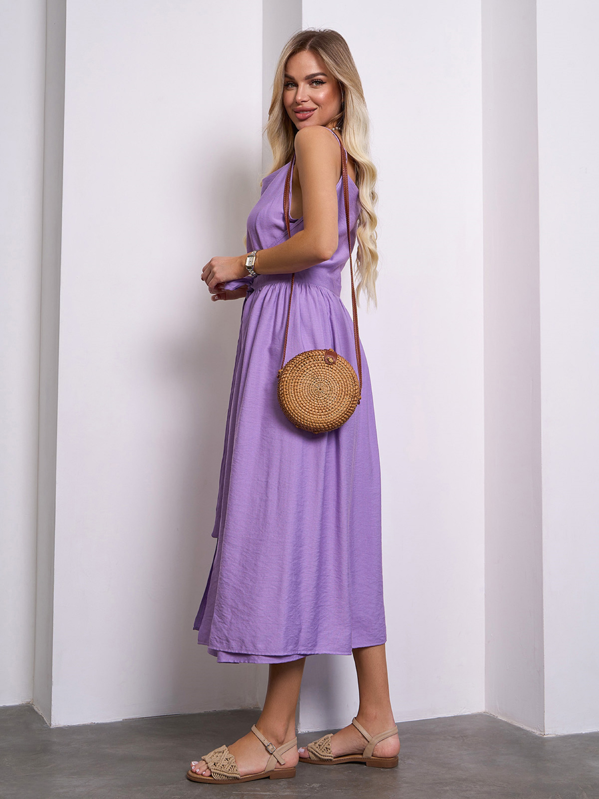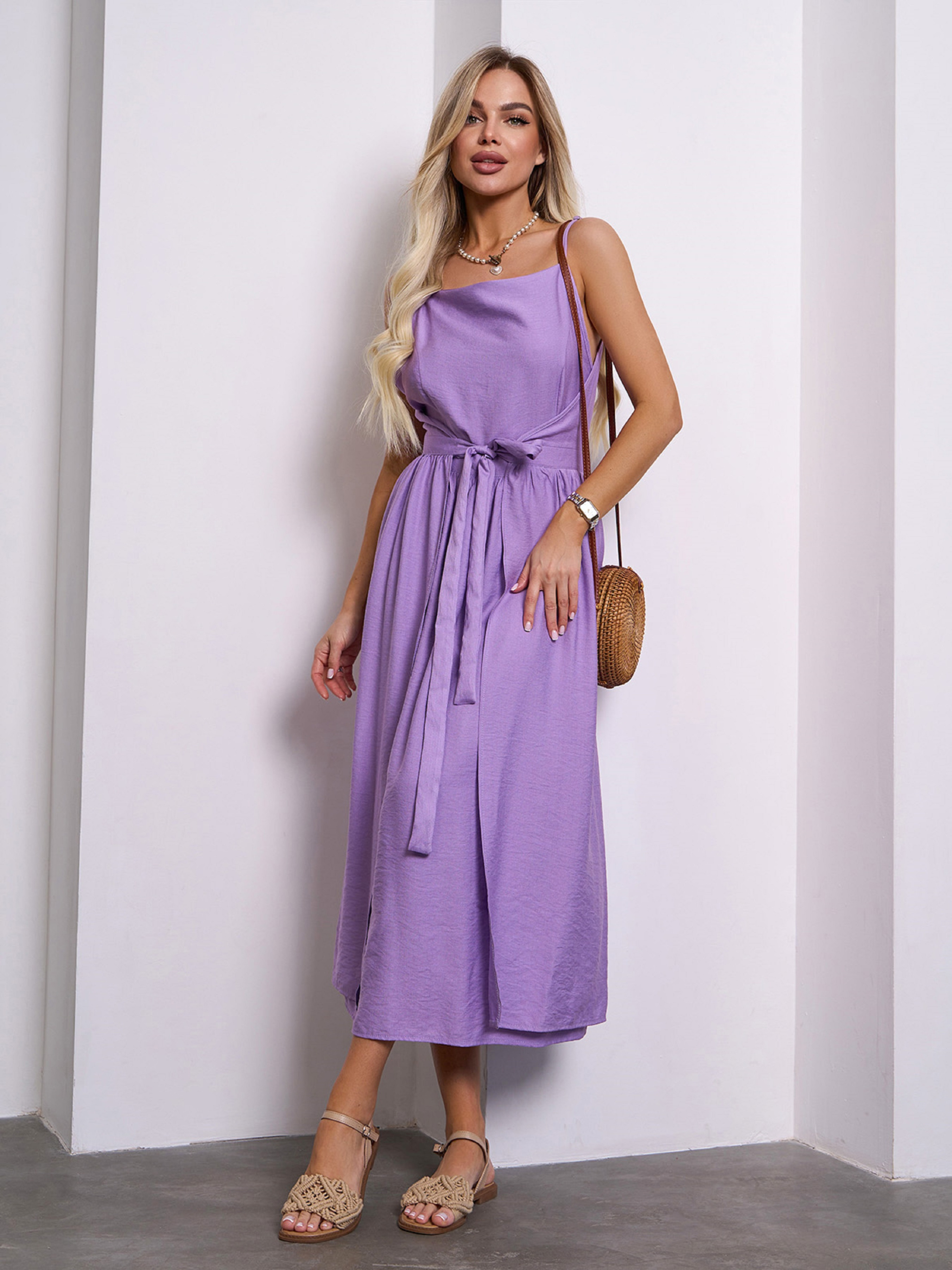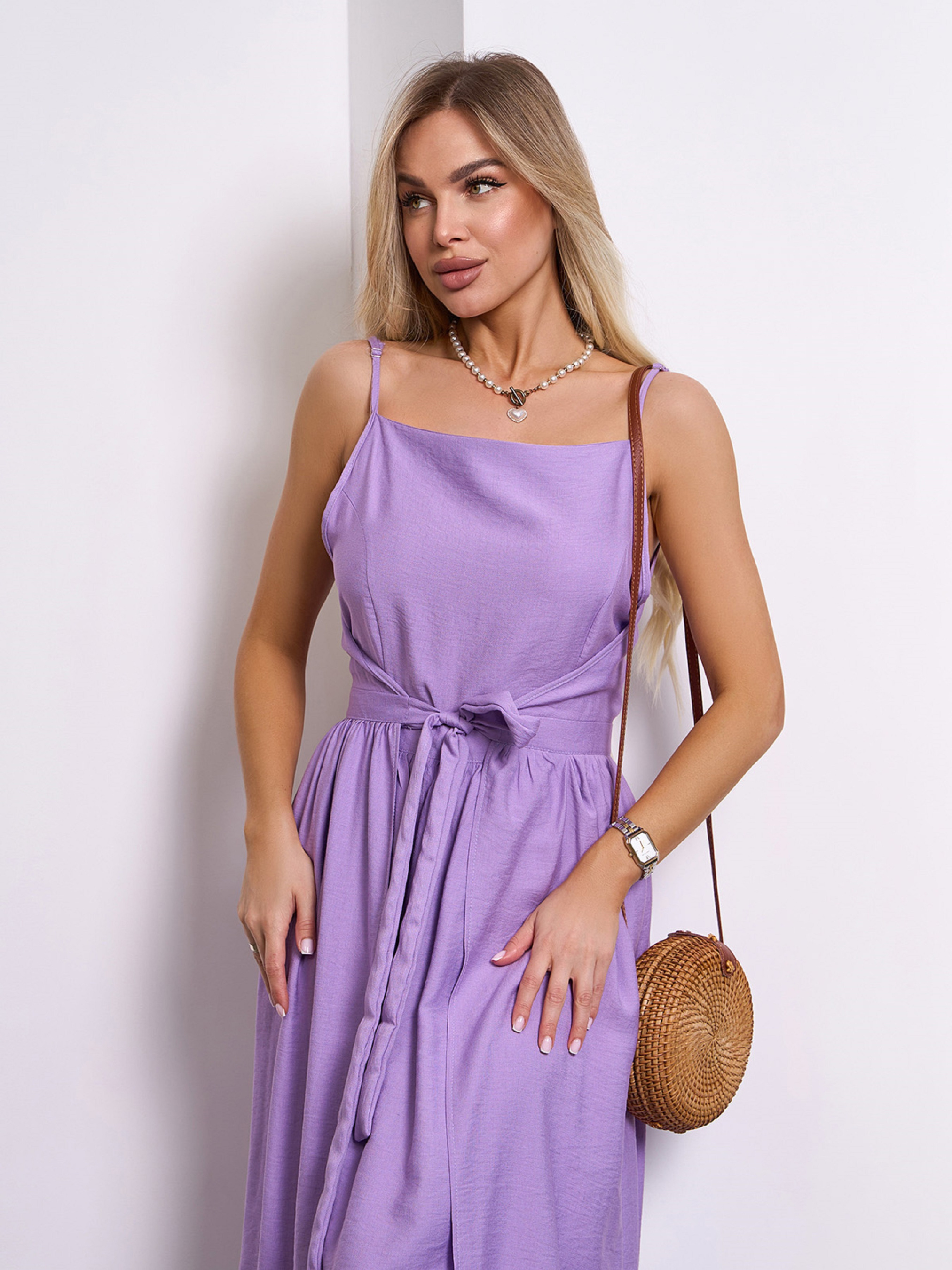 Легкий сарафан фасона на запах, выполненный из однотонного льняного материала сиреневого цвета. Модель приталенного кроя с тонкими регулируемыми бретелями и расклешенным низом миди длины. Модель состоит из двух частей, которые фиксируются по очереди завязками на талии. Полуобхват: Грудь: S (45), M (47), L (49), XL (51), Талия: S (31), M (33), L (35), XL (37), Бедра: S (67), M (69), L (71), XL (73), Длина изделия - 117, Ткань: Низкой эластичности. Состав: 65% лен, 20% хлопок, 15% полиэстер