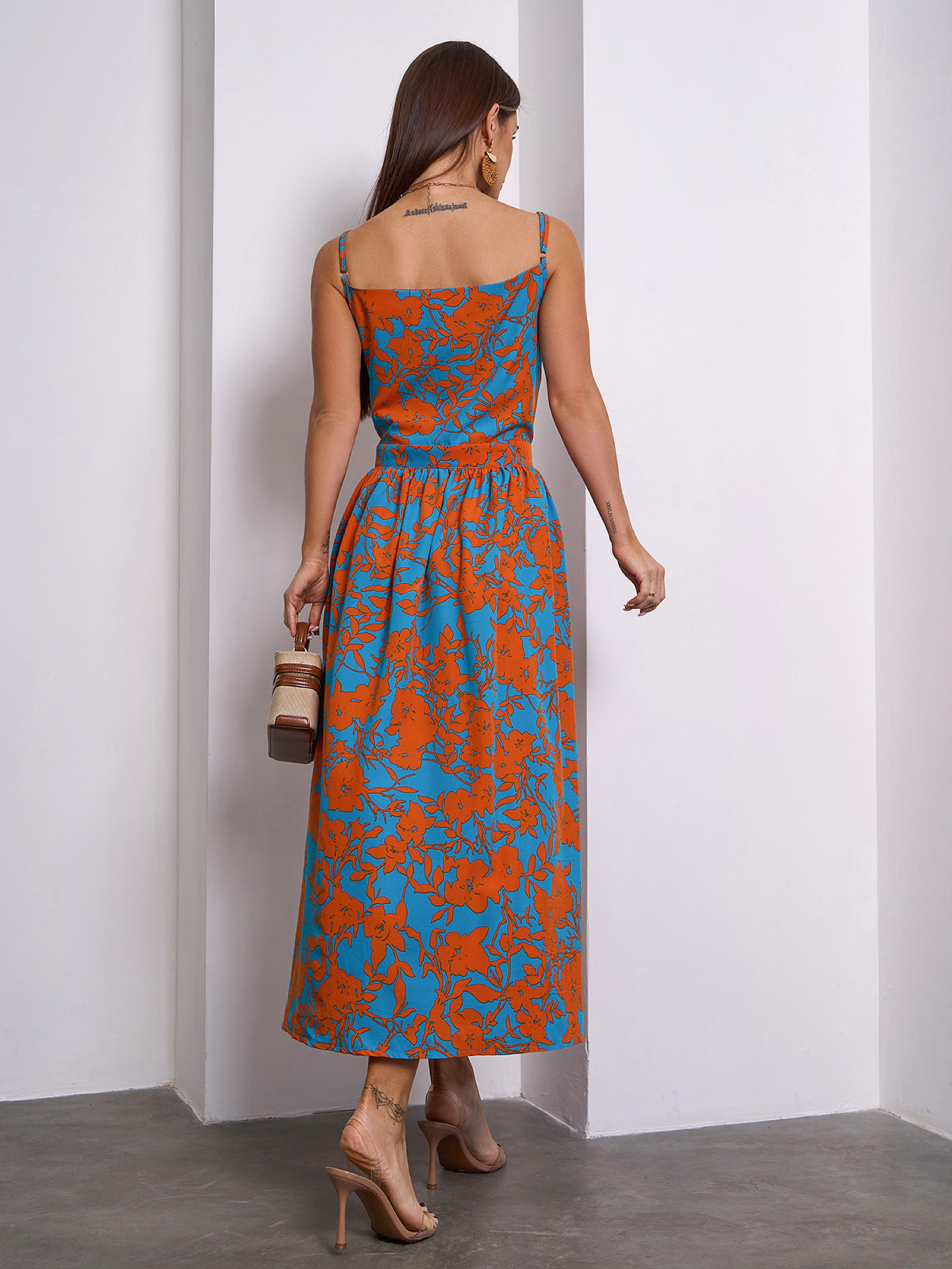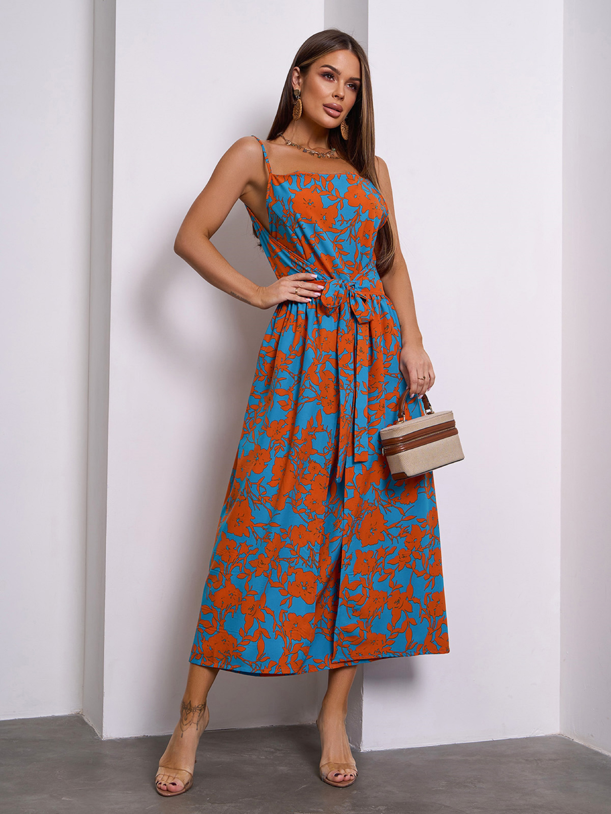 Бирюзово-оранжевый цветочный сарафан, выполненный из софта. Модель приталенного кроя на запах с тонкими регулируемыми бретелями и расклешенным низом миди длины. Модель состоит из двух частей, которые фиксируются по очереди завязками на талии. Полуобхват: Грудь: S (45), M (47), L (49), XL (51), Талия: S (31), M (33), L (35), XL (37), Бедра: S (67), M (69), L (71), XL (73), Длина изделия - 117, Ткань: Низкой эластичности. Состав: 59% полиэстер, 21% эластан, 20% хлопок