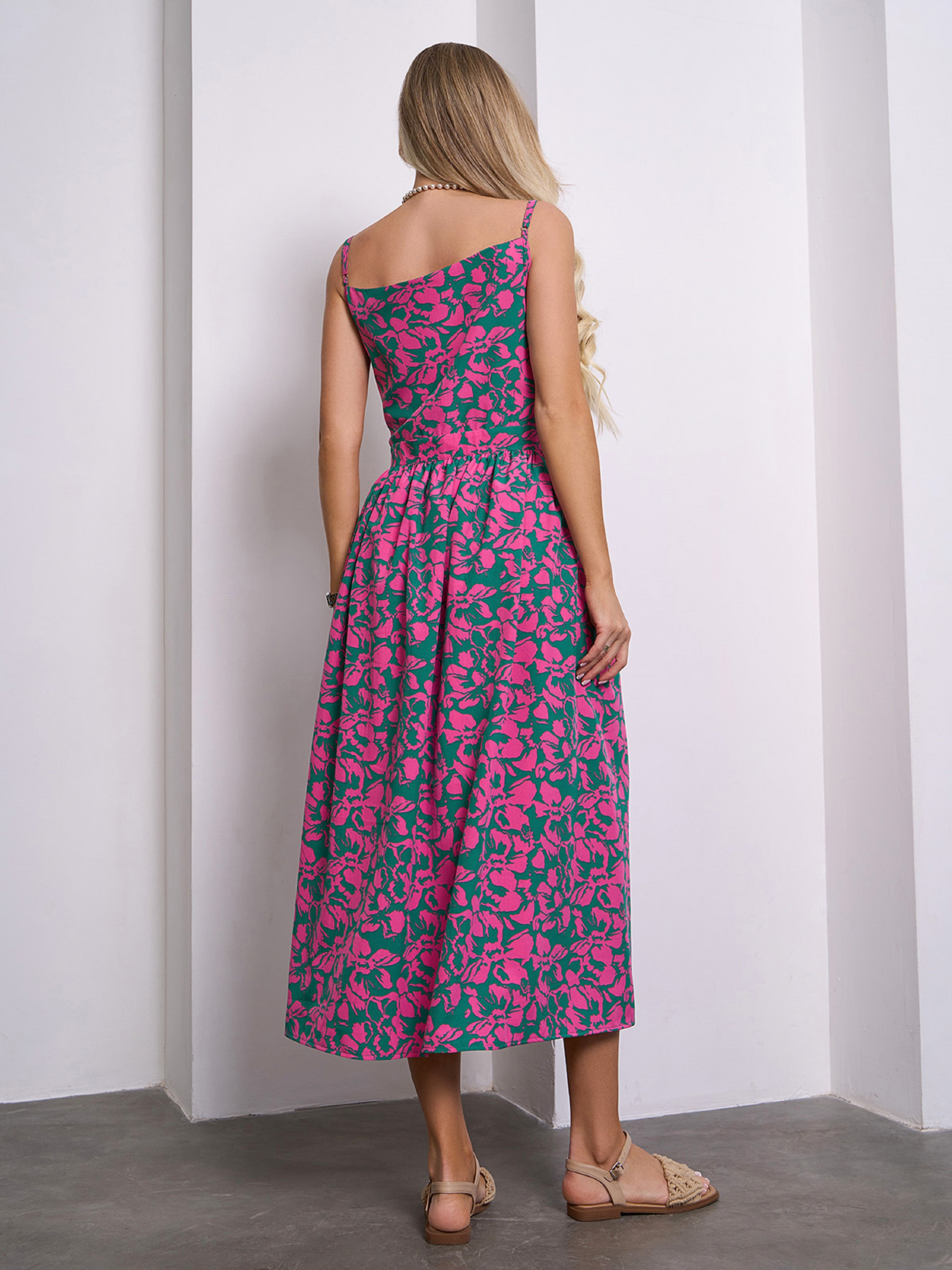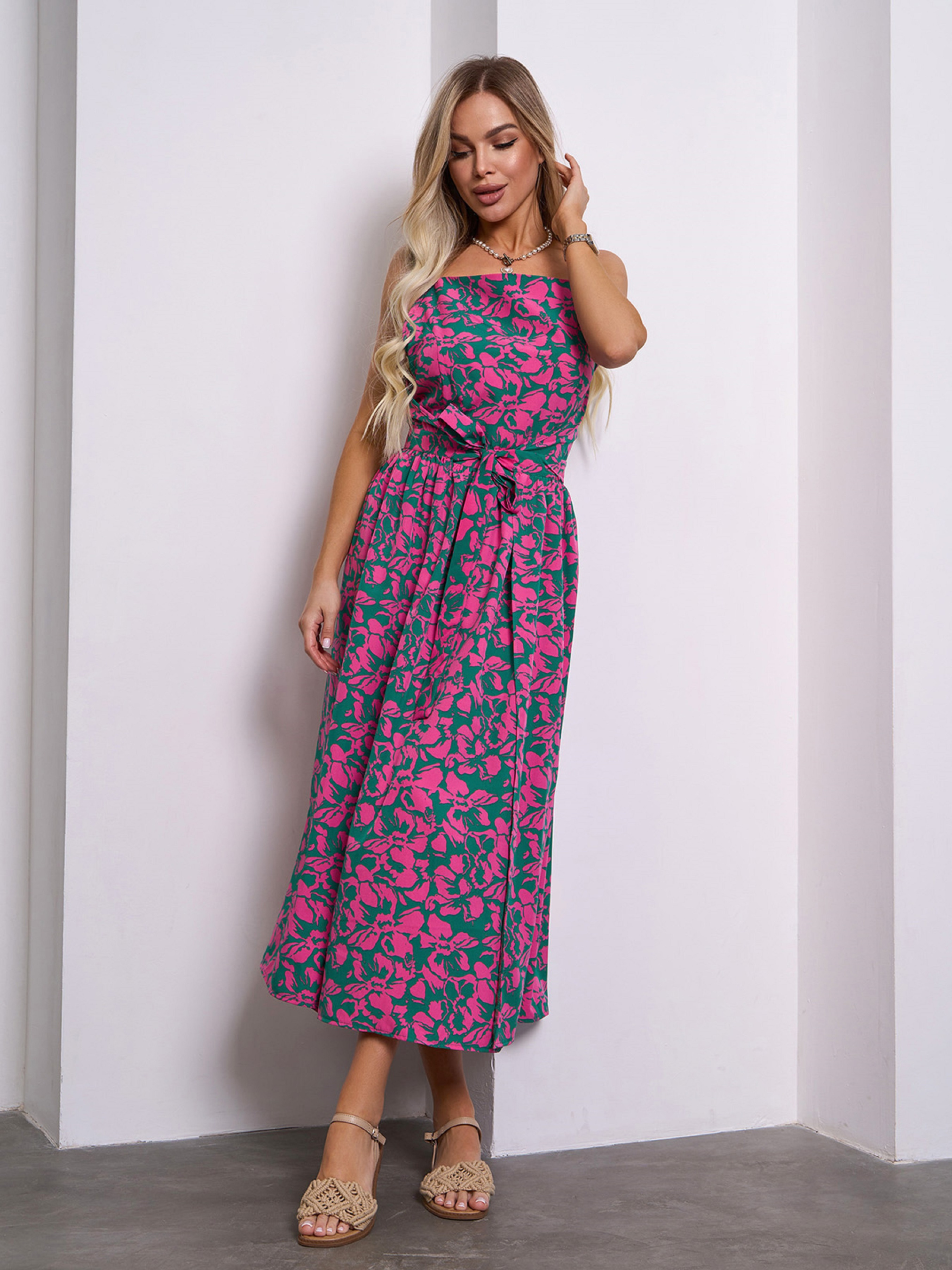 Яркий сарафан приталенного кроя на запах, выполненный из цветочного софта. Модель приталенного кроя с тонкими регулируемыми бретелями и расклешенным низом миди длины. Модель состоит из двух частей, которые фиксируются по очереди завязками на талии. Полуобхват: Грудь: S (45), M (47), L (49), XL (51), Талия: S (31), M (33), L (35), XL (37), Бедра: S (67), M (69), L (71), XL (73), Длина изделия - 117, Ткань: Низкой эластичности. Состав: 59% полиэстер, 21% эластан, 20% хлопок