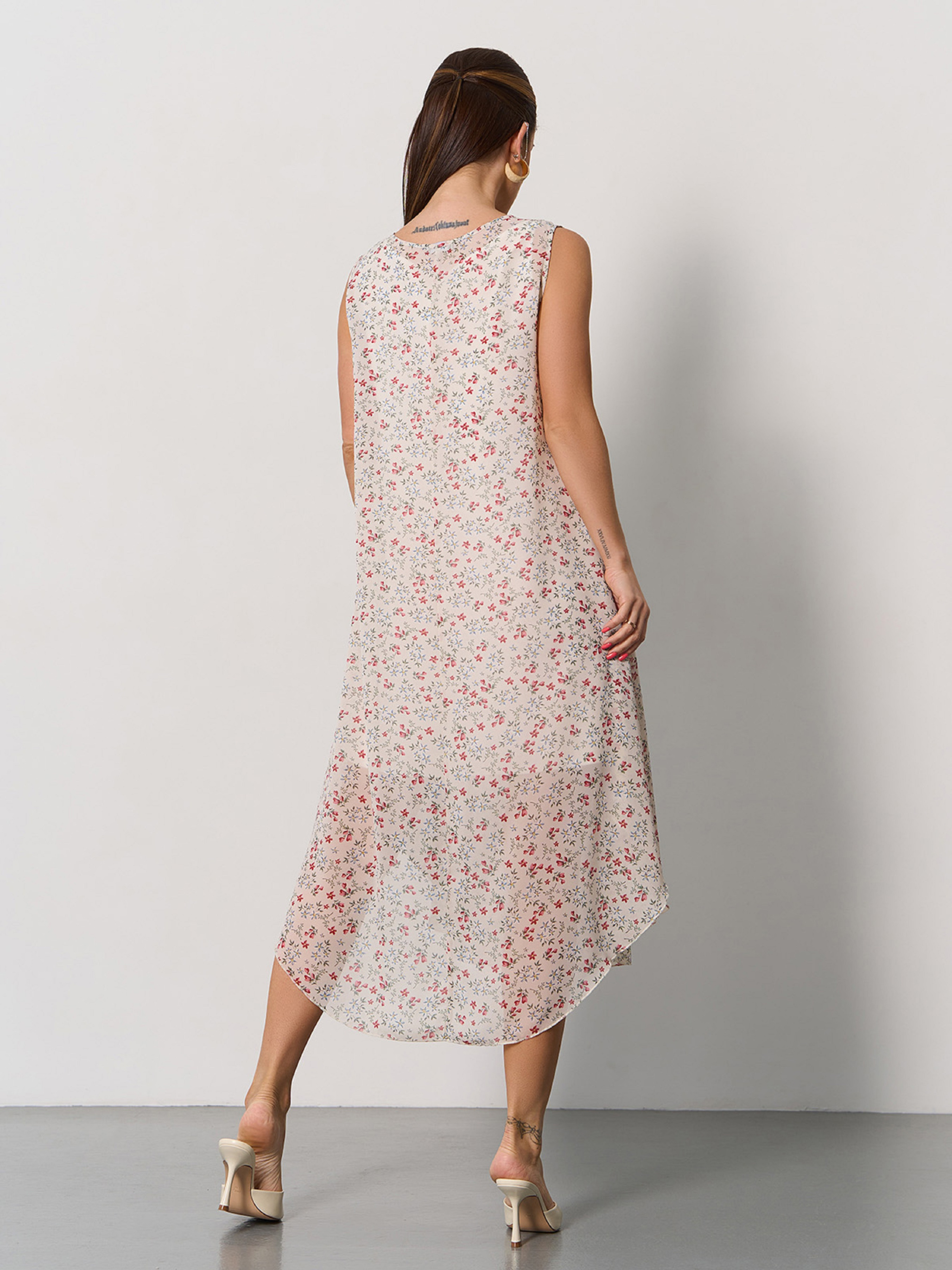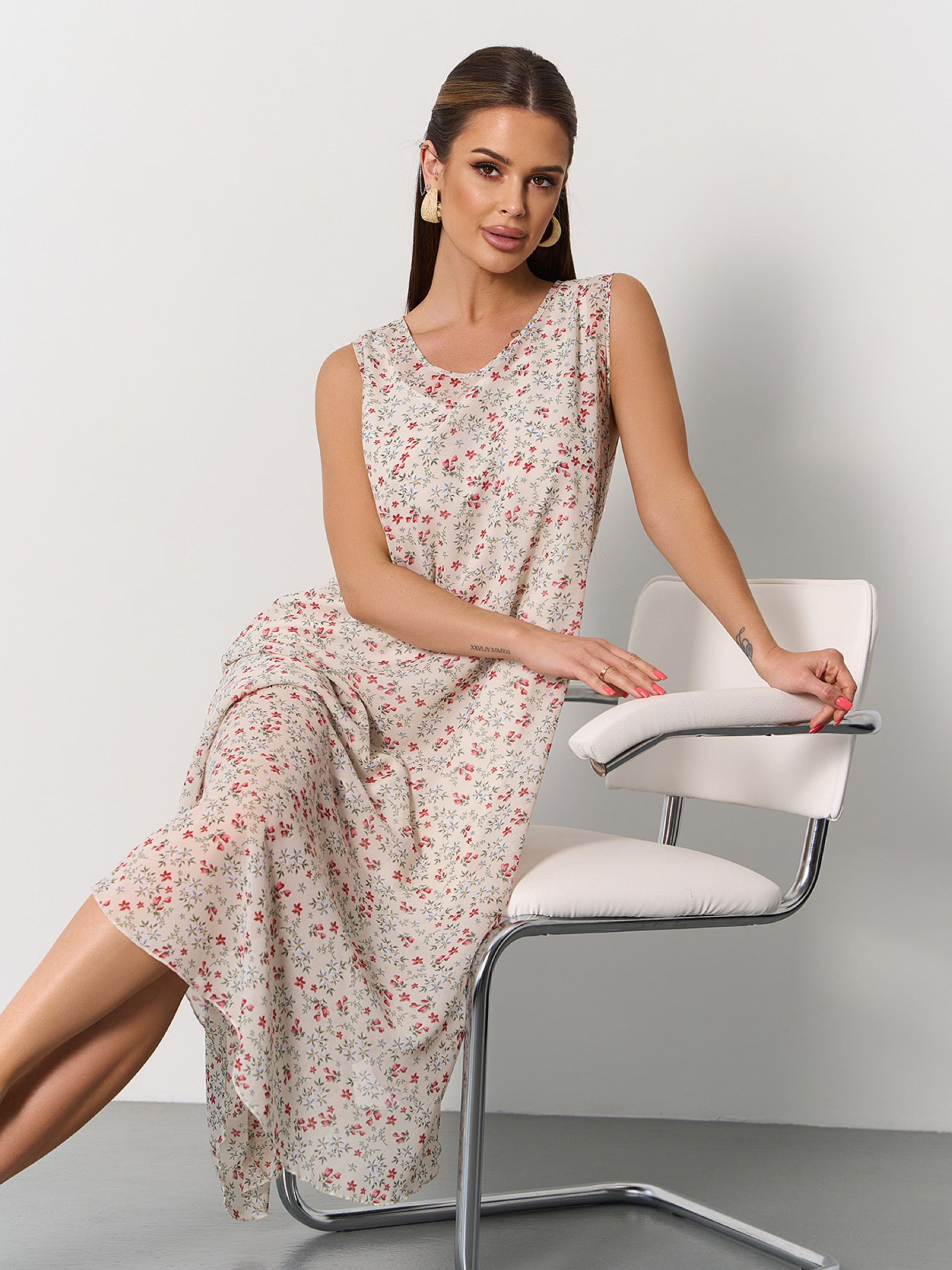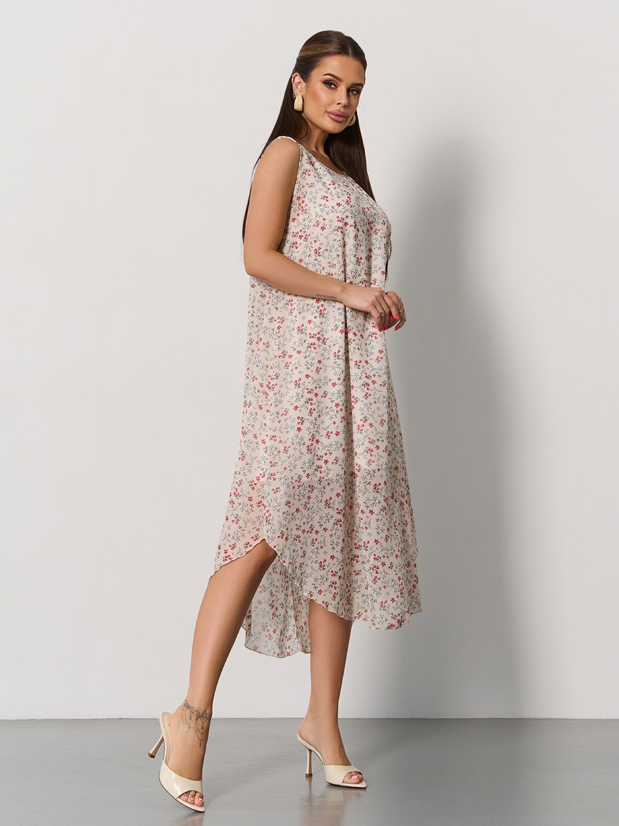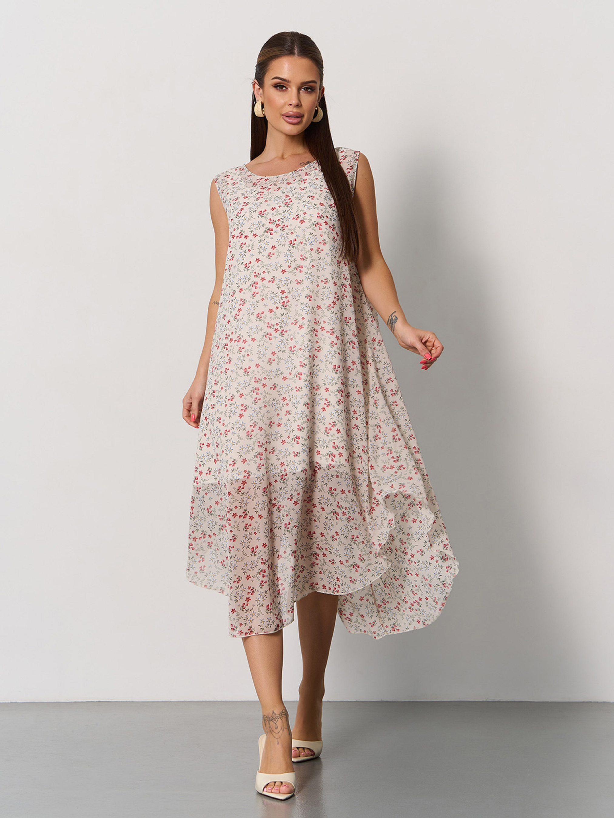 Цветочный сарафан без рукавов, выполненный из тонкого шифона с нижней укороченной комбинацией. Сарафан со свободным расклешенным кроем трапеции с асимметричной миди длиной. Полуобхват: Грудь: S (50), M (52), L (54), XL (56), Талия: S (54), M (56), L (58), XL (60), Бедра: S (59), M (61), L (63), XL (65), Длина изделия - 83/113, Ткань: Низкой эластичности. Состав: 59% полиэстер, 21% эластан, 20% хлопок
