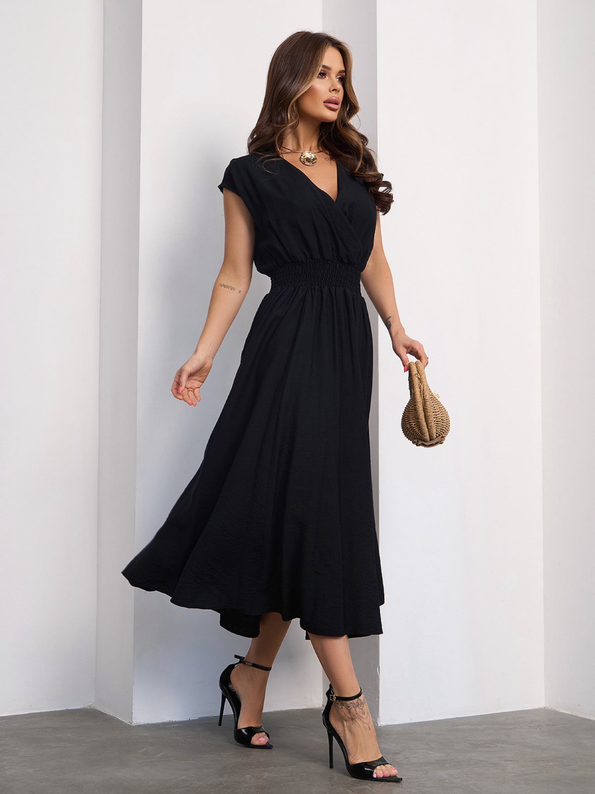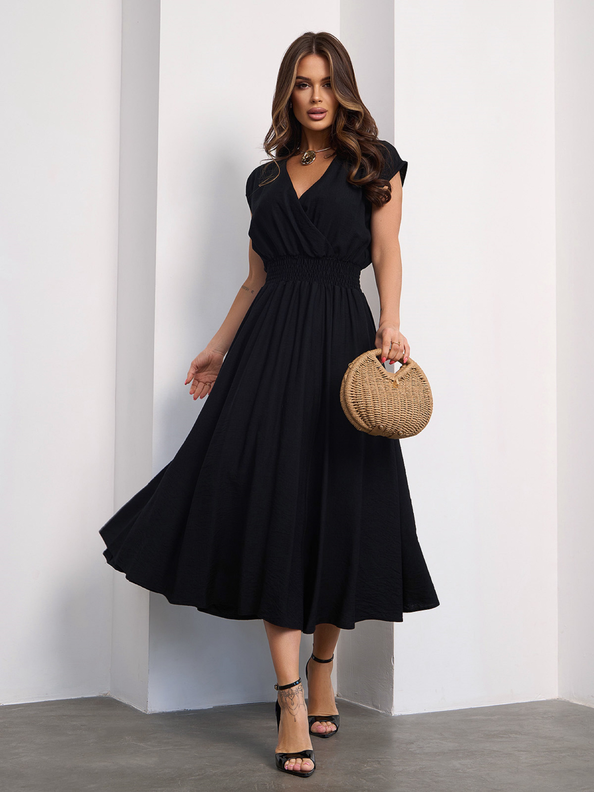 Черное льняное платье с декольте на запах. Платье с приспущенными проймами рукавов и эластичной резинкой на талии. Модель с расклешенным низом миди длины. Полуобхват: Грудь: S (37), M (38), L (40), XL (40), Талия: S (20-51), M (24-53), L (25-56), XL (24-56), Бедра: S (72), M (76), L (77), XL (79), Длина изделия – 111-115*, Ткань: Низкой эластичности.