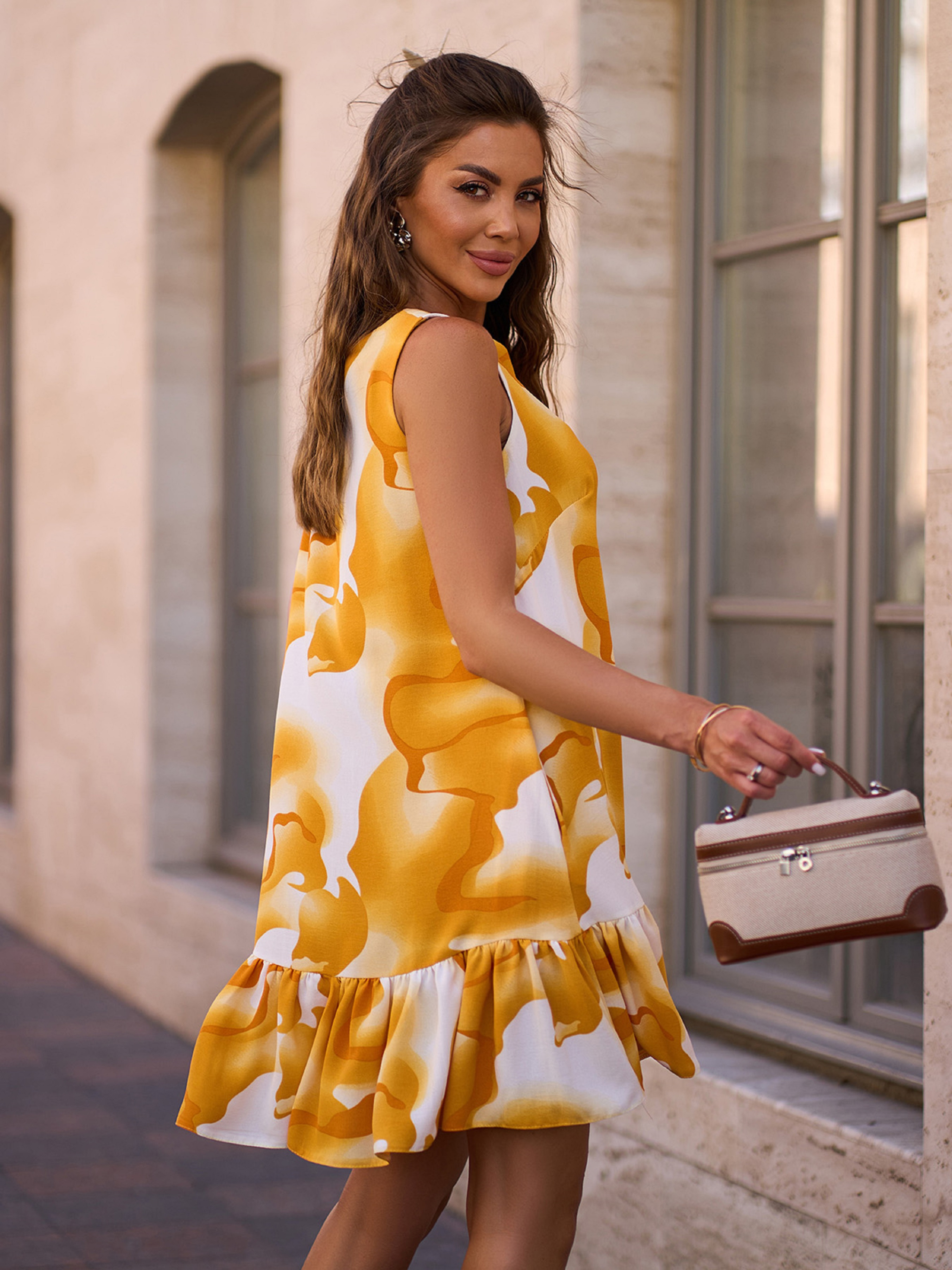 Желтое мини платье без рукавов с расклешенным свободным кроем трапеции. Модель выполнена из принтованного крепа и оснащена боковыми карманами и нижним легким воланом. Полуобхват: Грудь: S (47), M (49), L (51), XL (53), Талия: S (50), M (52), L (54), XL (56), Бедра: S (58), M (60), L (62), XL (64), Длина изделия - 84, Ткань: Низкой эластичности.