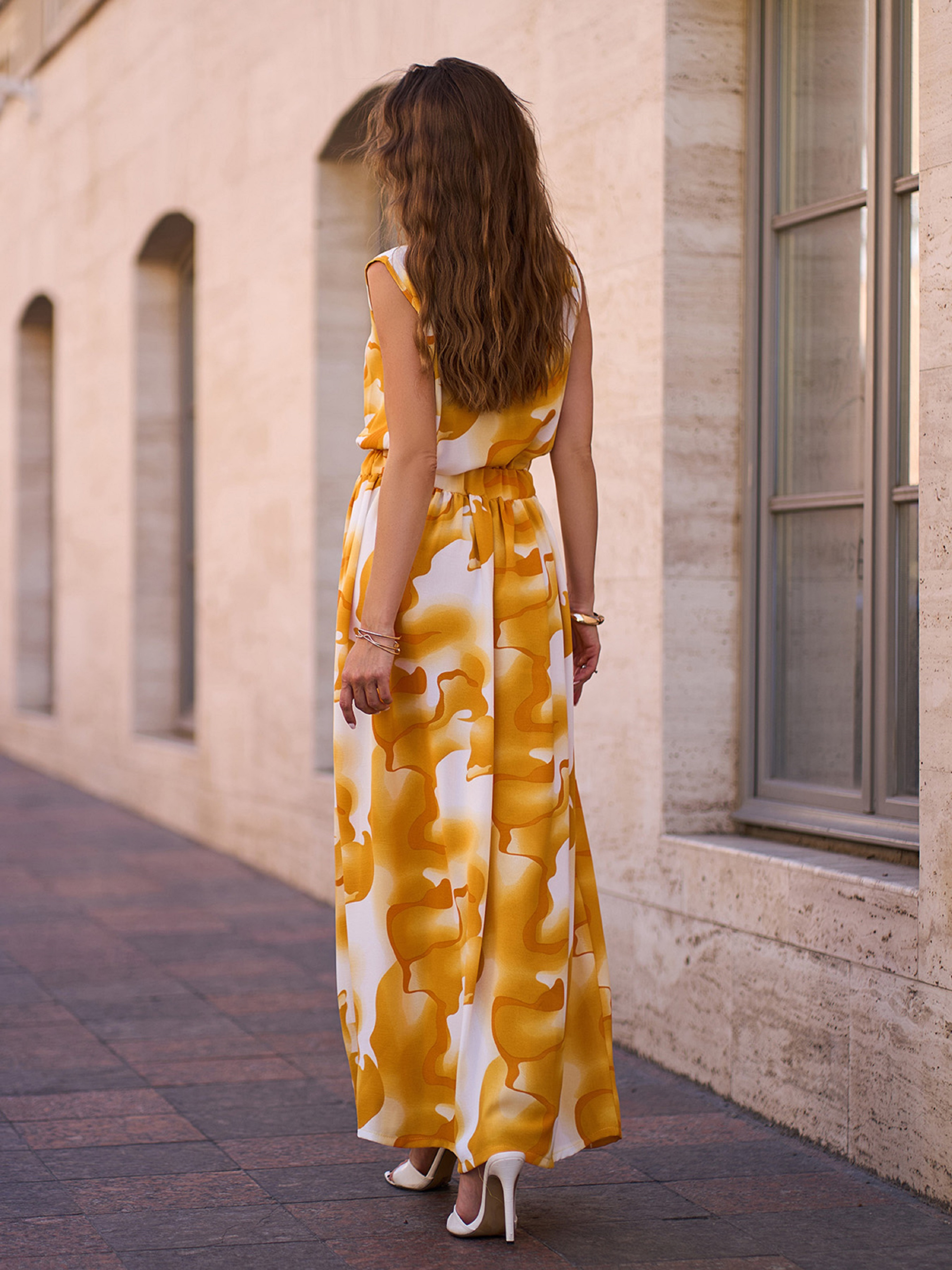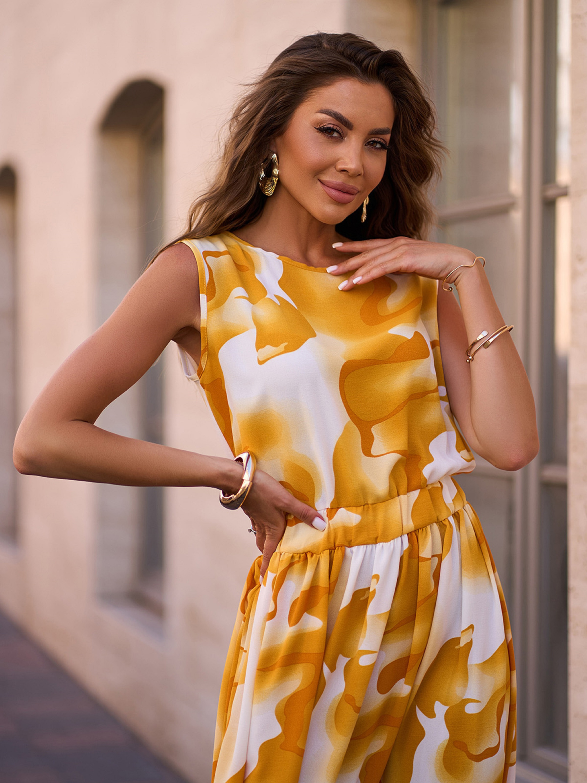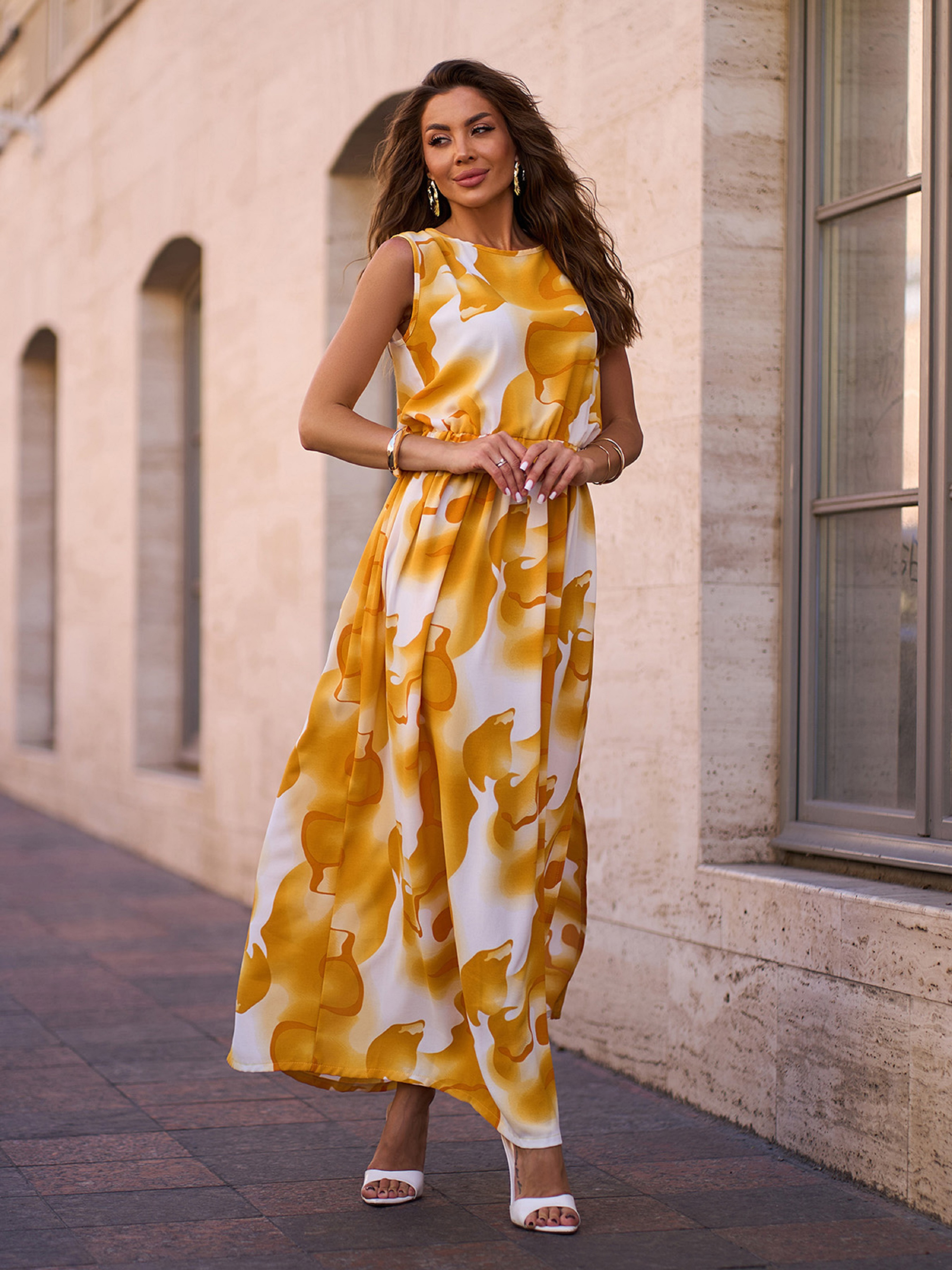 Длинный сарафан из яркого крепа в желтых тонах. Модель макси длины с закрытой горловиной, резинкой на талии и прямым кроем. Сарафан декорирован боковым разрезом. Полуобхват: Грудь: S (48), M (50), L (52), XL (54), Талия: S (32-42), M (34-44), L (36-46), XL (38-48), Бедра: S (66), M (68), L (70), XL (72), Длина изделия – 140, Ткань: Низкой эластичности.