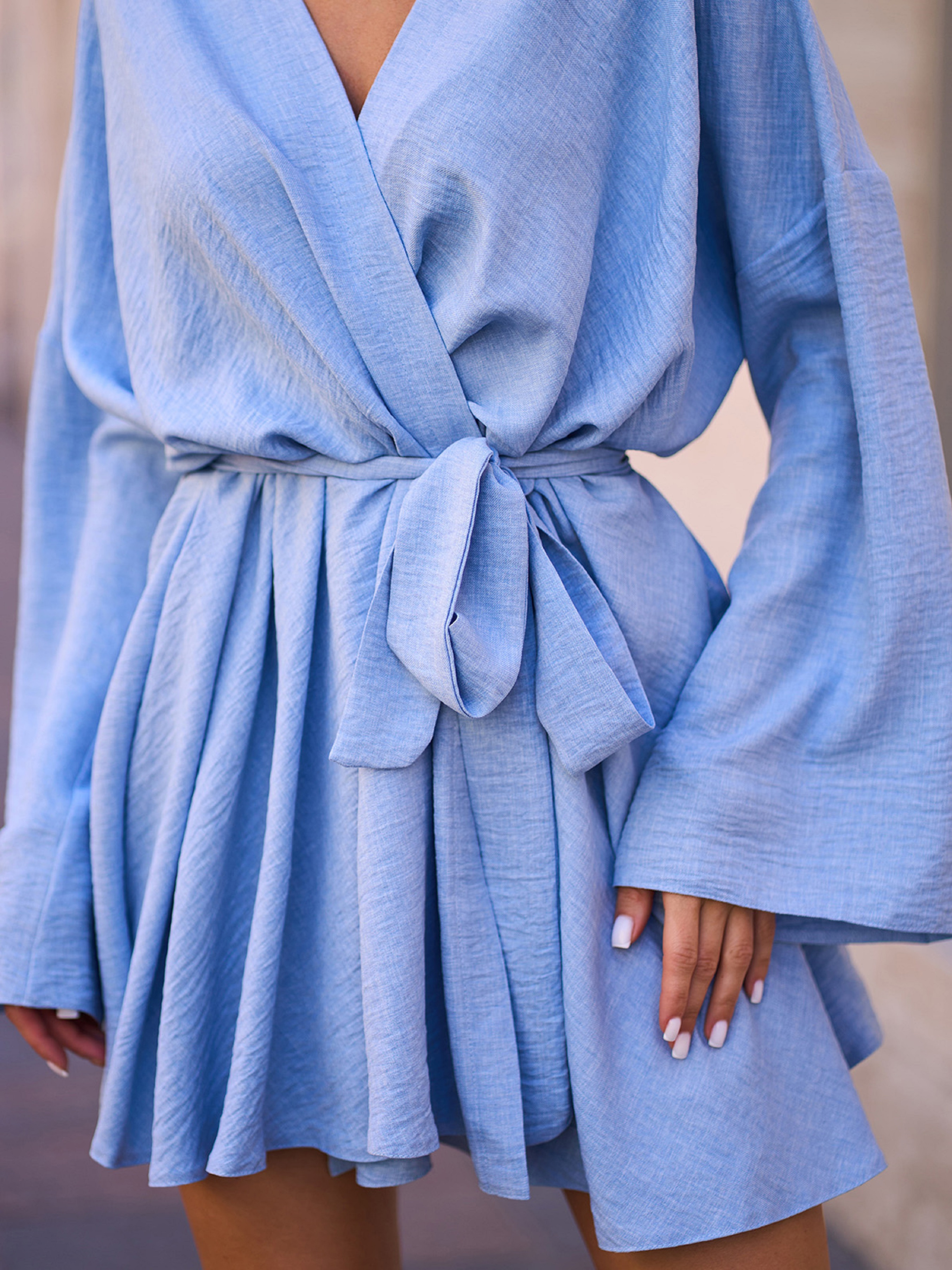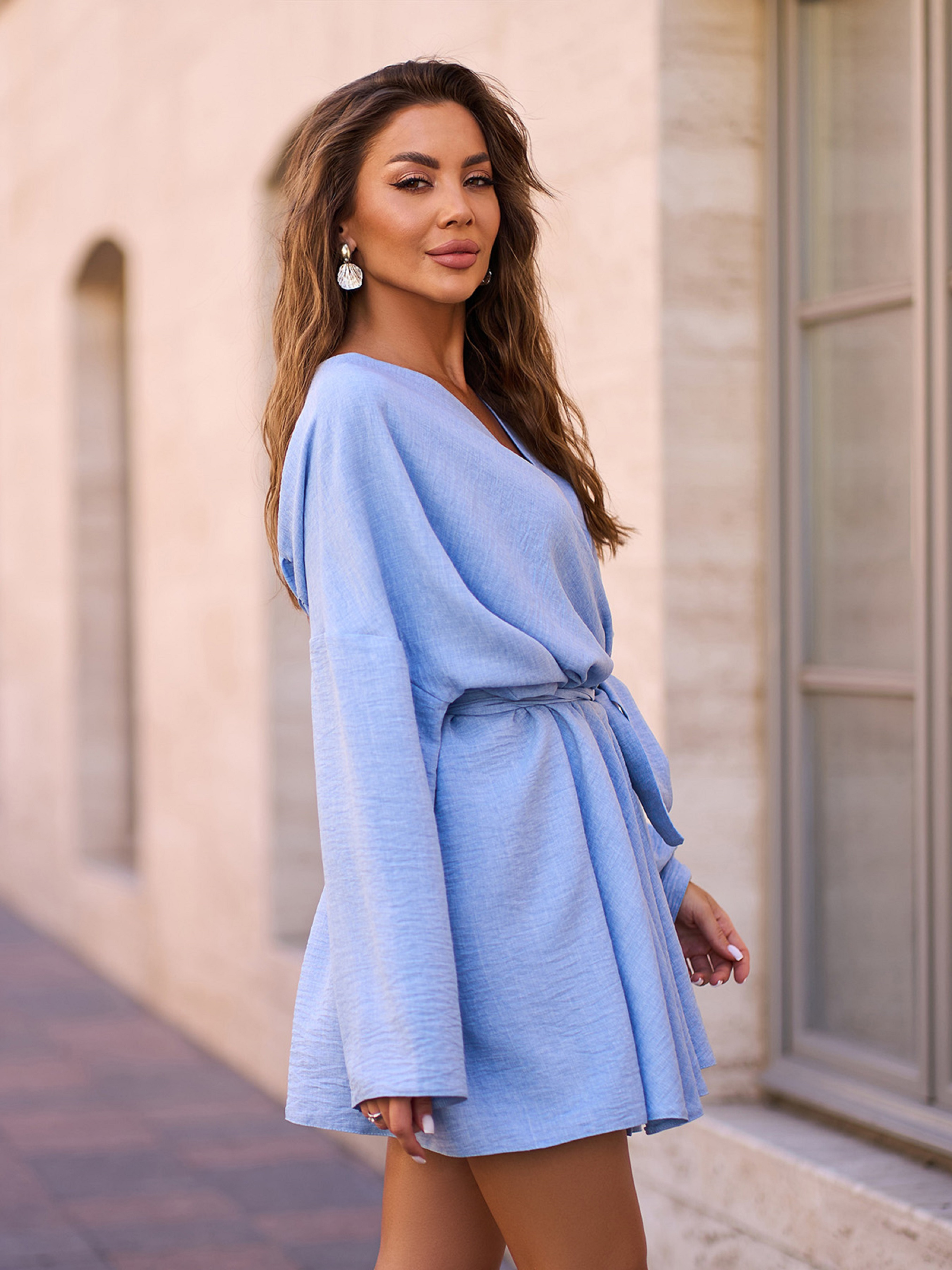 Молодежное оверсайз платье в стиле бохо из льна нежного голубого цвета. Модель кроя на запах с поясом и длинными рукавами-колокольчиками. Платье мини длины. Полуобхват: Грудь: S (82), M (84), L (86), XL (88), Талия: S (98), M (100), L (102), XL (104), Бедра: S (108), M (110), L (112), XL (114), Длина изделия - 82, Рукав - 42, Ткань: Низкой эластичности.