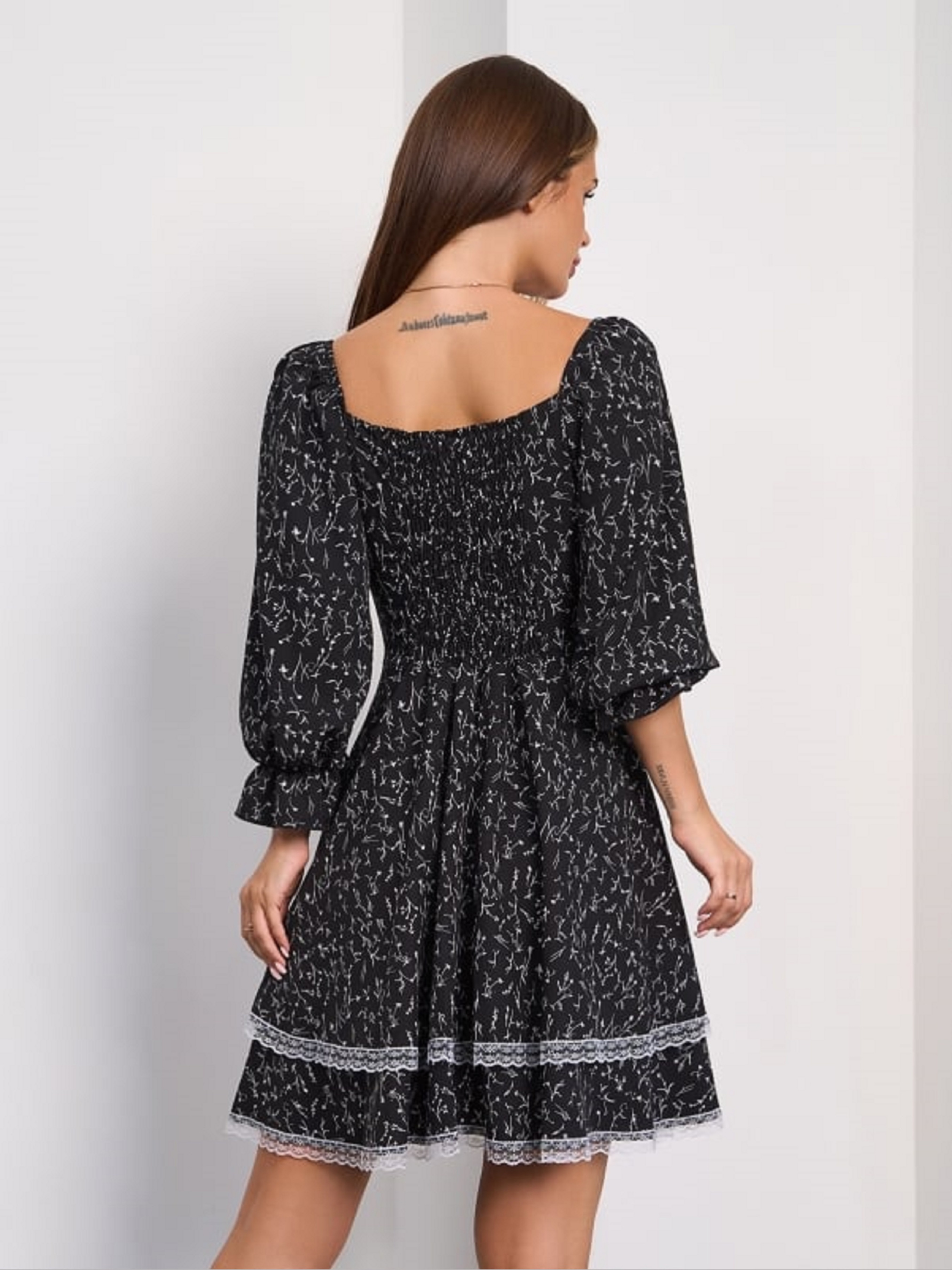 Черное ретро платье из принтованного софта с нежным кружевом. Модель с ярусным расклешенным низом длиной до колен и резинкой на спинке. Платье с объемными рукавами 3/4, декорированными рюшами и вырезом горловины каре на кулиске. . Полуобхват: Грудь: S (41), M (43), L (45), XL (47), Талия: S (34), M (36), L (38), XL (40), Бедра: S (58), M (60), L (62), XL (64), Длина изделия - 88, Рукав - 52, Ткань: Низкой эластичности.