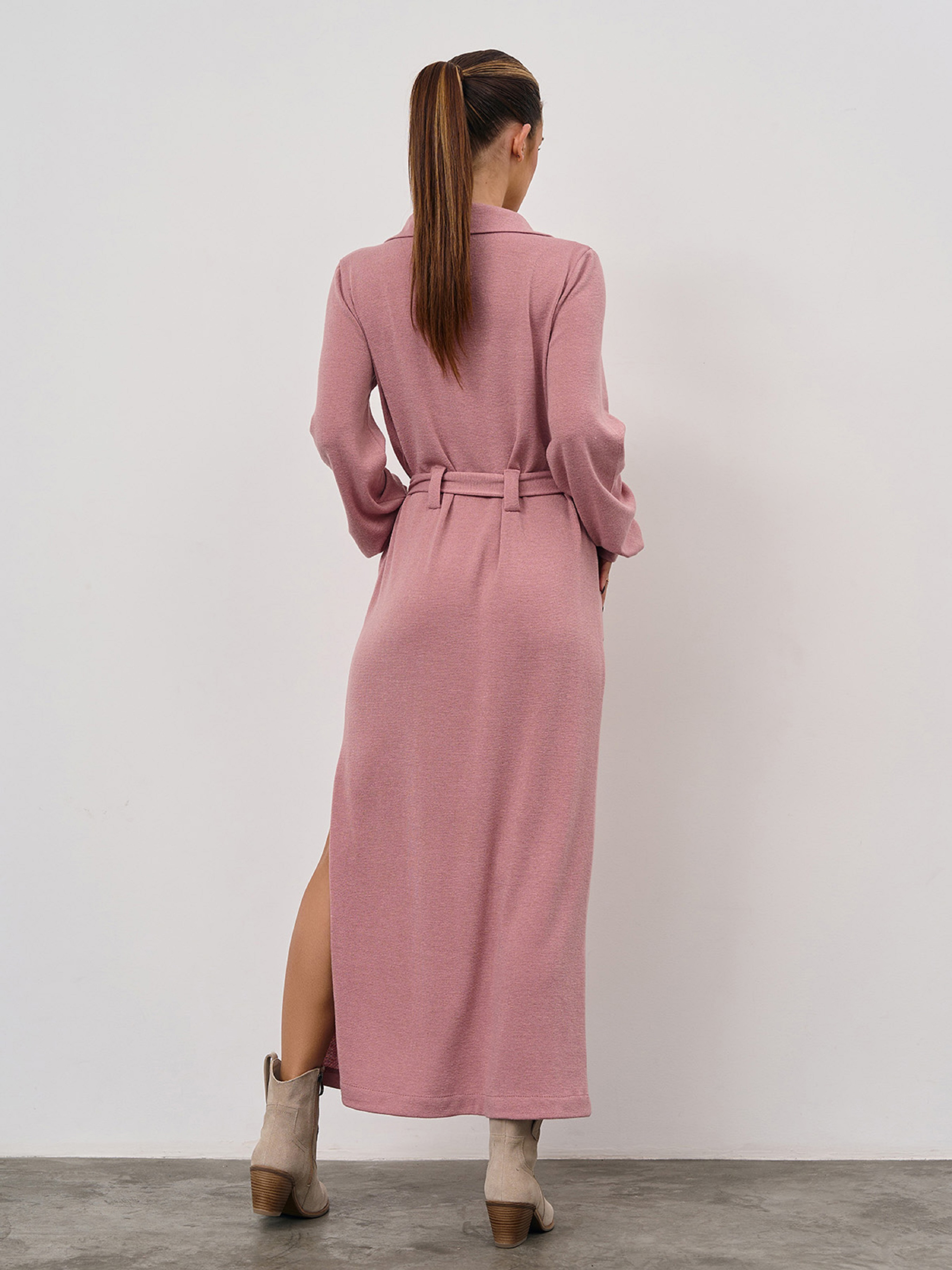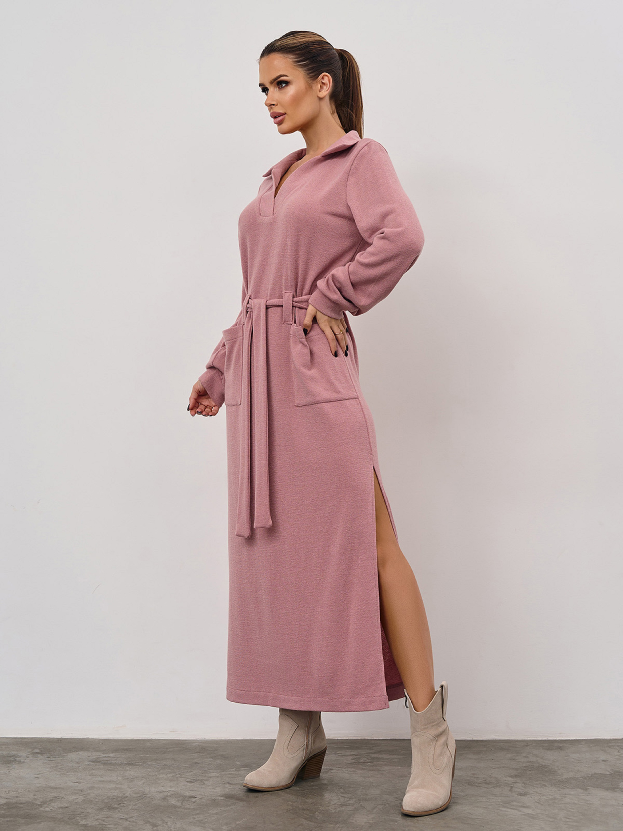 Розовое молодежное платье из трикотажной ангоры с длинными рукавами. Модель прямого кроя с V-образной горловиной и воротником. Модель макси длины с боковым разрезом, карманами и съемным поясом. . Полуобхват: Грудь: S (48), M (50), L (52), XL (54), XXL (56), 3XL (58), Талия: S (48), M (50), L (52), XL (54), XXL (56), 3XL (58), Бедра: S (48), M (50), L (52), XL (54), XXL (56), 3XL (58), Длина изделия - 130, Длина рукава - 63, Ткань: Высокой эластичности.
