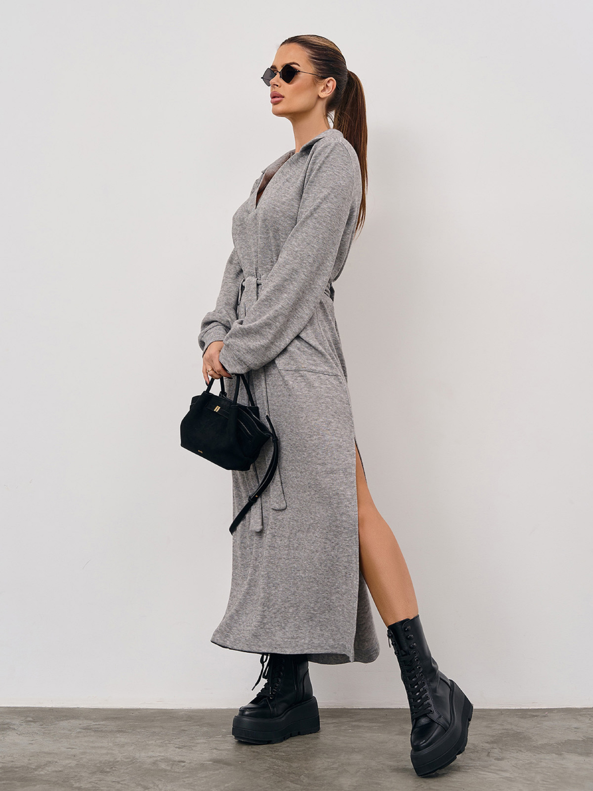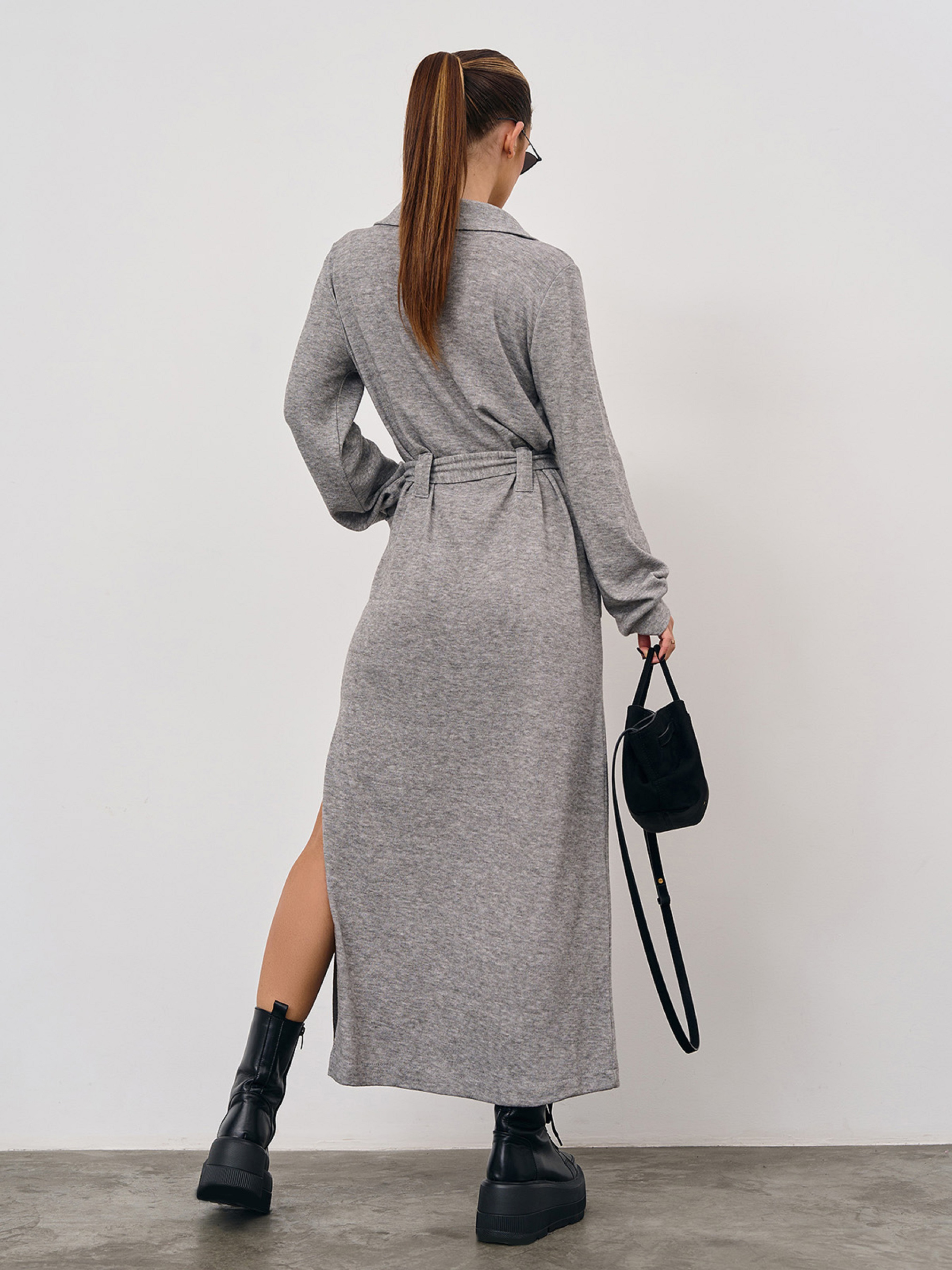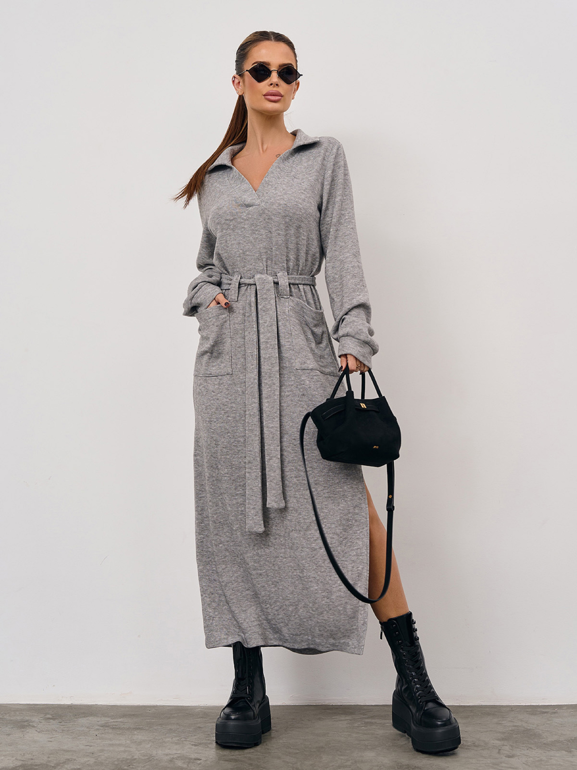 Серое платье из трикотажной ангоры с длинными рукавами. Модель прямого кроя с V-образной горловиной и воротником. Модель макси длины с боковым разрезом, карманами и съемным поясом на шлевках. Полуобхват: Грудь: S (48), M (50), L (52), XL (54), XXL (56), 3XL (58), Талия: S (48), M (50), L (52), XL (54), XXL (56), 3XL (58), Бедра: S (48), M (50), L (52), XL (54), XXL (56), 3XL (58), Длина изделия - 130, Длина рукава - 63, Ткань: Высокой эластичности.