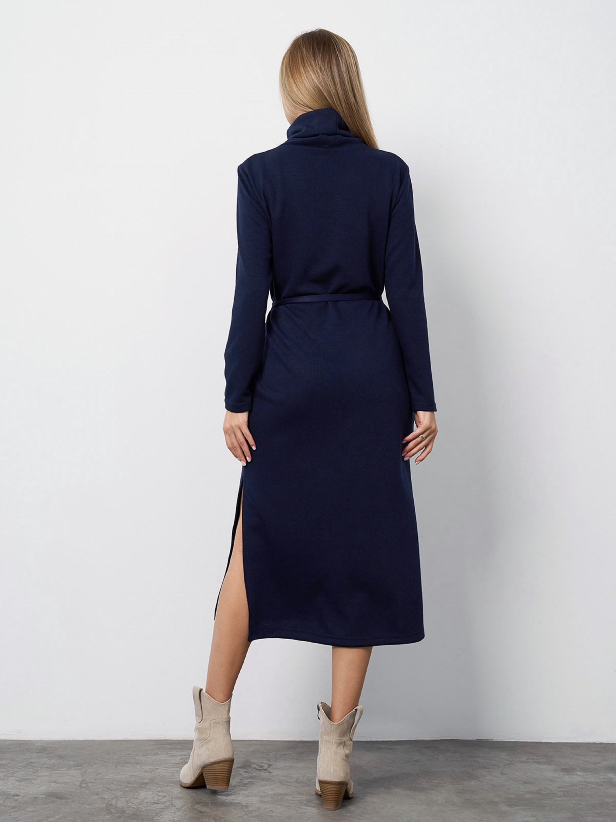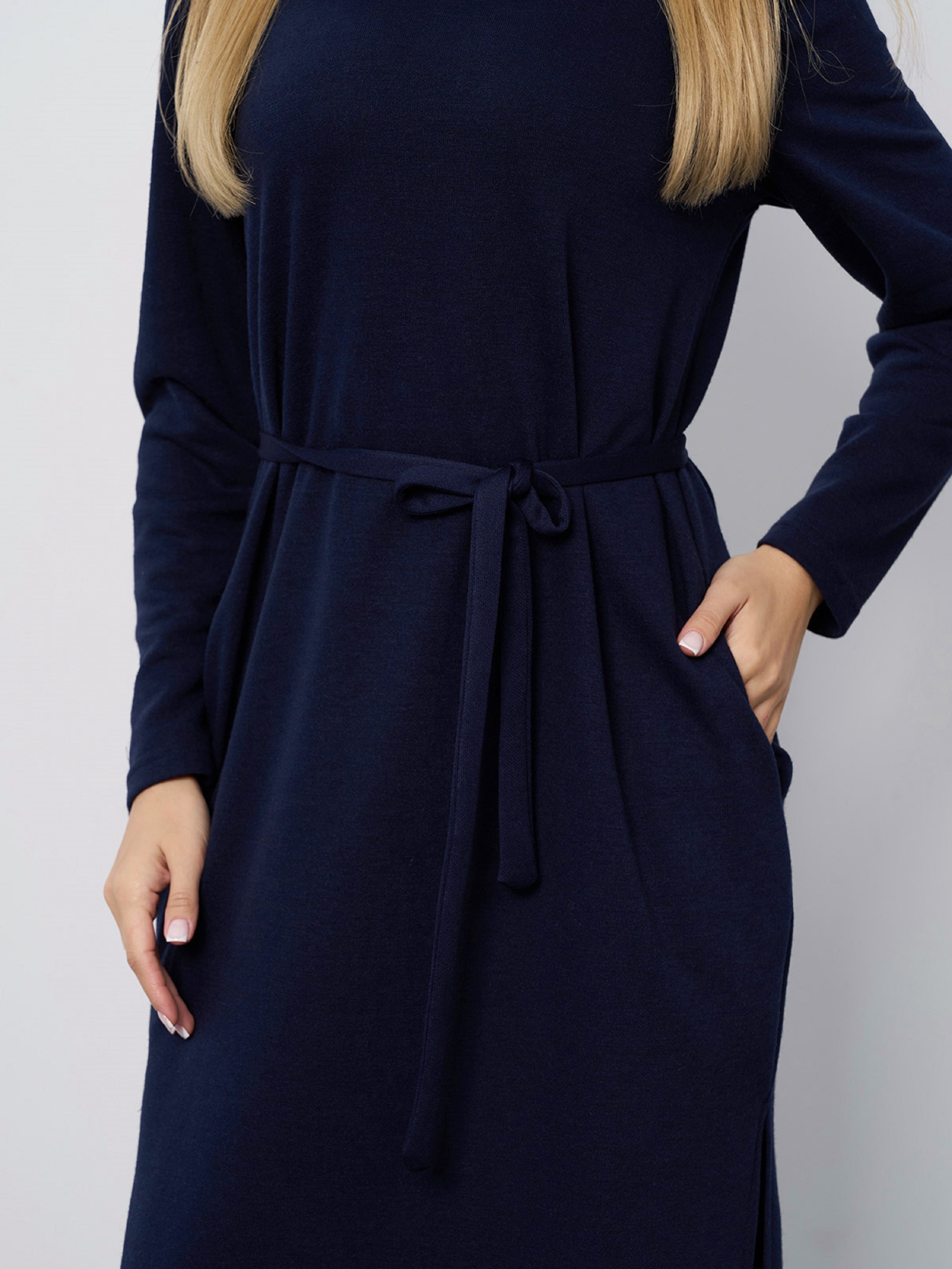Демисезонное платье-гольф с миди длиной и длинными рукавами, выполненное из ангорового трикотажа темно-синего цвета. Изделие прямого свободного кроя с высоким горлом. Платье с боковыми симметричными разрезами, карманами и съемным пояском. . Полуобхват: Грудь: S (49), M (51), L (53), XL (55), XXL (57), 3XL (59), Талия: S (49), M (51), L (53), XL (55), XXL (57), 3XL (59), Бедра: S (51), M (53), L (55), XL (57), XXL (59), 3XL (61), Длина изделия -110-117*, Рукав - 57, Ткань: Высокой эластичности.