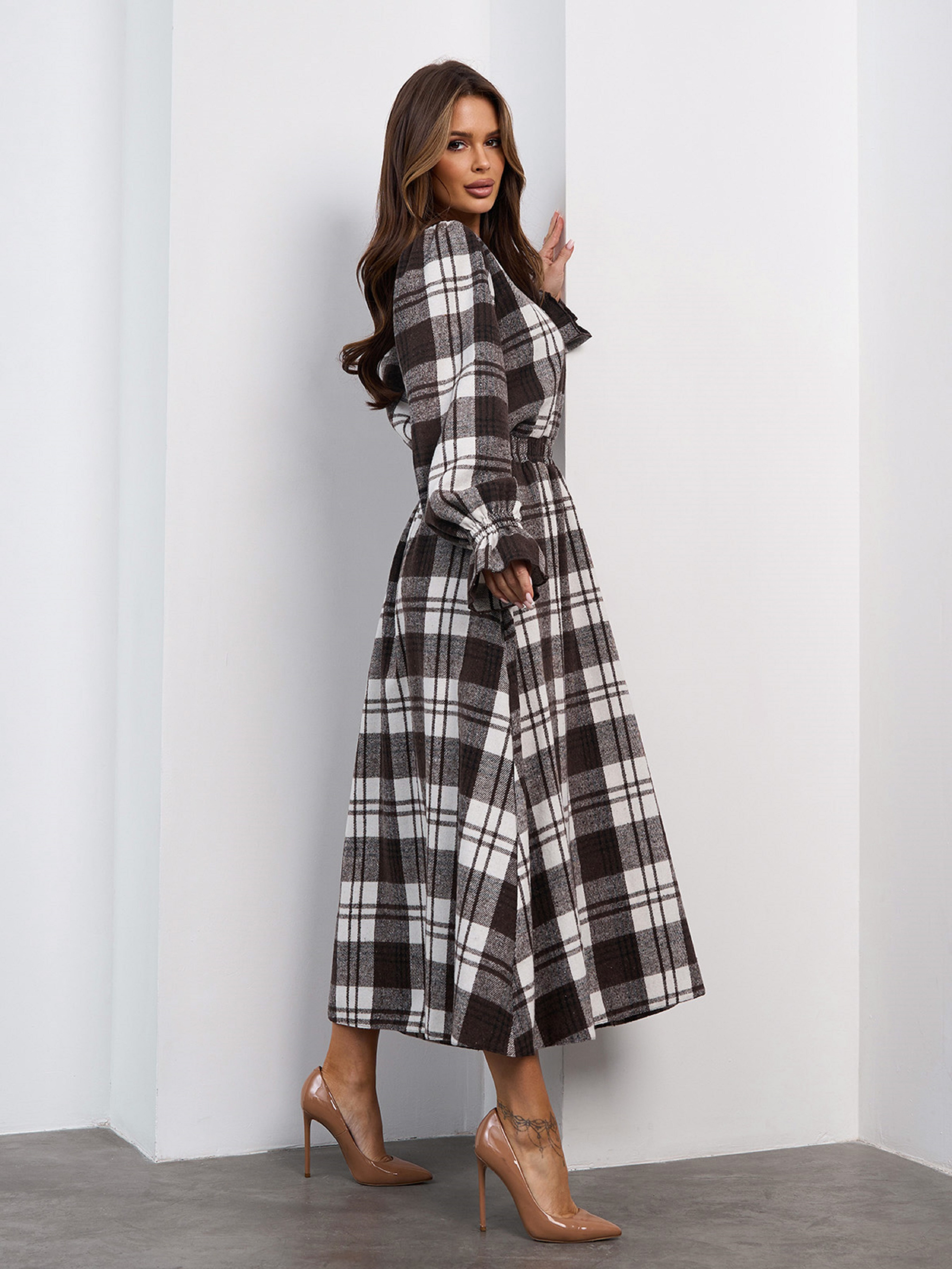Бело-коричневое утепленное платье из клетчатой шерсти. Платье макси длины с боковыми карманами и эластичной резинкой на талии. Модель на молнии, с закрытой горловиной и длинными рукавами с воланами. Полуобхват: Грудь: S (48), M (50), L (52), XL (54), Талия: S (30-40), M (32-42), L (34-44), XL (36-46), Бедра: S (64), M (66), L (68), XL (70), Длина изделия - 128, Рукав - 63, Ткань: Низкой эластичности.