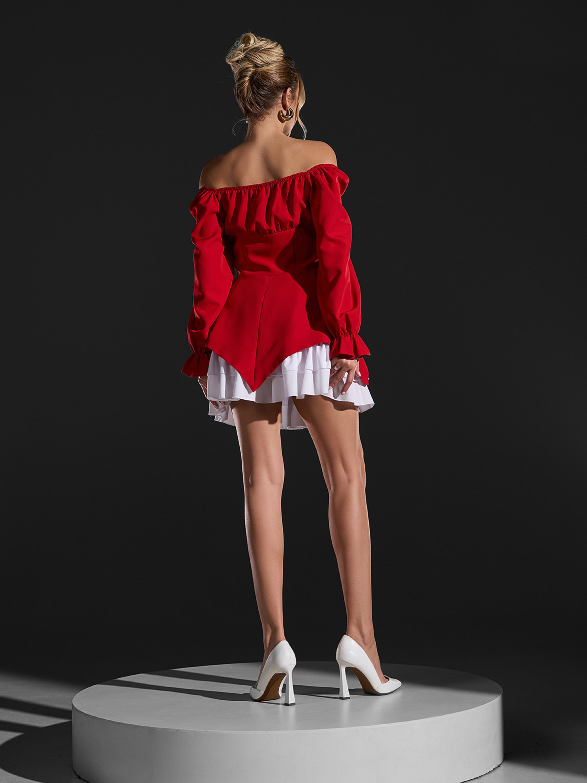 Красное ретро платье из плотной костюмки с нижним белым съемным подюбником. Модель с длинными рукавами, декорированными воланами. Платье на пуговицах с асимметричной баской и лифом на кулиске. Полуобхват: Грудь: S (42), M (44), L (46), XL (48), Талия: S (36), M (38), L (40), XL (42), Бедра: S (55), M (57), L (59), XL (61), Длина изделия - 82, Рукав - 60, Ткань: Низкой эластичности.