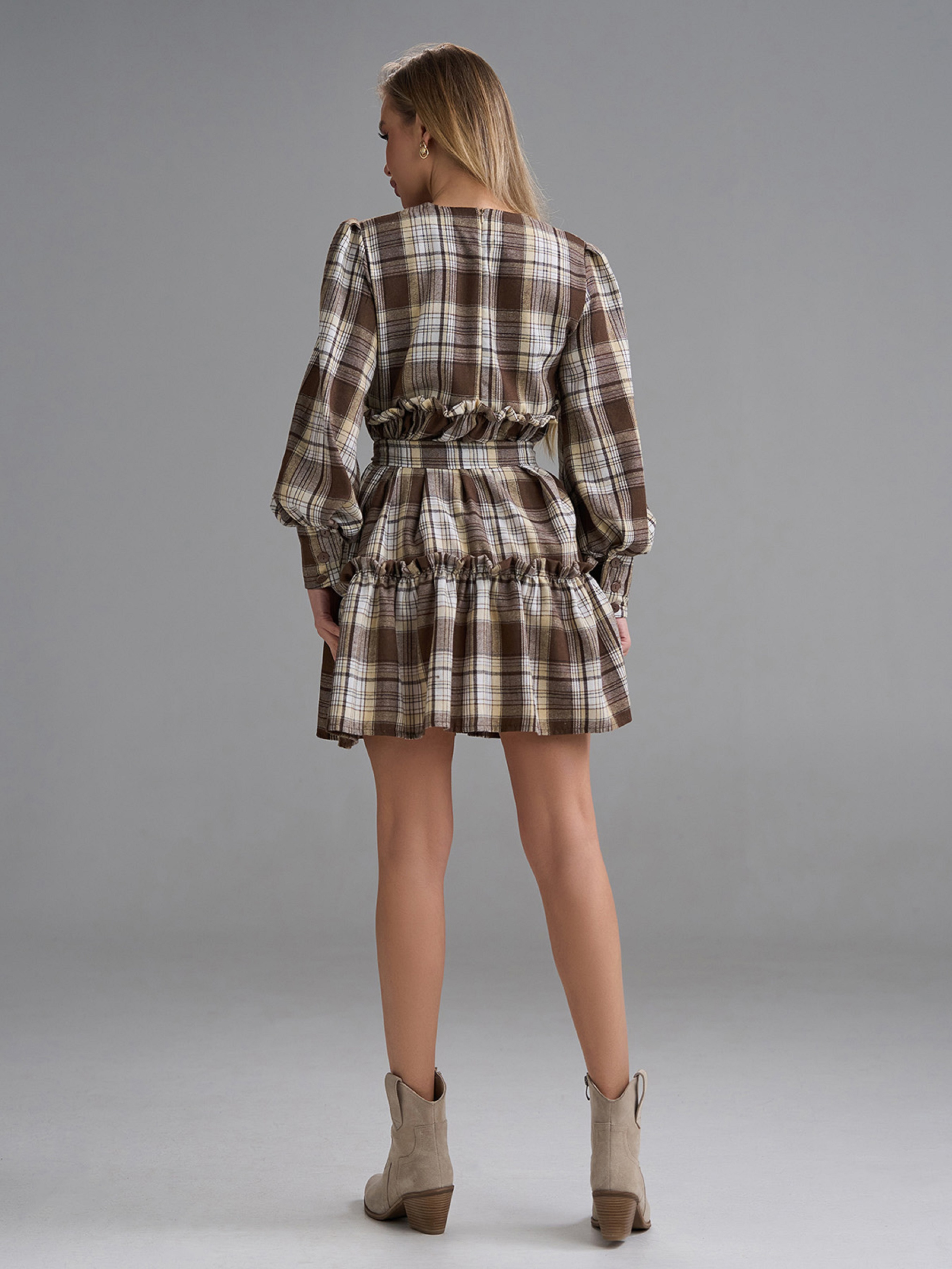 Коричнево-бежевое байковое платье-трапеция в стиле беби дол с ярусными воланами и рюшами. Платье расклешенного свободного кроя с длиной выше колен и длинными объемными рукавами на манжетах. Платье с полукруглой горловиной и съемным пояском. Полуобхват: Грудь: S (46), M (48), L (50), XL (52), Талия: S (46), M (48), L (50), XL (52), Бедра: S (63), M (65), L (67), XL (69), Длина изделия - 85, Рукав - 62, Ткань: Низкой эластичности