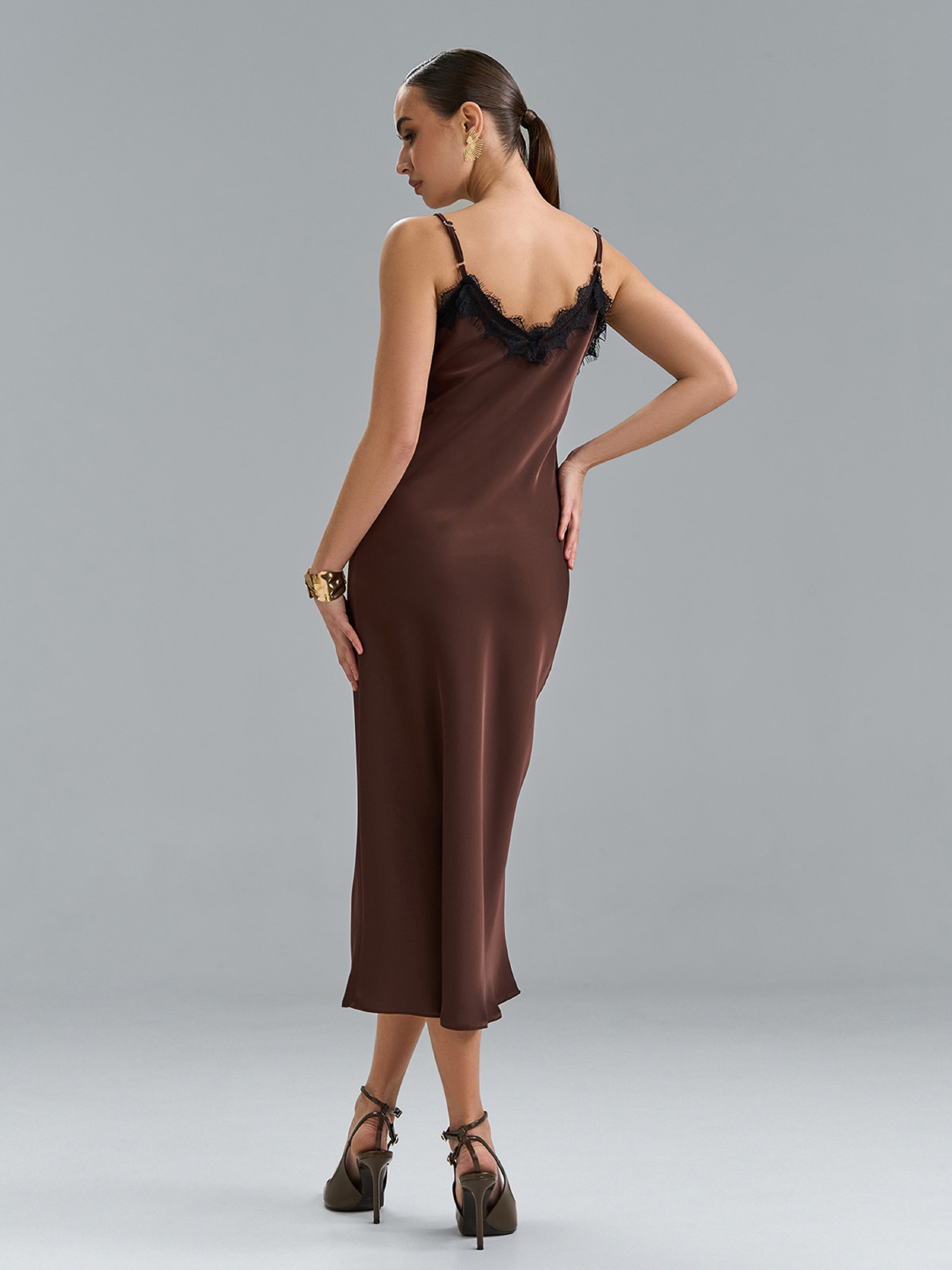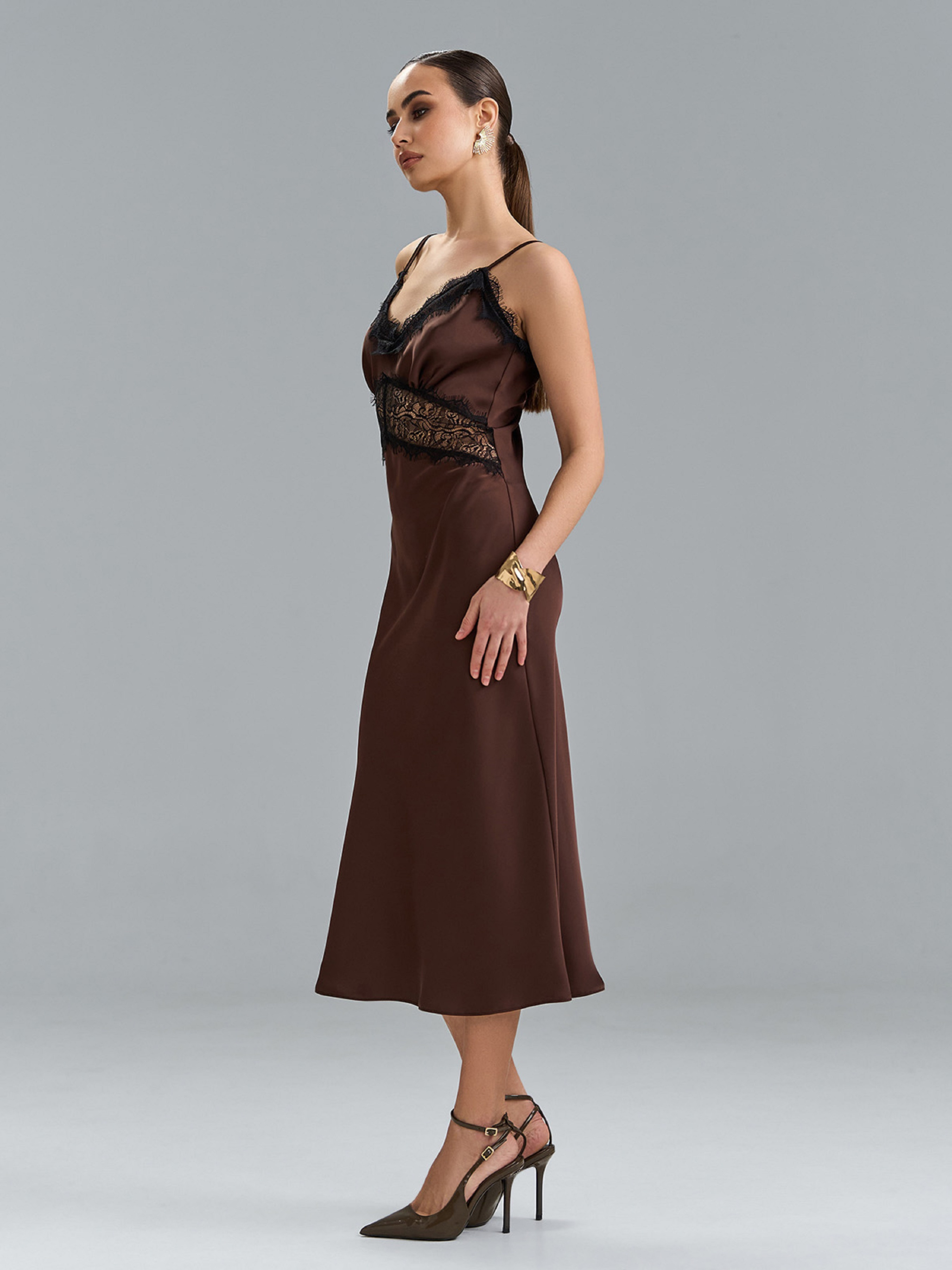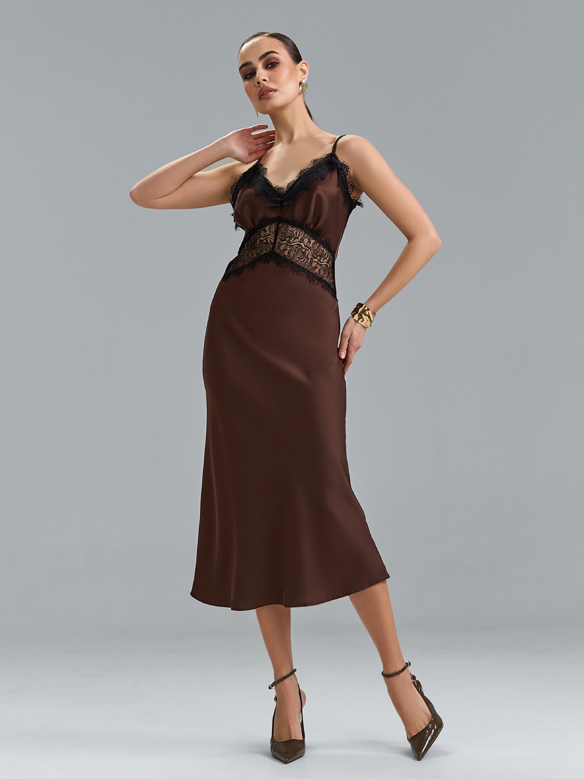 Темно-коричнева ретро сукня-комбінація, виконана з дабл шовку з французьким мереживом. Сукня облягаючого крою в стилі годе міді завдовжки. Модель на регульованих бретельках з V-подібною проймою горловини. Напівобхват: Грудь: S (43), M (45), L (47), XL (49), Талія: S (38), M (40), L (42), XL (44), Стегна: S (46), M (48), L (50), XL (52), Довжина виробу - 120, Тканина: Низької еластичності.