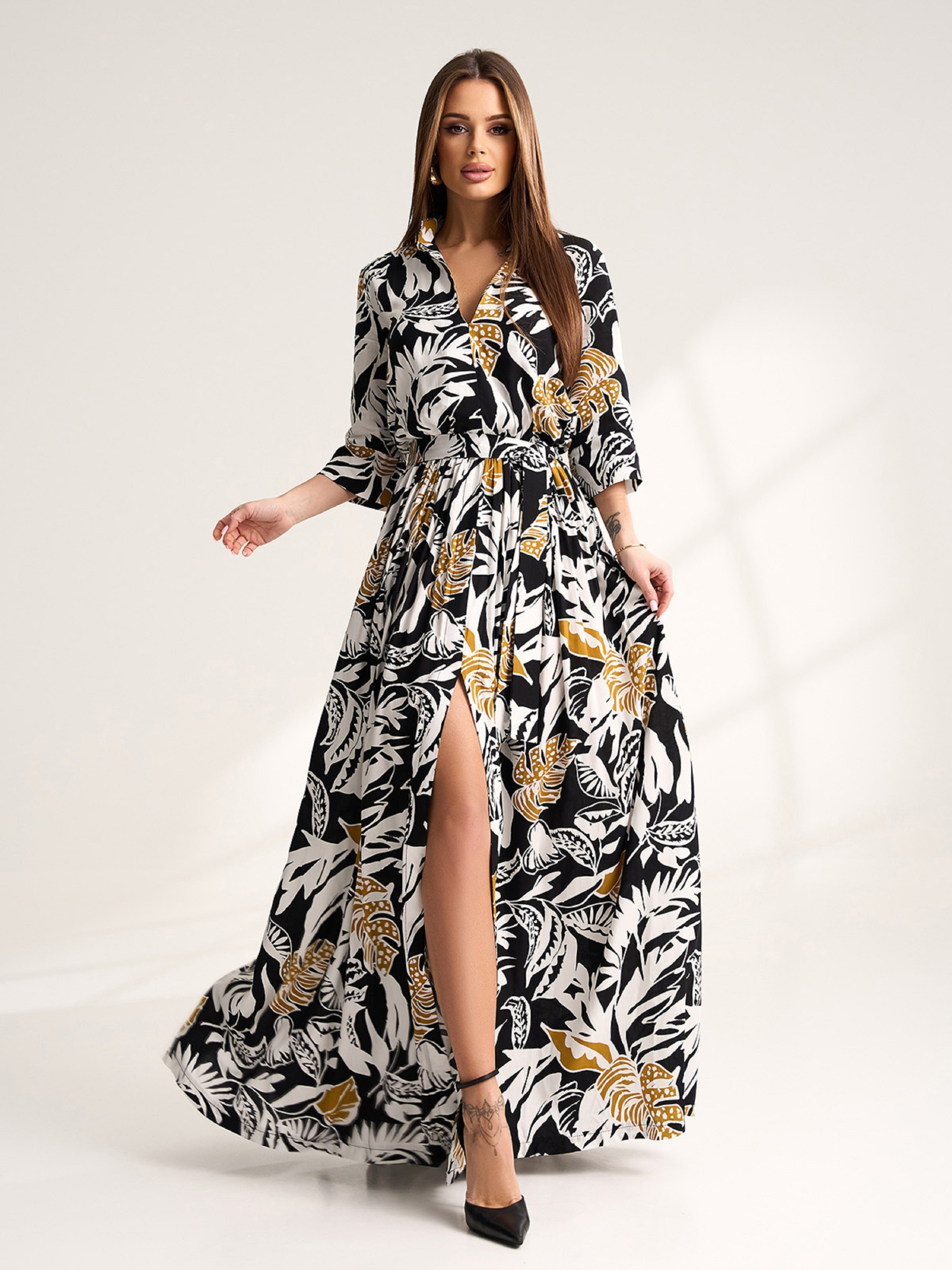 Длинное платье с рукавами 3/4, выполненное из принтованного хлопкового штапеля. Платье с расклешенной летящей юбкой с разрезом и карманами. Модель с резинкой на талии, съемным поясом и V-образной горловиной с воротником. Полуобхват: Грудь: S (45), M (47), L (49), XL (51), XXL (53), 3XL (55), Талия: S (26-36), M (28-38), L (30-40), XL (32-42), XXL (34-44), 3XL (36-46), Бедра: S (82), M (84), L (86), XL (88), XXL (90), 3XL (92), Длина изделия - 145, Рукав - 36, Ткань: Низкой эластичности.