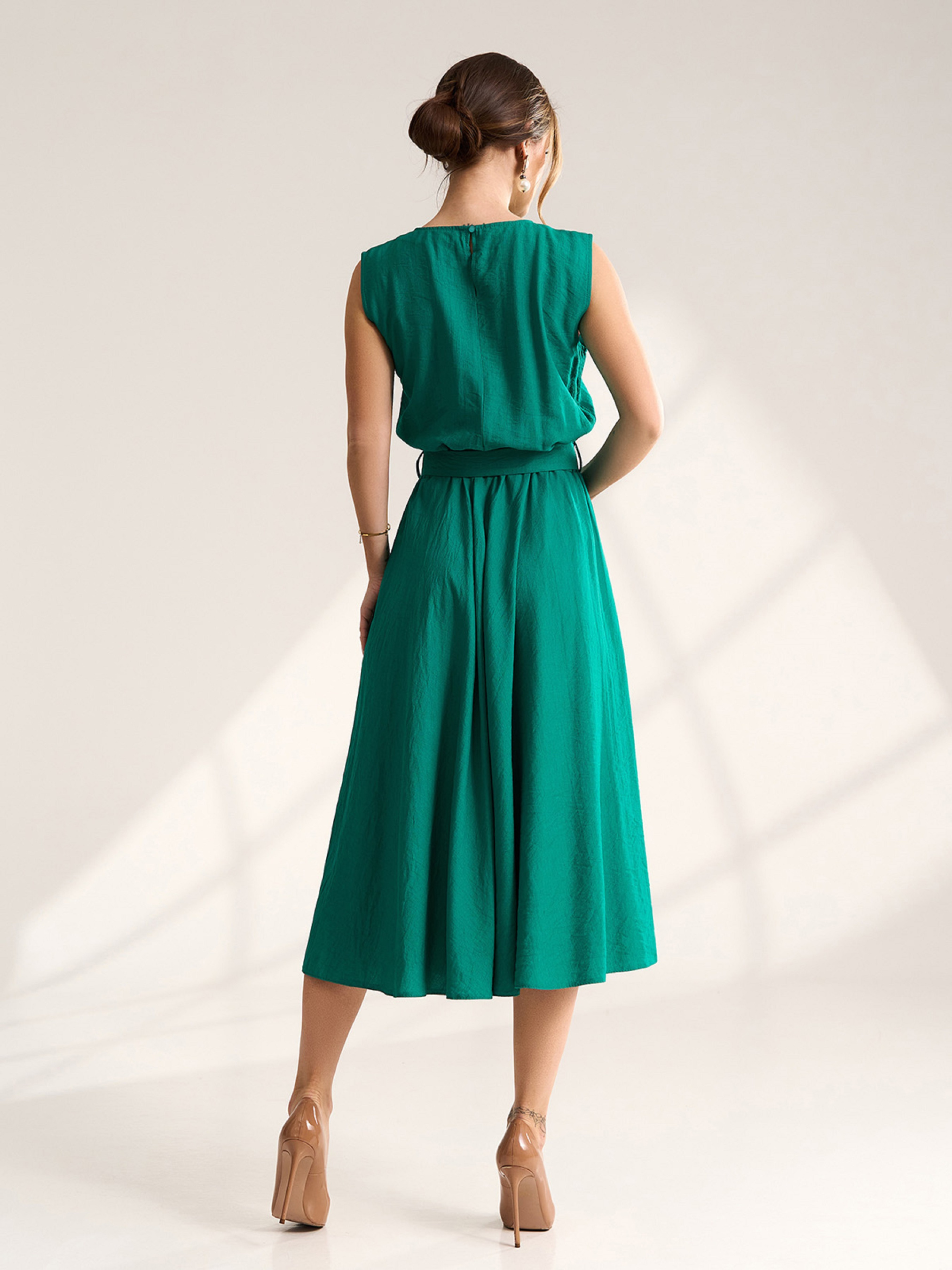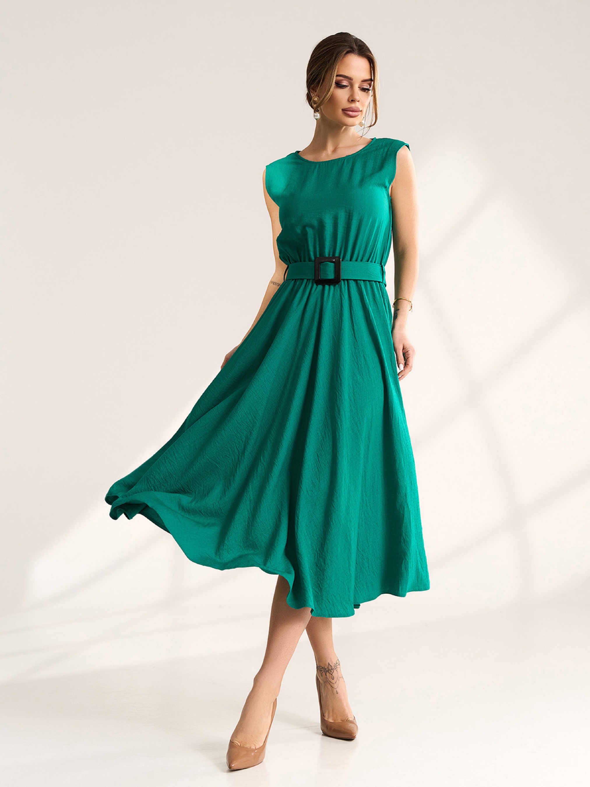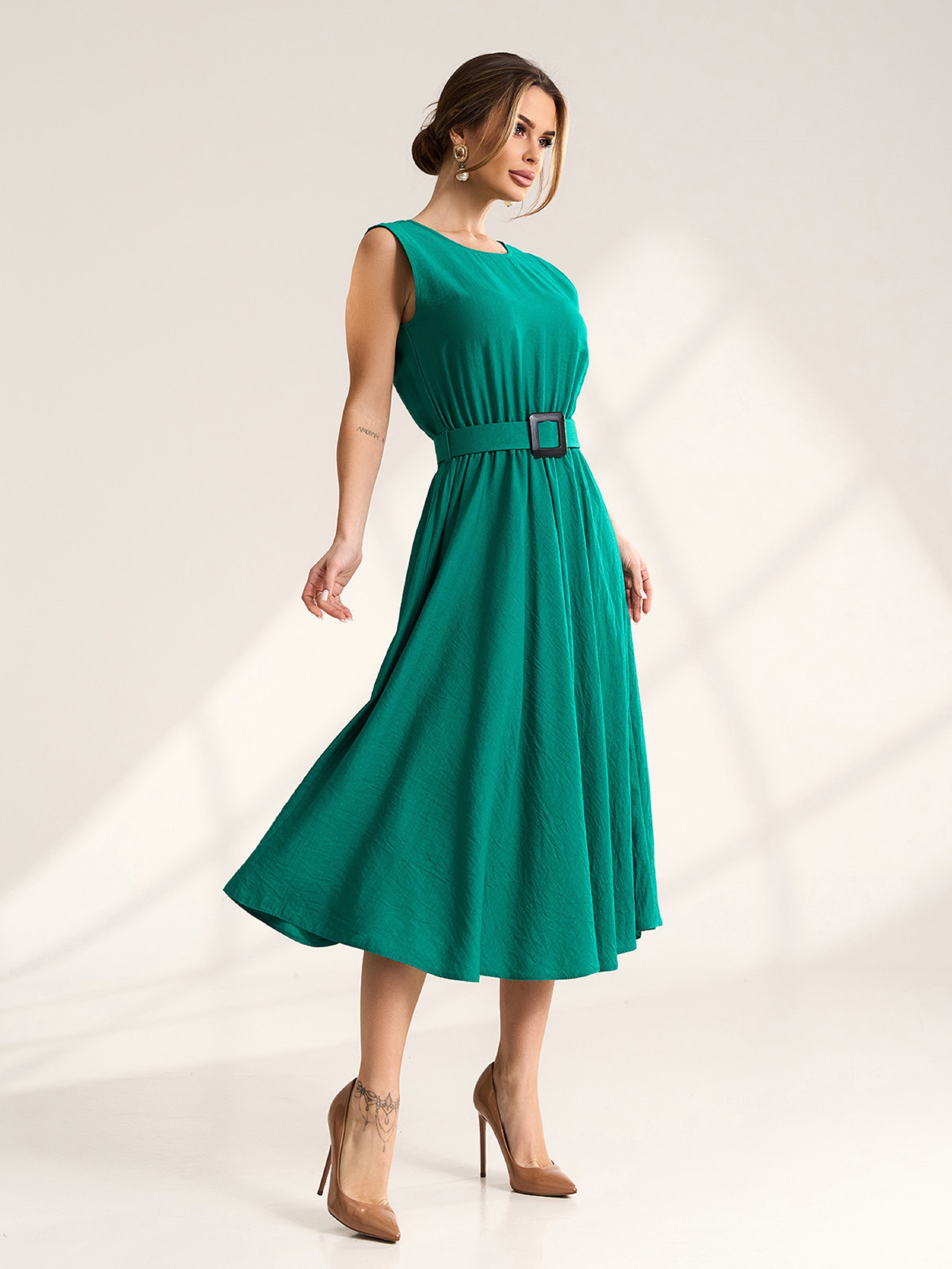 Элегантное платье без рукавов, выполненное из текстурированного льна зеленого цвета. Платье классического приталенного кроя с расклешенным низом миди длины. Модель с резинкой на талии и съемным поясом. Полуобхват: Грудь: S (47), M (49), L (51), XL (53), Талия: S (31-41), M (33-43), L (35-44), XL (37-46), Бедра: S (70), M (72), L (74), XL (76), Длина изделия - 119, Ткань: Низкой эластичности.