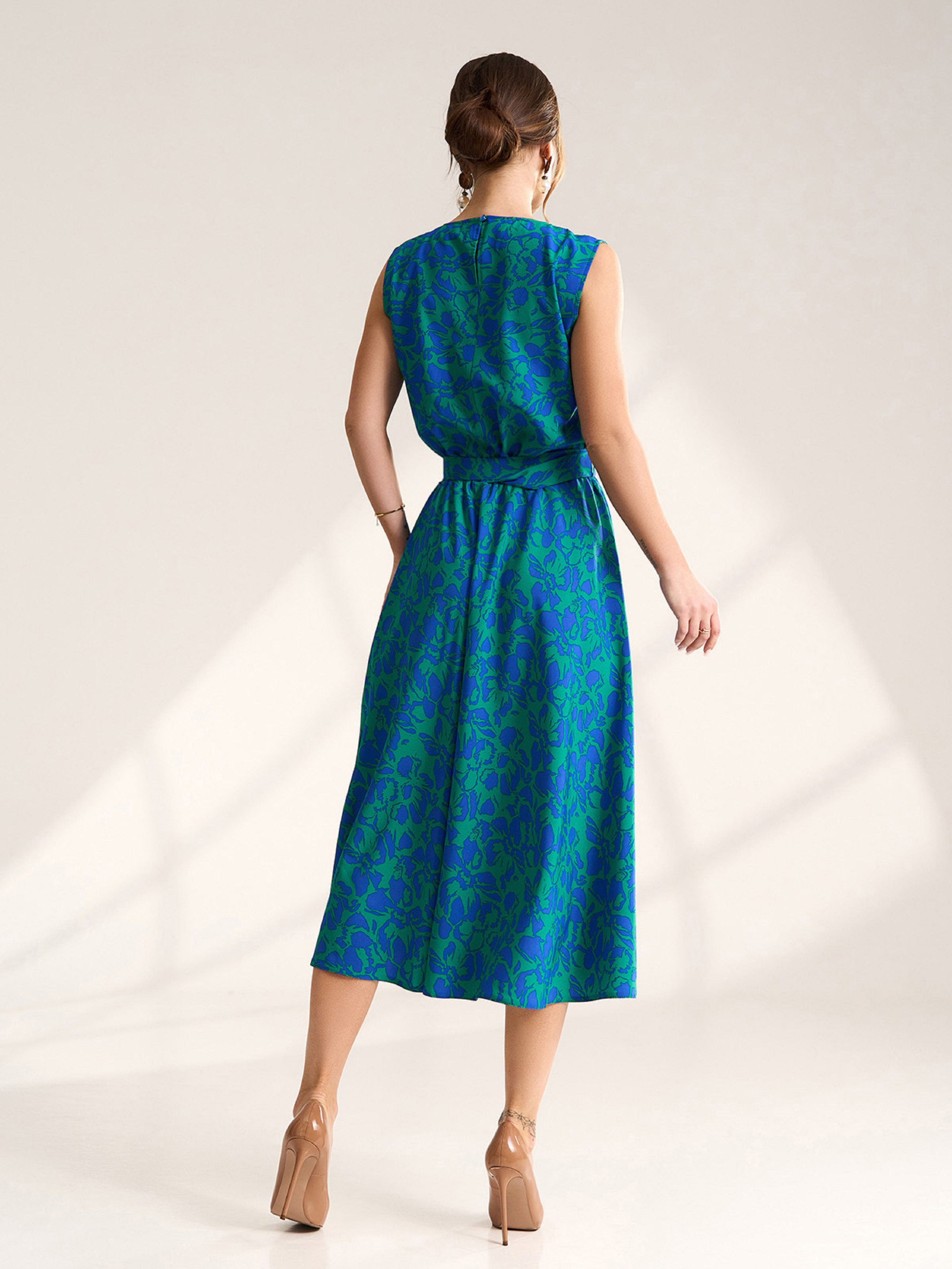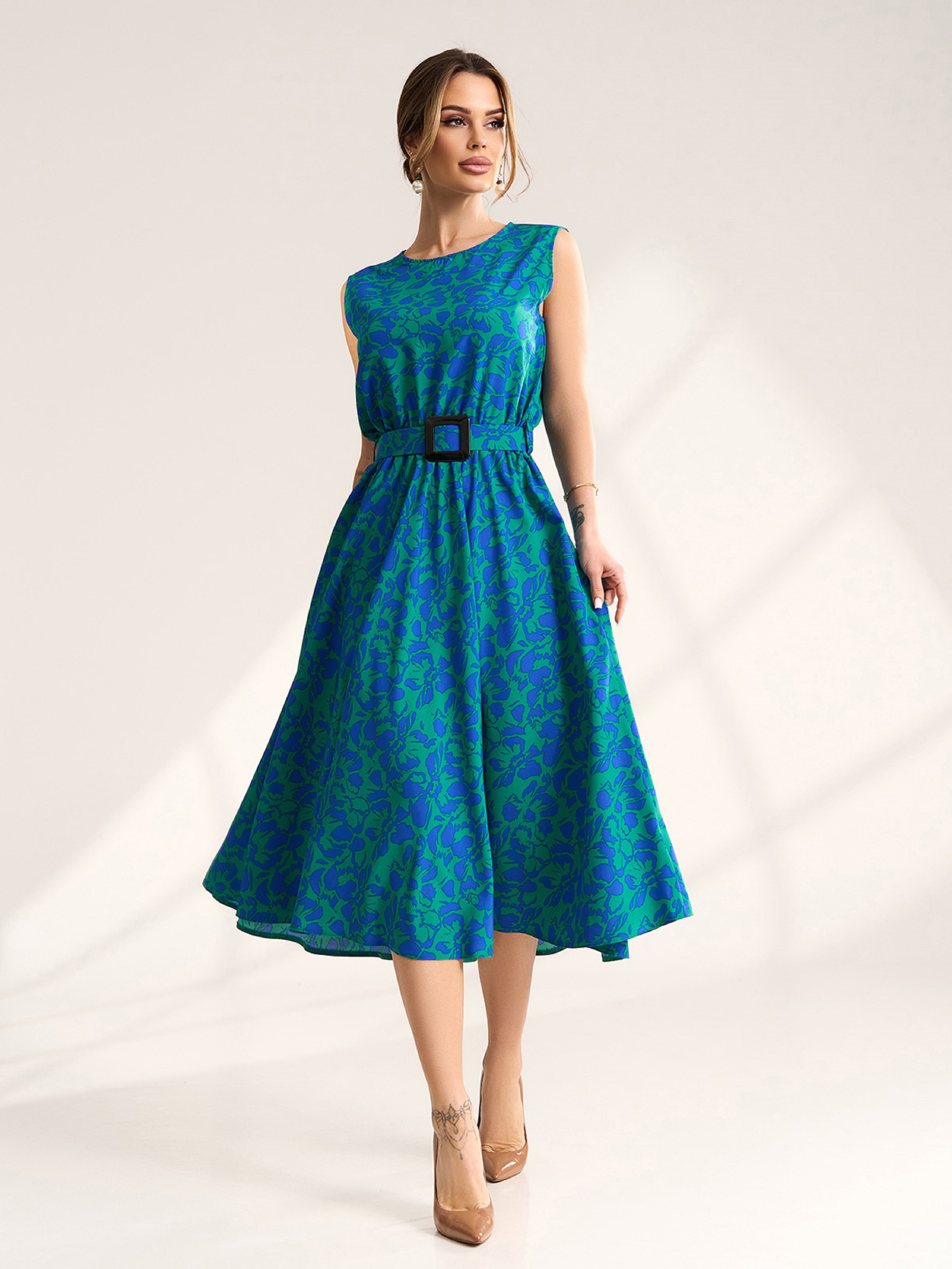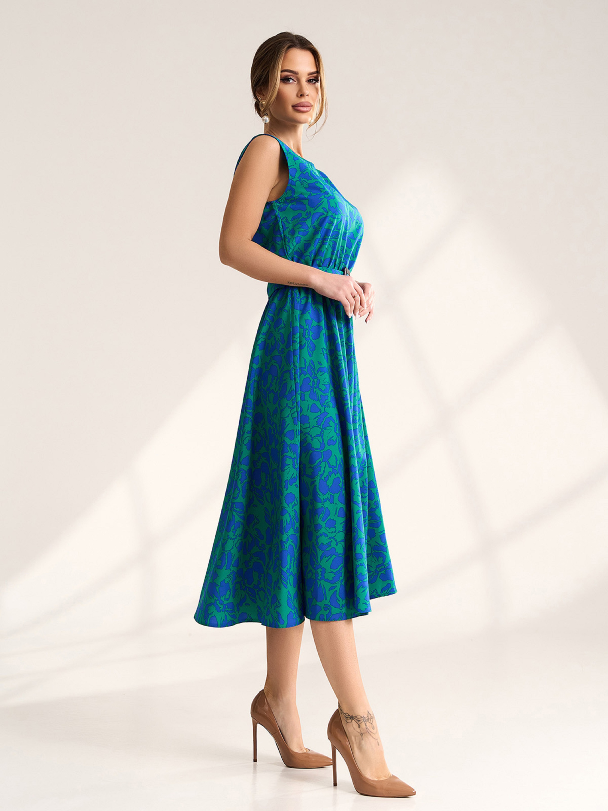 Сине-зеленое цветочное платье из яркого софта с резинкой на талии и съемным поясом. Платье без рукавов с приталенным кроем и расклешенным низом миди длины. Полуобхват: Грудь: S (47), M (49), L (51), XL (53), XXL (55), 3XL (57), Талия: S (31-41), M (33-43), L (35-45), XL (37-47), XXL (39-49), 3XL (41-51), Бедра: S (70), M (72), L (74), XL (76), XXL (78), 3XL (80), Длина изделия - 119, Ткань: Низкой эластичности.