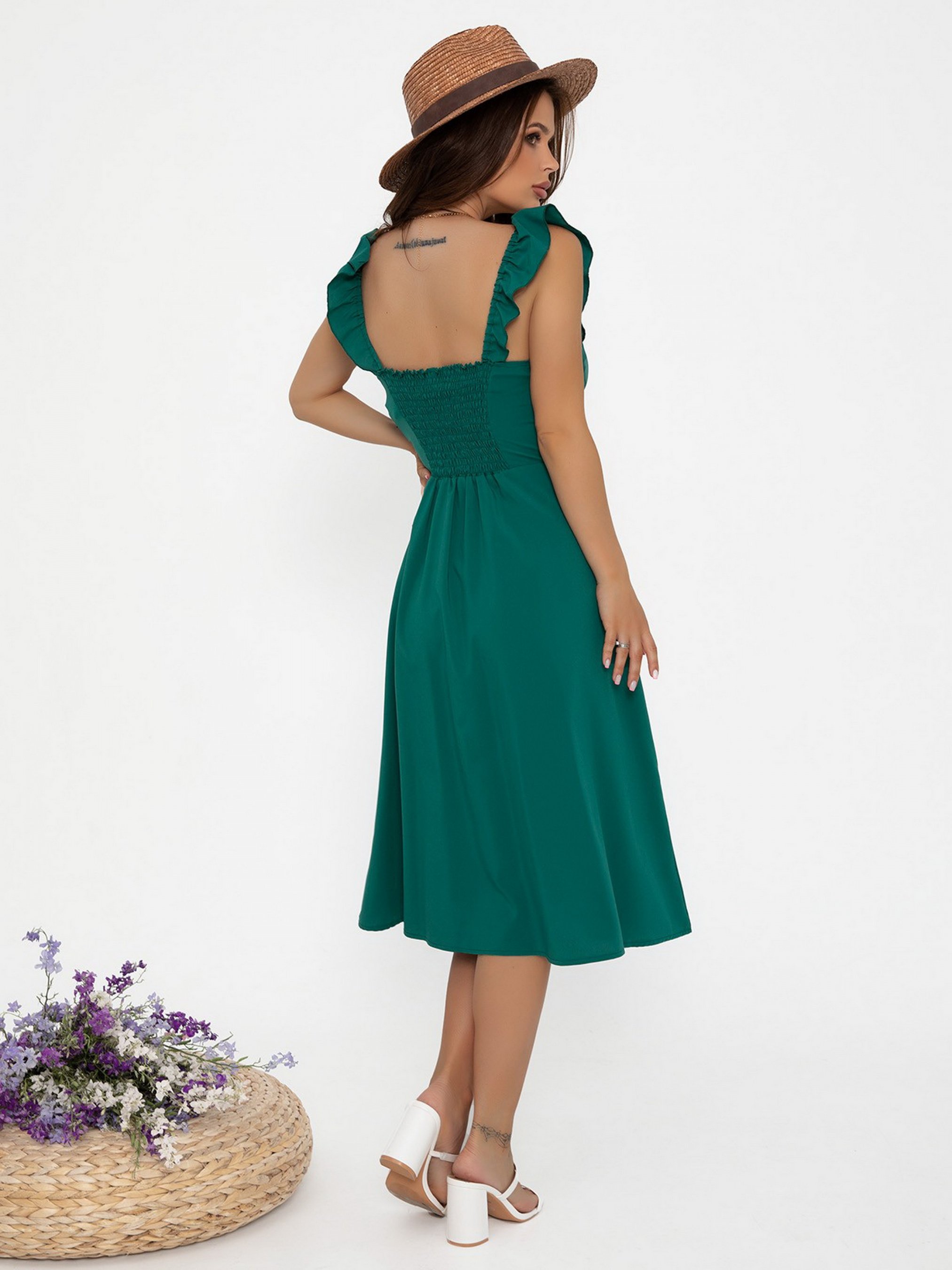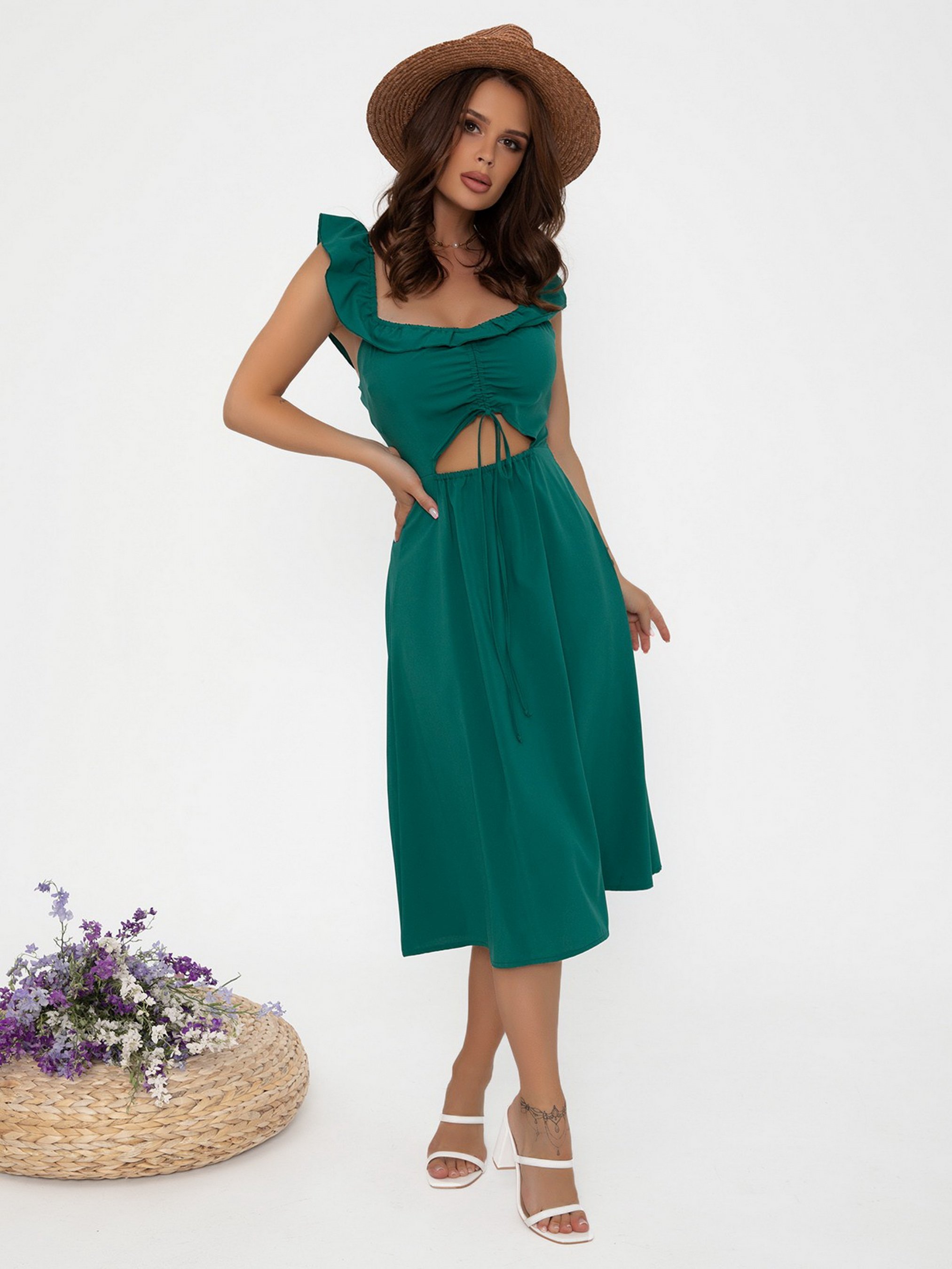 Молодежное платье с вырезом на передней части изделия. Модель выполнена из софта однотонного зеленого цвета. Модель с эластичными бретелями декорировано рюшами и жаткой на спинке. Изделие с резинкой на талии и юбкой-трапецией миди длины декорировано тесьмой-завязкой. Состав: 50% хлопок, 50% полиэстер. Полуобхват: Грудь: S (42), M (44), L (46), XL (48), Талия: S (30-36), M (32-38), L (34-40), XL (36-42), Бедра: S (56), M (58), L (60), XL (62), Длина изделия - 102, Ткань: Низкой эластичности.