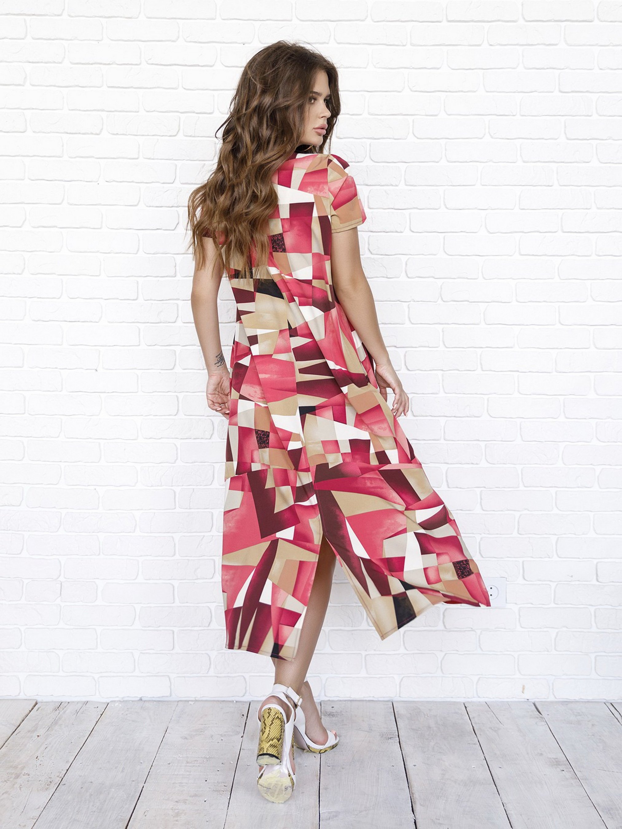 Асимметричное платье-трапеция миди длины с разрезом сзади по нижнему краю. Модель расклешенного свободного кроя с боковыми карманами и короткими рукавами. Модель сшита из софта с геометрическим принтом. Cостав: 59% полиэстер, 21% эластан, 20% хлопок.Растяжимость: грудь: S (94), M (98), L (102), XL (106), XXL (110), 3XL (114), 4XL (118), 5XL (122), талия: S (100), M (104), L (108), XL (112), XXL (116), 3XL (120), 4XL (124), 5XL (128), бедра: S (124), M (128), L (132), XL (136), XXL (140), 3XL (144), 4XL (148), 5XL (152), длина изделия -103, Ткан