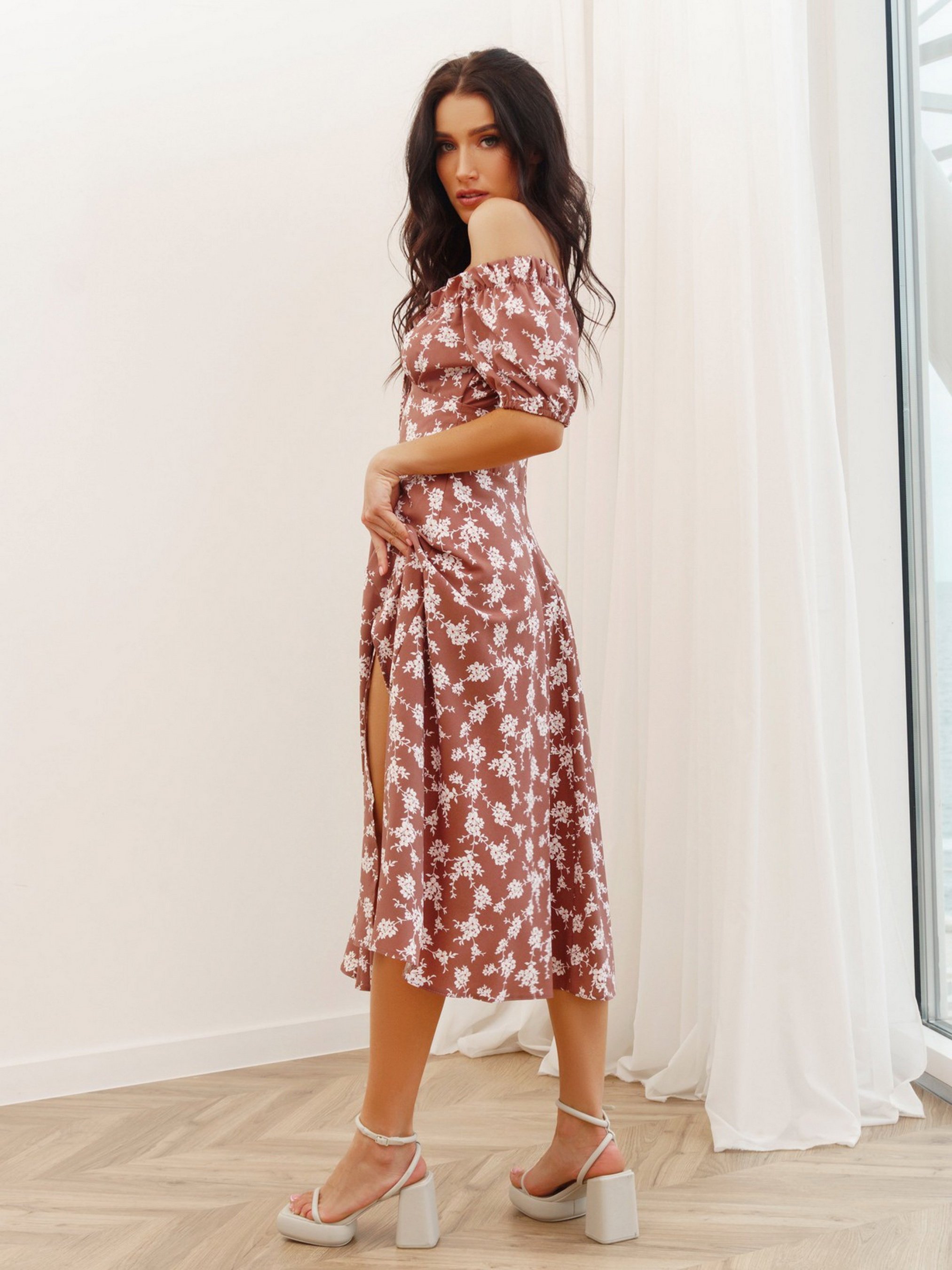 Цветочное платье с открытыми плечами выполненное из крепа с легкой жатой текстурой. Модель с резинкой на спинке и кулиской спереди горловины. Платье с короткими рукавами-фонариками и вставкой на груди. Модель приталенного кроя со свободным низом декорированным разрезом. Модель миди длины, на спинке молния. Состав: 50% хлопок, 50% полиэстер. Полуобхват: Грудь: S (44), M (46), L (48), XL (50 ), Талия: S (35), M (37), L (39), XL (41), Бедра: S (59), M (61), L (63), XL (65), Длина изделия - 107, Ткань: Низкой эластичности.