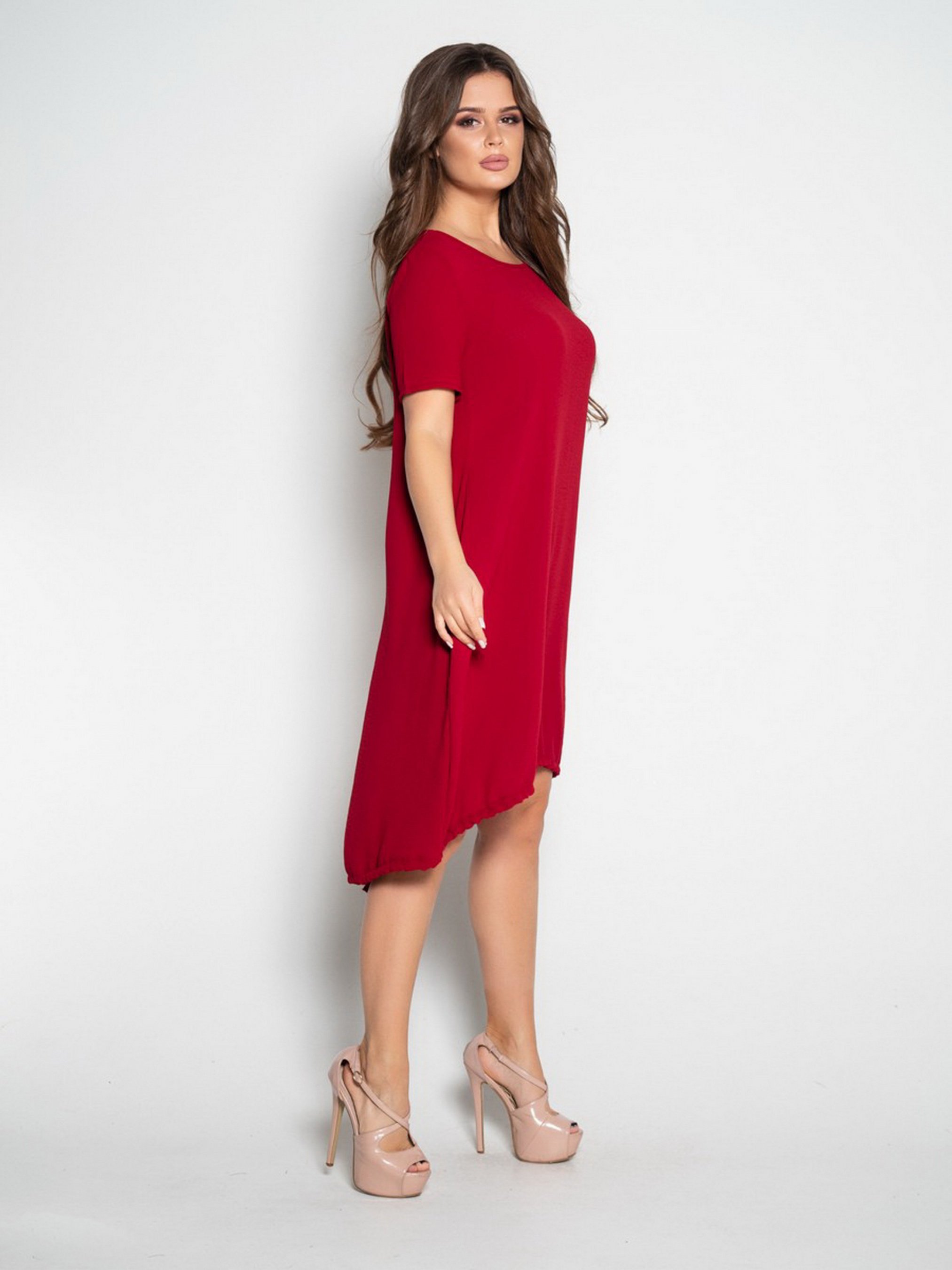 Летнее свободное бордовое платье длиной до колен выполненное из софта с асимметричной длиной и боковыми карманами. Платье со комфортным расклешенным кроем с небольшим вырезом сзади и функциональной кулиской на подоле. Модель с короткими рукавами, округлой лаконичной горловиной и вырезом в виде капли на спинке. Материал: Софт. Растяжимость: Грудь: S (96), M (100), L (104), XL (110). XXl (114), 3XL (118), 4XL (122),5XL (126), Талия: S (100), M (104), L (108), XL (112). XXl (116), 3XL (120), 4XL (124), 5XL (128), Бедра: S (120), M (124), L (128), XL (132). XXl (136), 3XL (140), 4XL (144), 5XL (148),Длина изделия- 88 Длина п