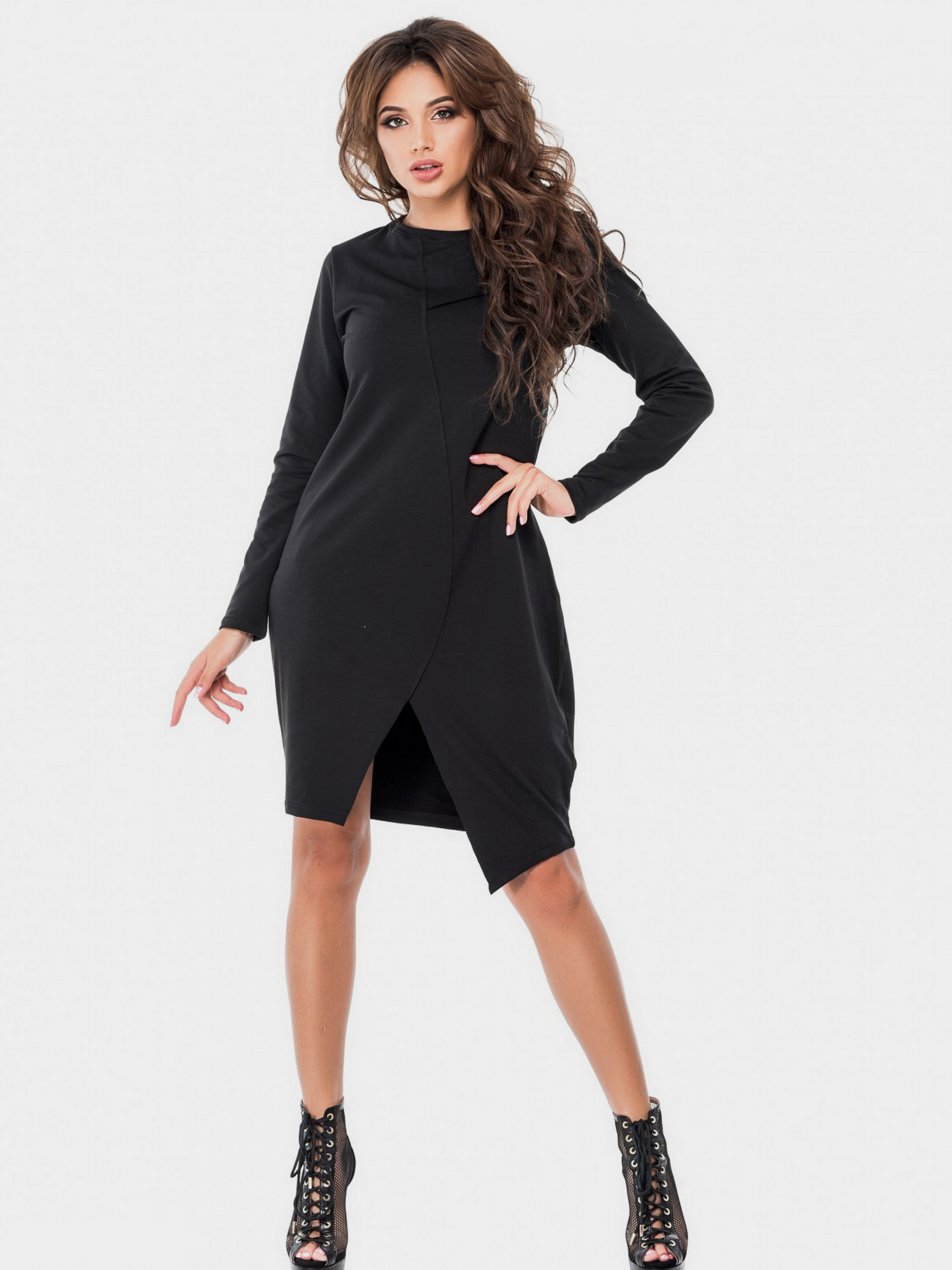 Стильное платье черного цвета, чуть ниже колен. Модель с длинными рукавами, с разрезом на колене и без декольте. Наружный шовчик интересно декорирует платье, добавляя ему изюминку. Ткань - плотная, эластичная, немного махровая изнутри, но гладкая снаружи. Состав: 80% хлопок, 20% эластан. Растяжимость: грудь: S(84-90), M(88-94),L(92-98),XL(96-106), XXL (100-106), 3XL (104-110), талия: S (88-94), M(92-98),L(96-102),XL(100-106), XXL (104-110), 3XL (108-114), бедра:S (100-106),M (104-110),L (108-114), XL(112-118), XXL (116-121), 3XL (120-126), рукав- 58, длина - 95, Ткань: Средней эластичности.