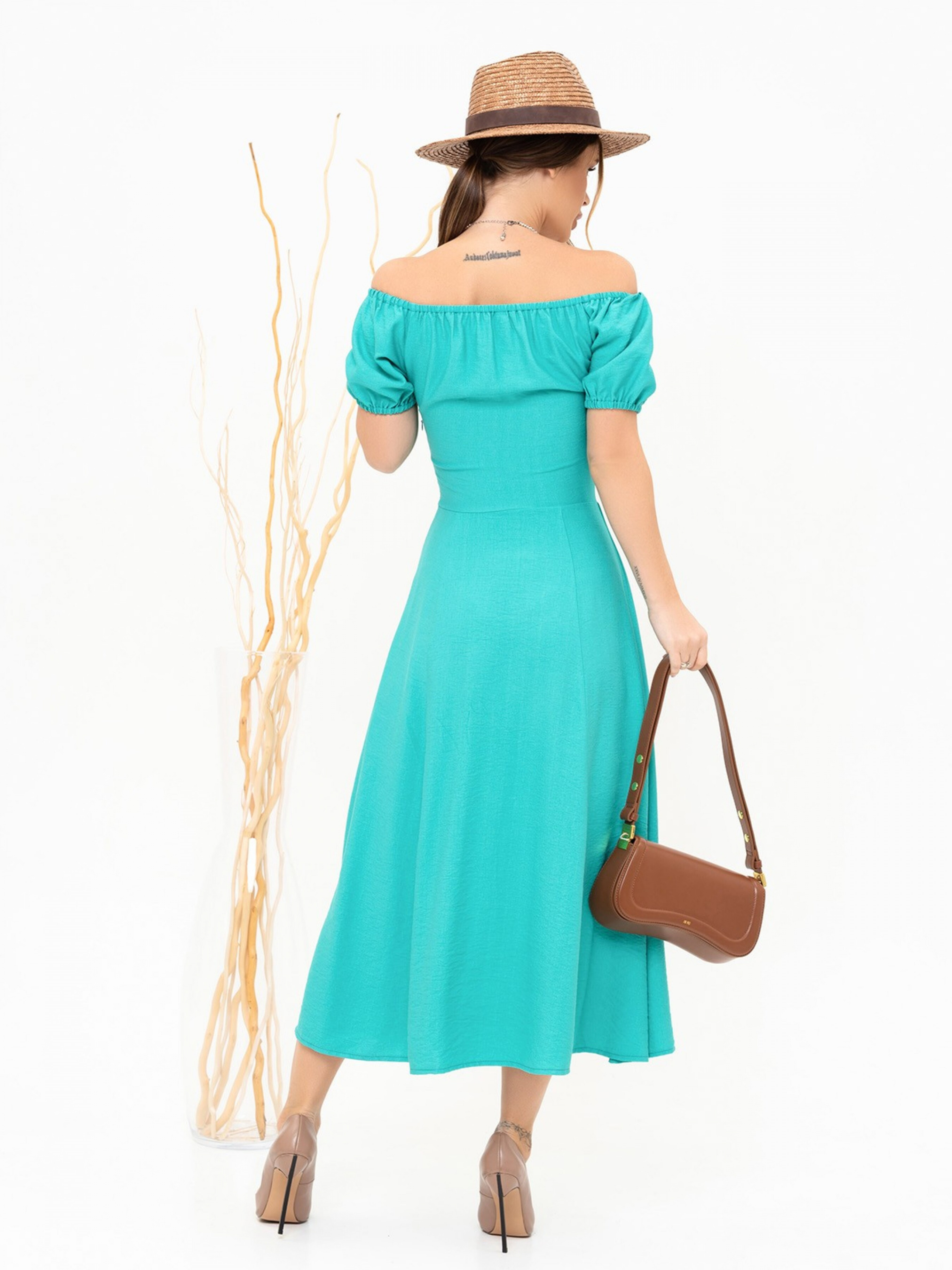 Зеленое приталенное платье из льна с открытыми плечами на резинке. Модель на молнии с рукавами-фонариками короткой длины и расклешенным низом миди длины. Платье с разрезом на ноге выполнено в ретро стиле. Полуобхват: Грудь: S (40), M (42), L (44), XL (46), Талия: S (31), M (33), L (35), XL (37), Бедра: S (63), M (65), L (67), XL (69), Длина изделия - 120, Рукав - 18, Ткань: Низкой эластичности.