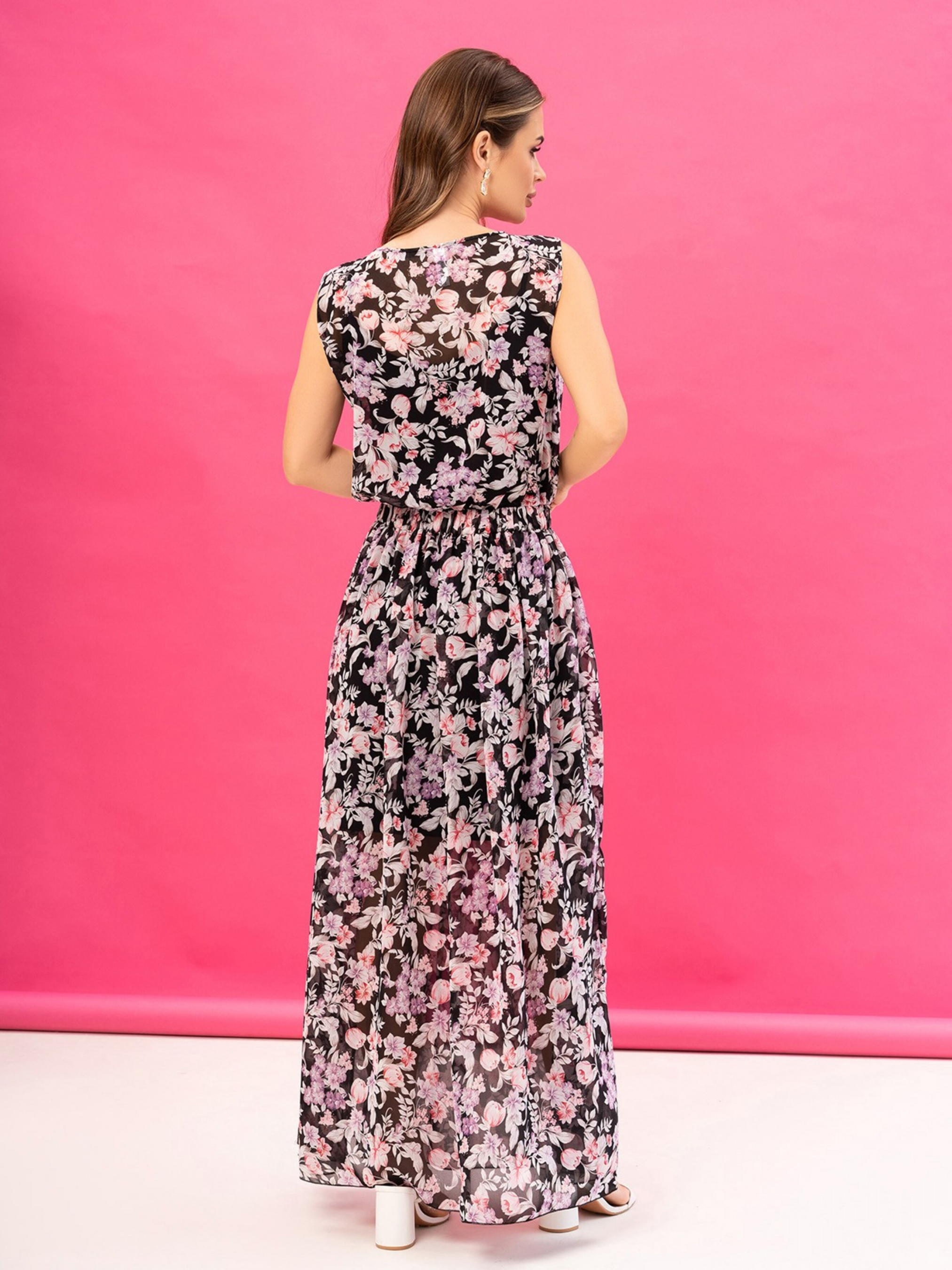 Длинный сарафан из цветочного шифона с разрезом. Цветочный сарафан без рукавов с резинкой на талии. Изделие макси длины, выполнено из тонкого шифона с нижней комбинацией. Модель прямого кроя с разрезом на ноге. Платье без рукавов с полукруглой горловиной. Состав: 59% полиэстер, 21% эластан, 20% хлопок. Материал: Шифон/полиэстер. Полуобхват: Грудь: S (47), M (49), L (51), XL (53), Талия: S (32-42), M (34-44), L (36-46), XL (38-48), Бедра: S (73), M (75), L (77), XL (79), Длина изделия - 143, Ткань: Низкой эластичности.
