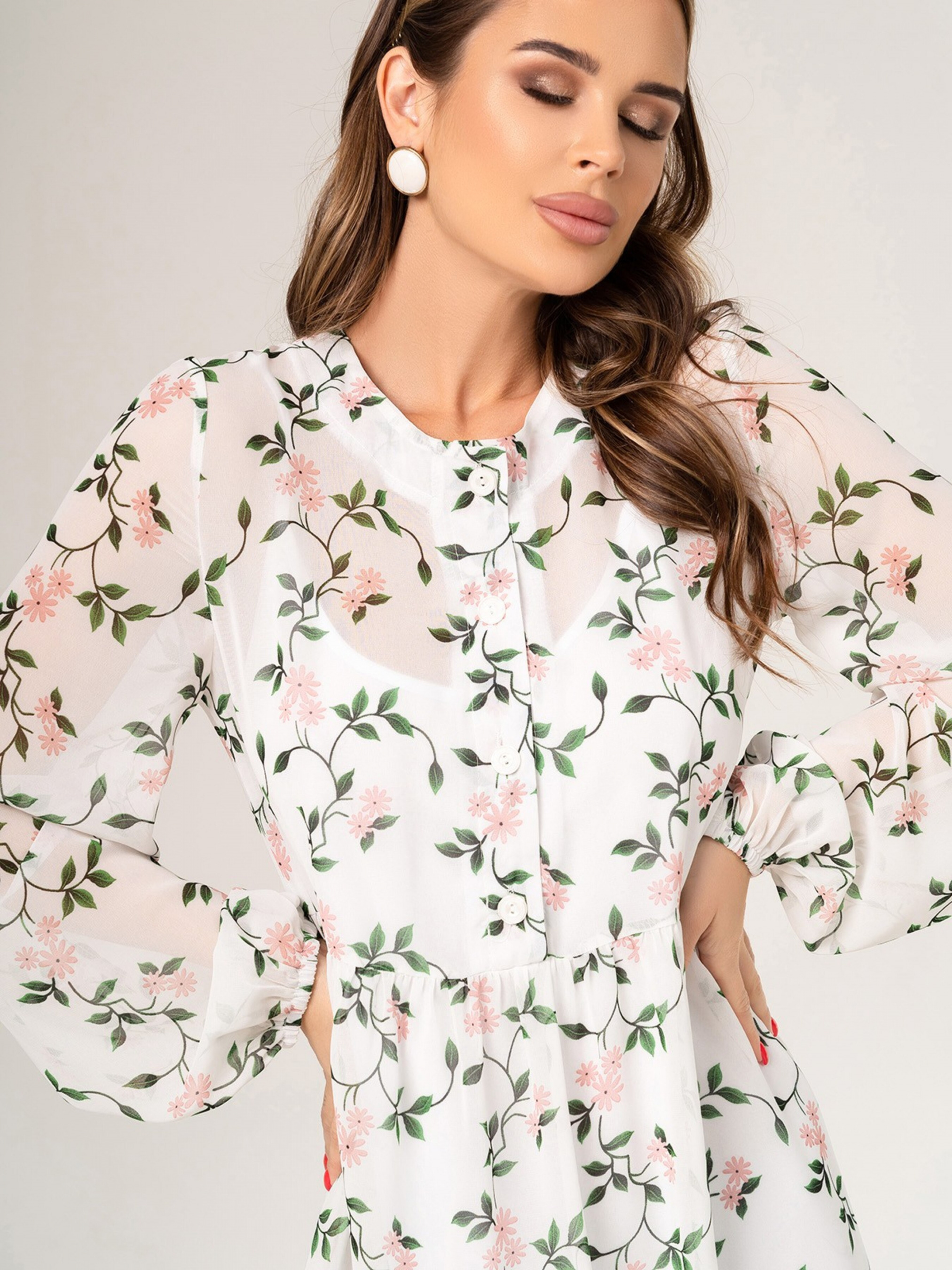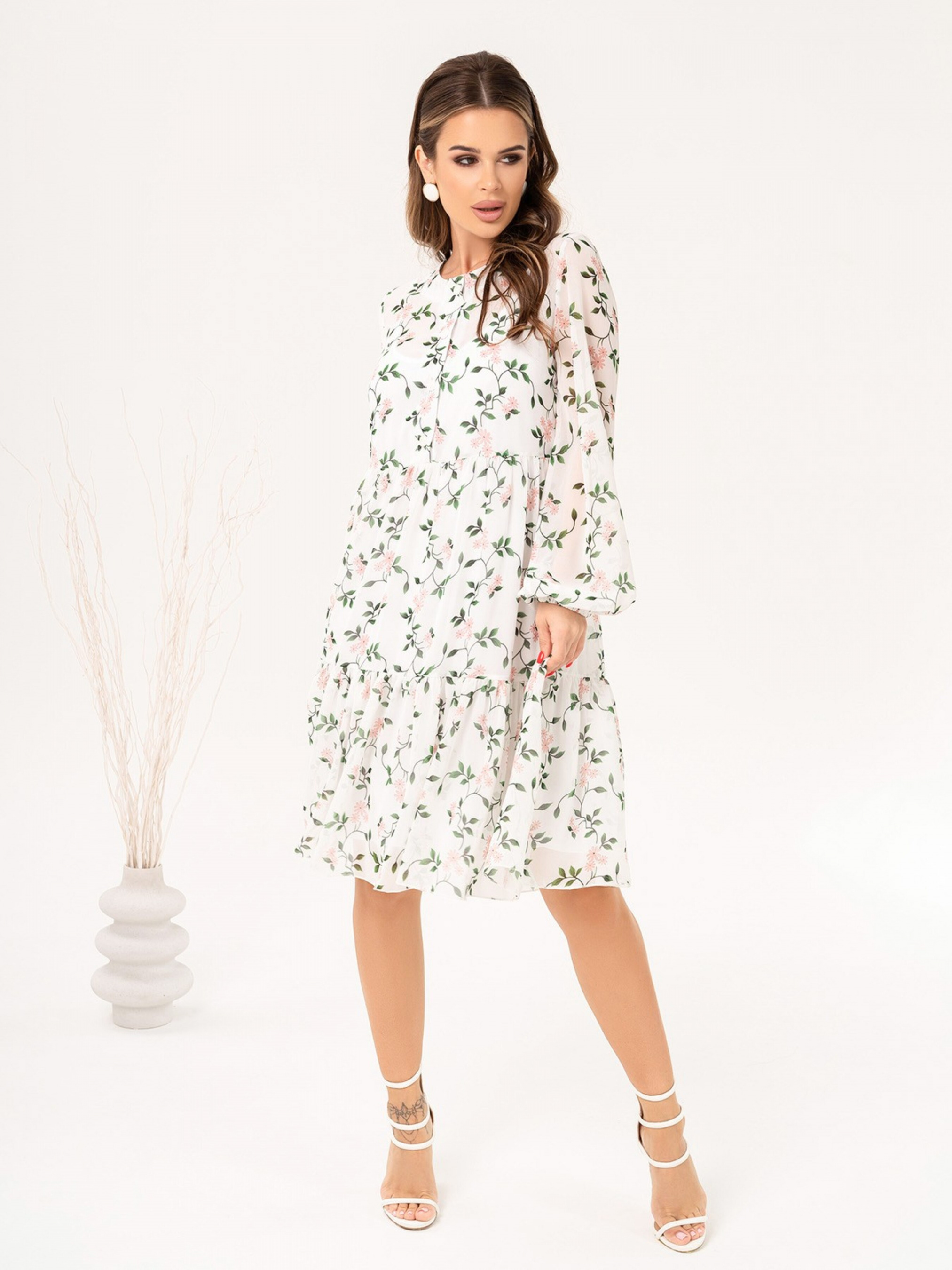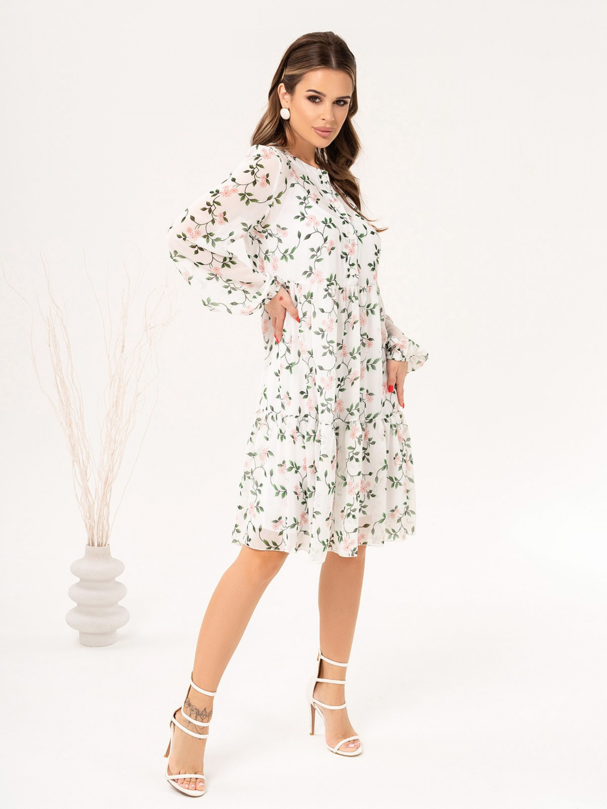 Белое шифоновое платье расклешенного кроя. Белое платье-трапеция из цветочного шифона с нижними воланами. Модель расклешенного свободного кроя с длиной до колен и укороченной передней планкой на пуговицах. Модель с длинными рукавами-фонариками на резинках. Платье оснащено нижней комбинацией на бретельках. Состав: 59% полиэстер, 21% эластан, 20% хлопок. Материал: Шифон/полиэстер. Полуобхват: Грудь: S (45), M (47), L (49), XL (51), Талия: S (43), M (45), L (47), XL (49), Бедра: S (73), M (75), L (77), XL (79), Длина изделия - 96, Рукав - 61, Ткань: Низкой эластичности.