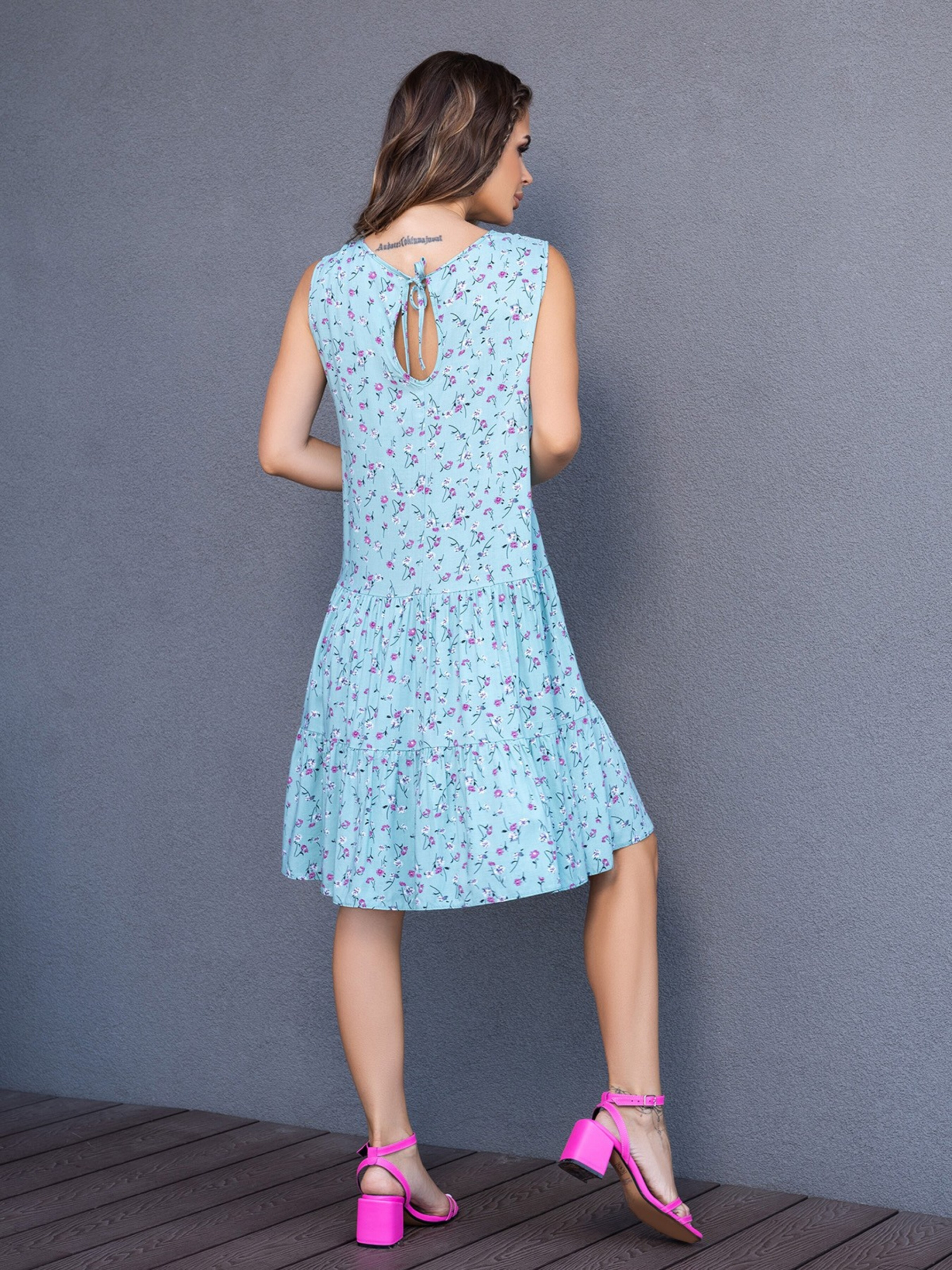 Мятное цветочное платье из хлопка с воланами. Легкое платье-сарафан без рукавов, выполненное из хлопкового штапеля мятного цвета с цветочным принтом. Модель со свободным расклешенным кроем трапеции и нижними воланами. Платье с длиной до колен оснащено закрытой горловиной на завязке. Состав: 100% хлопок. Материал: Штапель. Полуобхват: Грудь: S (45), M (47), L (49), XL (51), Талия: S (49), M (51), L (53), XL (55), Бедра: S (80), M (82), L (84), XL (86), Длина изделия - 95, Ткань: Низкой эластичности.