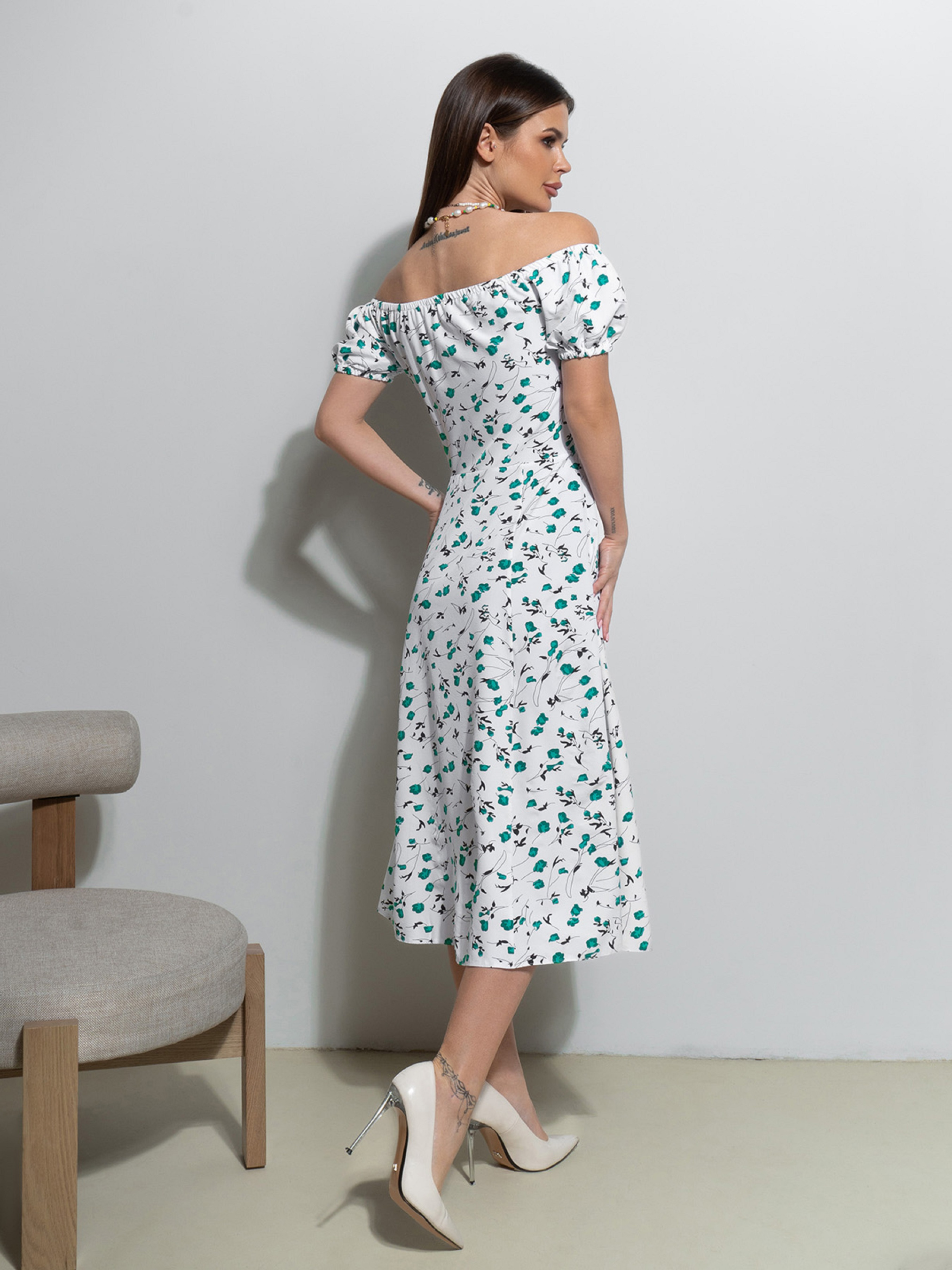 Цветочное бело-зеленое ретро платье с приспущенными плечами на резинке, выполненное из софта. Модель с короткими рукавами-фонариками на резинках и приталенным кроем. Платье миди длины с расклешенным низом, декорированным разрезом на ноге.Полуобхват: Грудь: S (42), M (44), L (46), XL (48), Талия: S (35), M (37), L (39), XL (41), Бедра: S (63), M (65), L (67), XL (69), Длина изделия - 120, Рукав - 20, Ткань: Низкой эластичности.