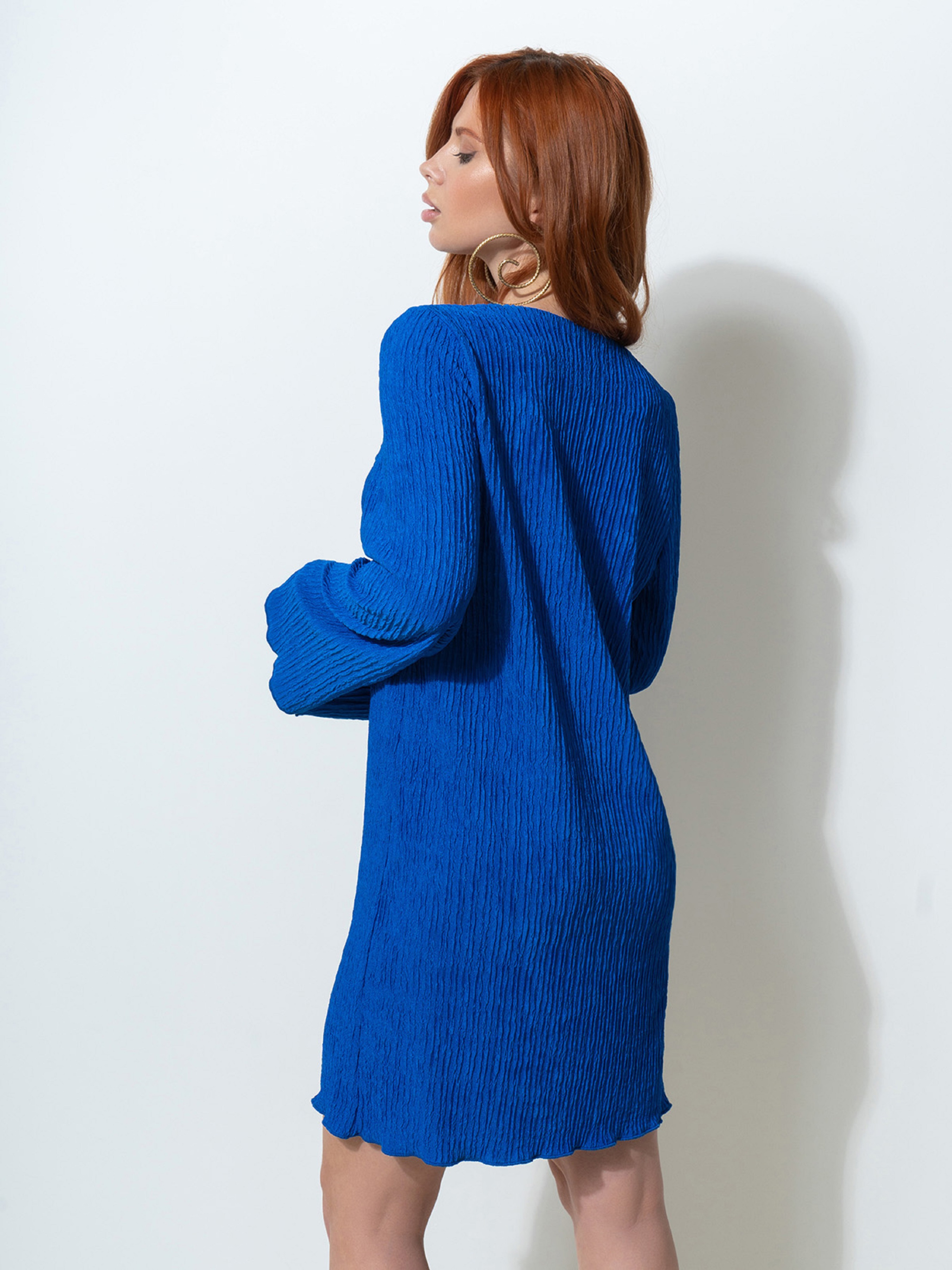 Эластичное платье, выполненное из синей жатки с прямым свободным кроем и широкими длинными рукавами. Модель короткой длины с тесемками и V-образной горловиной.Полуобхват: Грудь: S (45), M (47), L (49), XL (51), Талия: S (45), M (47), L (49), XL (51), Бедра: S (45), M (47), L (49), XL (51), Длина изделия - 84, Рукав - 67, Ткань: Низкой эластичности.