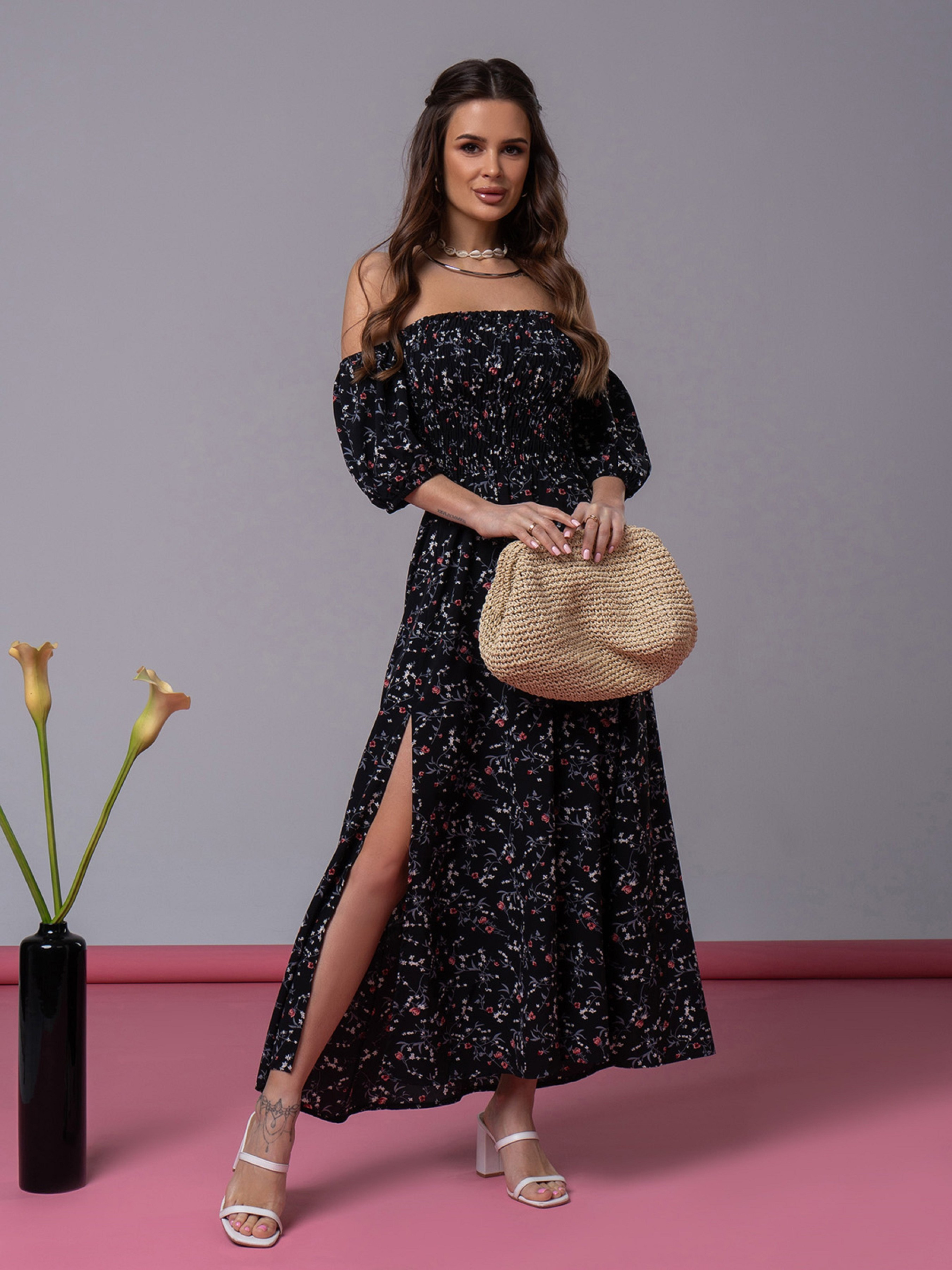 Черное цветочное ретро платье, выполненное из софта с эластичным облегающим лифом бандо. Изделие приталенного кроя с расклешенной длинной юбкой декорированной двумя боковыми разрезами. Модель с приспущенными с плеч короткими рукавами-фонариками. Полуобхват: Грудь: S (25-42), M (27-44), L (29-46), XL (31-48), Талия: S (25-42), M (27-44), L (29-46), XL (31-48), Бедра: S (66), M (68), L (70), XL (72), Длина изделия - 114, Рукав -23, Ткань: Низкой эластичности.
