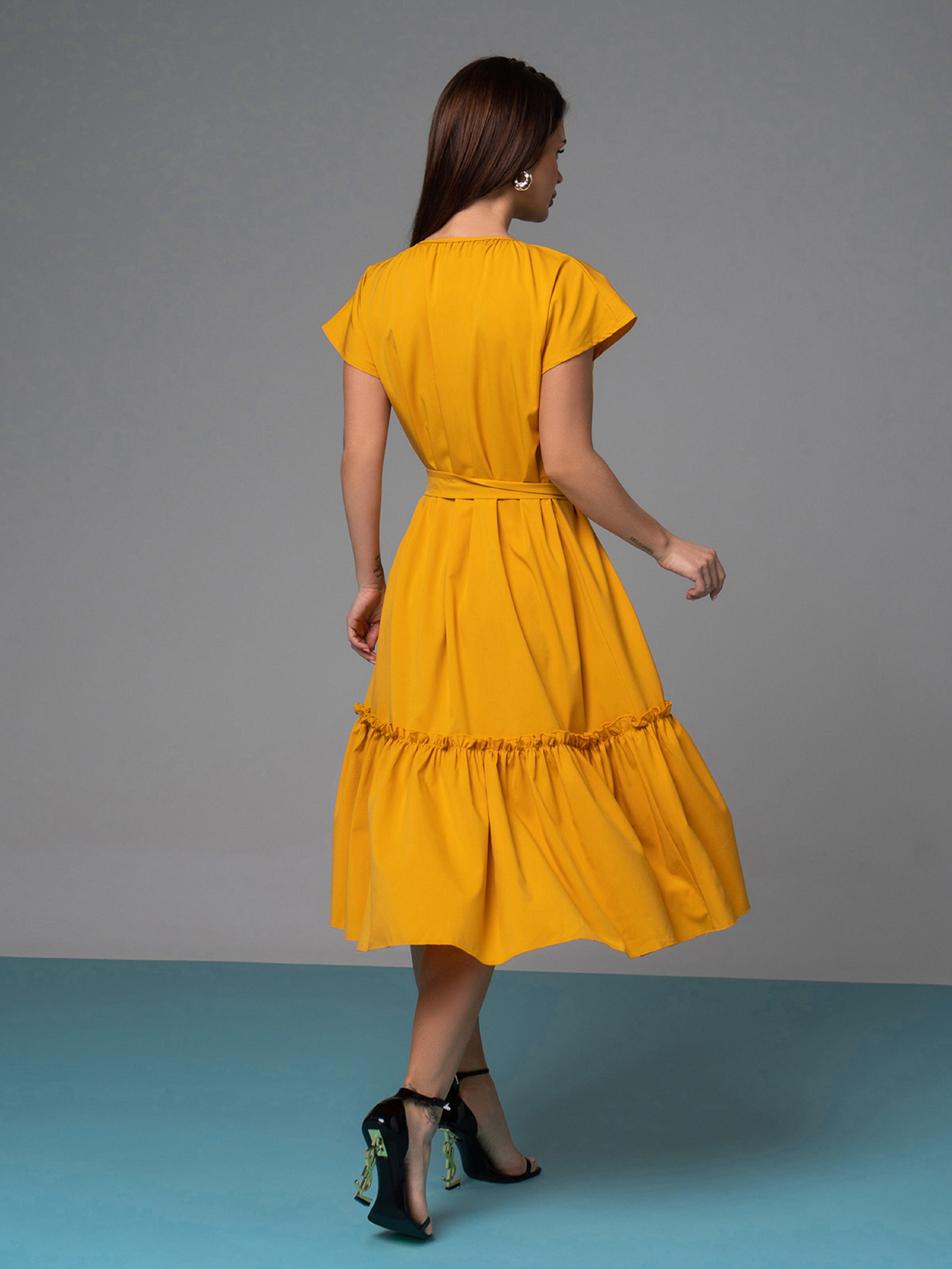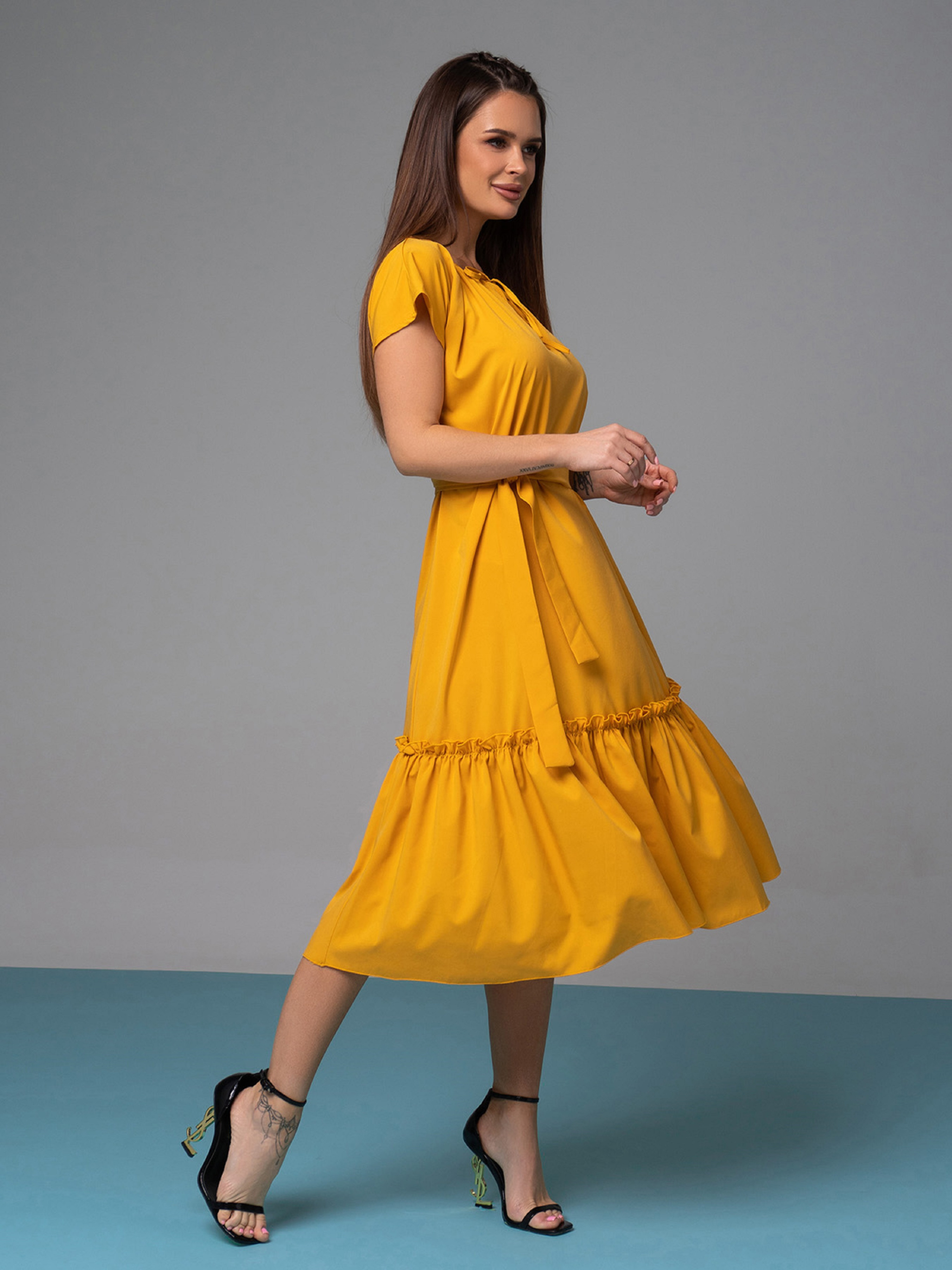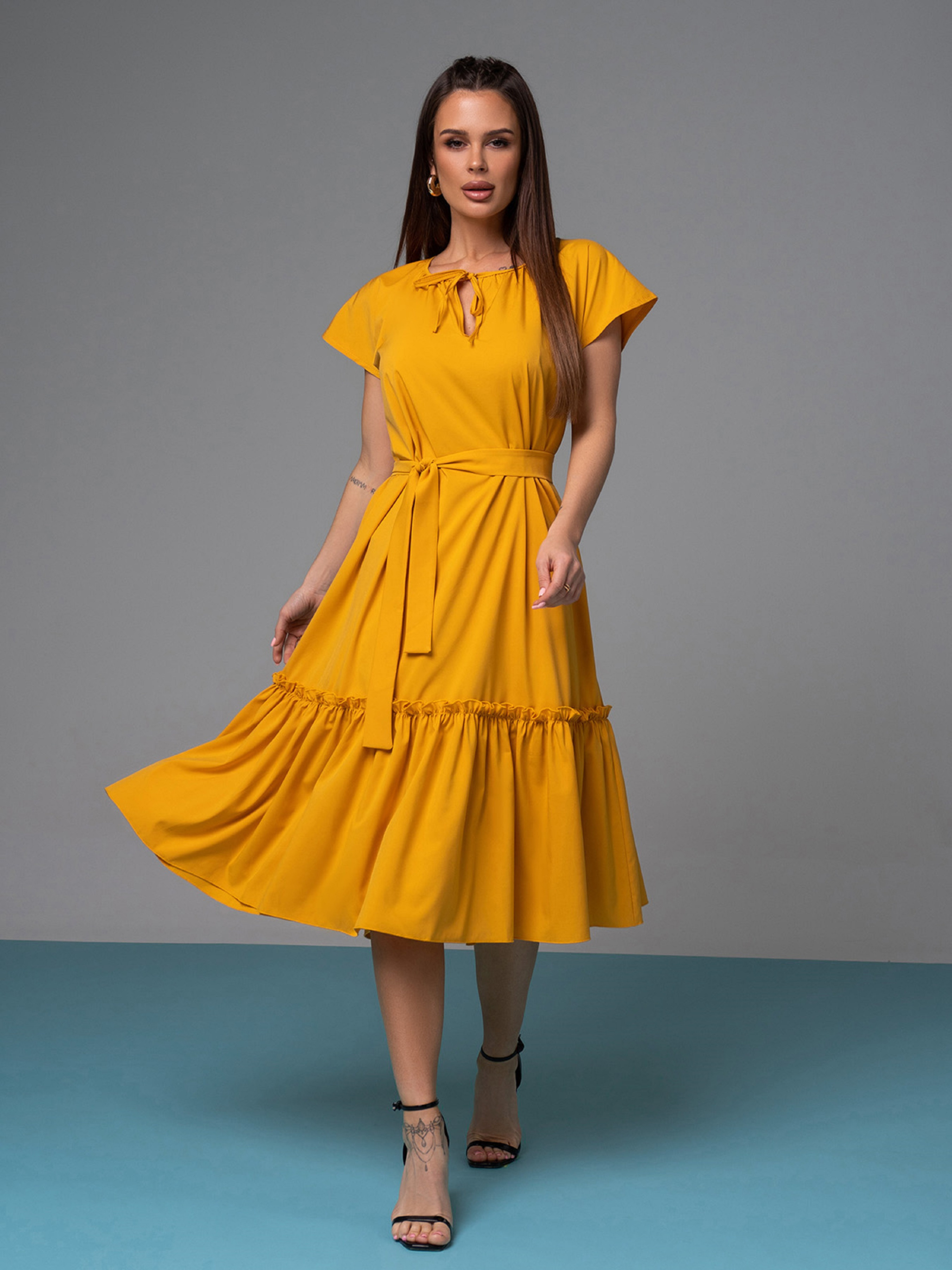Горчичное миди платье-трапеция, выполненное из софта. Изделие расклешенного кроя с короткими цельнокроенными рукавами и завязкой у горловины. Платье декорировано воланом с рюшами и комплектуется съемным поясом. Полуобхват: Грудь: S (52), M (54), L (56), XL (58), Талия: S (59), M (61), L (63), XL (64), Бедра: S (66), M (68), L (70), XL (72), Длина изделия - 112, Рукав - 7, Ткань: Низкой эластичности.