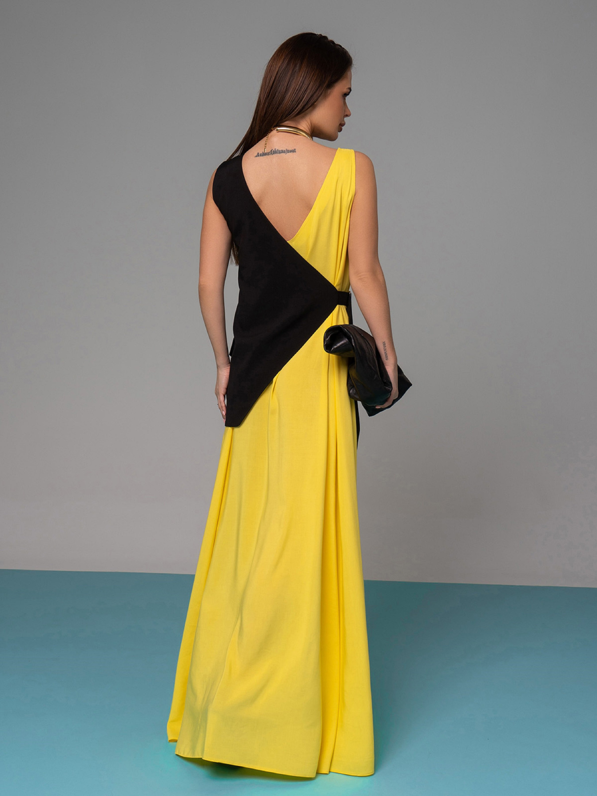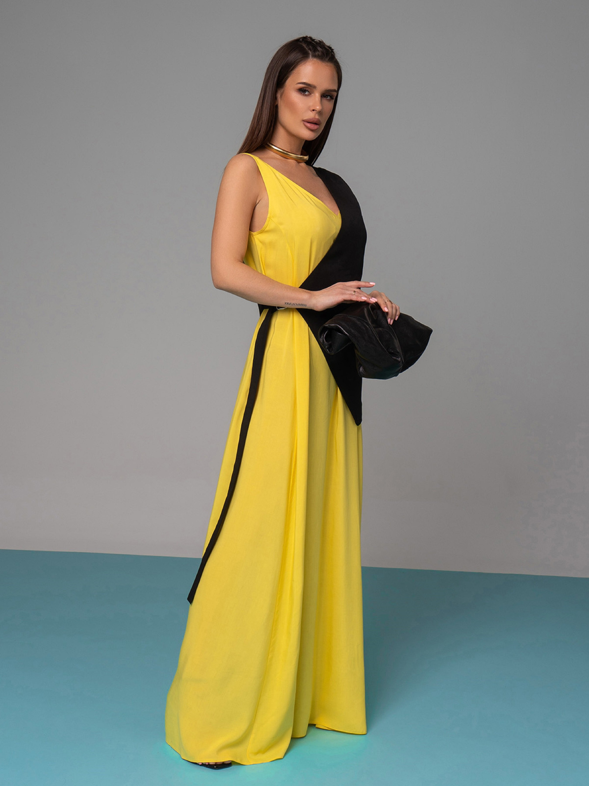 Длинный сарафан с боковой съемной вставкой-полужилетом на пряжке. Платье с V-образным декольте и расклешенным кроем. Модель без рукавов выполнено из хлопка черного и желтого цветов. Полуобхват: Грудь: S (50), M (52), L (54), XL (56), Талия: S (65), M (67), L (69), XL (71), Бедра: S (76), M (78), L (80), XL (82), Длина изделия - 143, Ткань: Низкой эластичности.