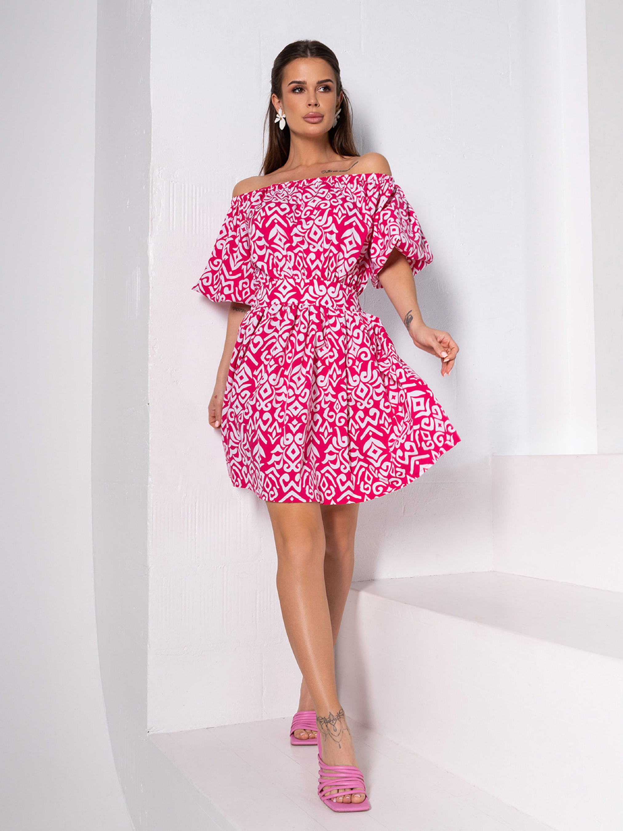 Малиновое платье из софта с орнаментом и резинкой вдоль проймы. Модель с объемными рукавами-фонариками и открытыми плечами обладает приталенным кроем и длиной выше колен.Полуобхват: Грудь: S (49), M (51), L (53), XL (55), Талия: S (31), M (33), L (35), XL (37), Бедра: S (64), M (66), L (68), XL (70), Длина изделия - 86, Рукав - 39, Ткань: Низкой эластичности.