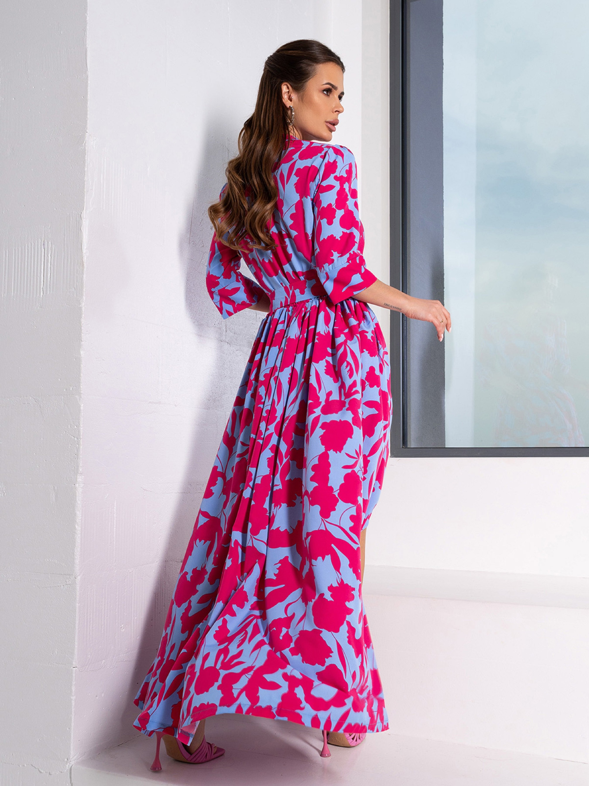 Длинное малиново-голубое платье из софта с макси длиной в пол и разрезом спереди. Платье с приталенным кроем и рукавами длиной 3/4 оснащено вырезом в горловины и воротником. Изделие с карманами и съемным текстильным поясом.Полуобхват: Грудь: S (46), M (48), L (50), XL (52), Талия: S (30-42), M (32-44), L (34-46), XL (36-48), Бедра: S (94), M (96), L (98), XL (100), Длина изделия - 145, Рукав - 36, Ткань: Низкой эластичности.