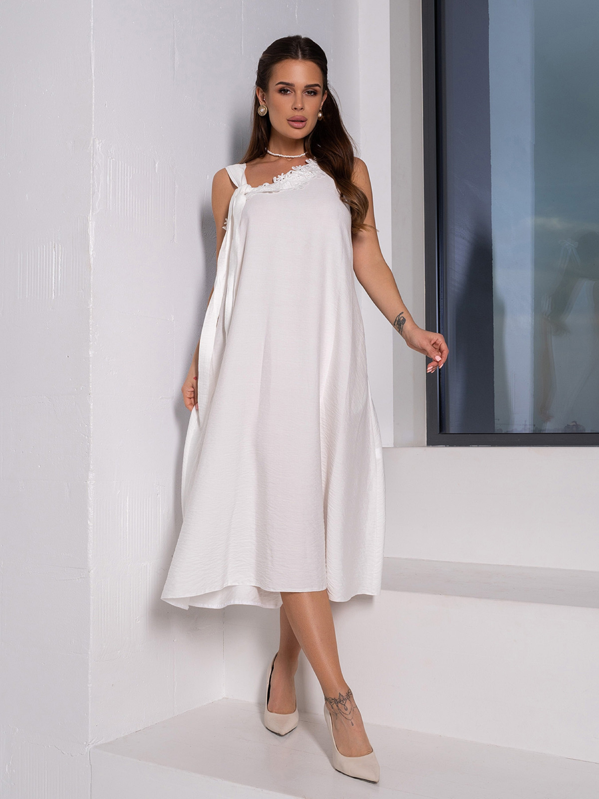 Молочный легкий льняной сарафан без рукавов с асимметричной открытой горловиной и кружевной отделкой. Модель с регулируемой бретелей-завязкой и расклешенным кроем трапеции.Полуобхват: Грудь: S (45), M (47), L (49), XL (51), Талия: S (54), M (56), L (58), XL (60), Бедра: S (65), M (67), L (69), XL (71), Длина изделия - 112, Ткань: Низкой эластичности.