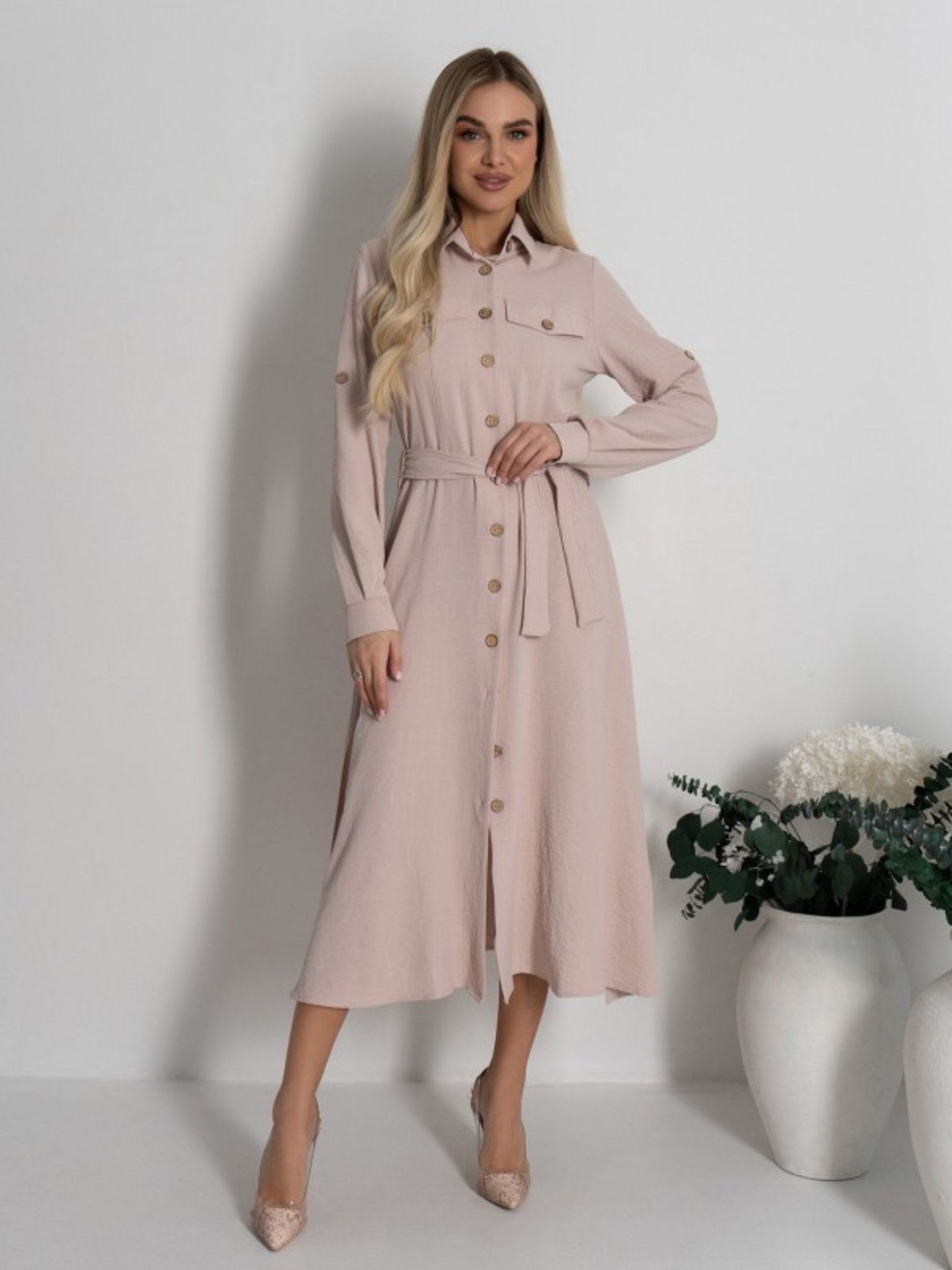 Однотонное платье-рубашка на пуговицах, выполненное из текстурированного крепа бежевого светлого цвета. Платье приталенного кроя с воротником и боковыми разрезами. Изделие миди длины с клапанами на груди и съемным текстильным поясом. Платье с длинными рукавами на манжетами оснащенными пуговицей и хлястиком для подворота. Полуобхват: Грудь: S (45), M (47), L (49), XL (51), Талия: S (39), M (41), L (43), XL (45), Бедра: S (54), M (56), L (58), XL (60), Длина изделия - 122, Рукав - 63, Ткань: Низкой эластичности.