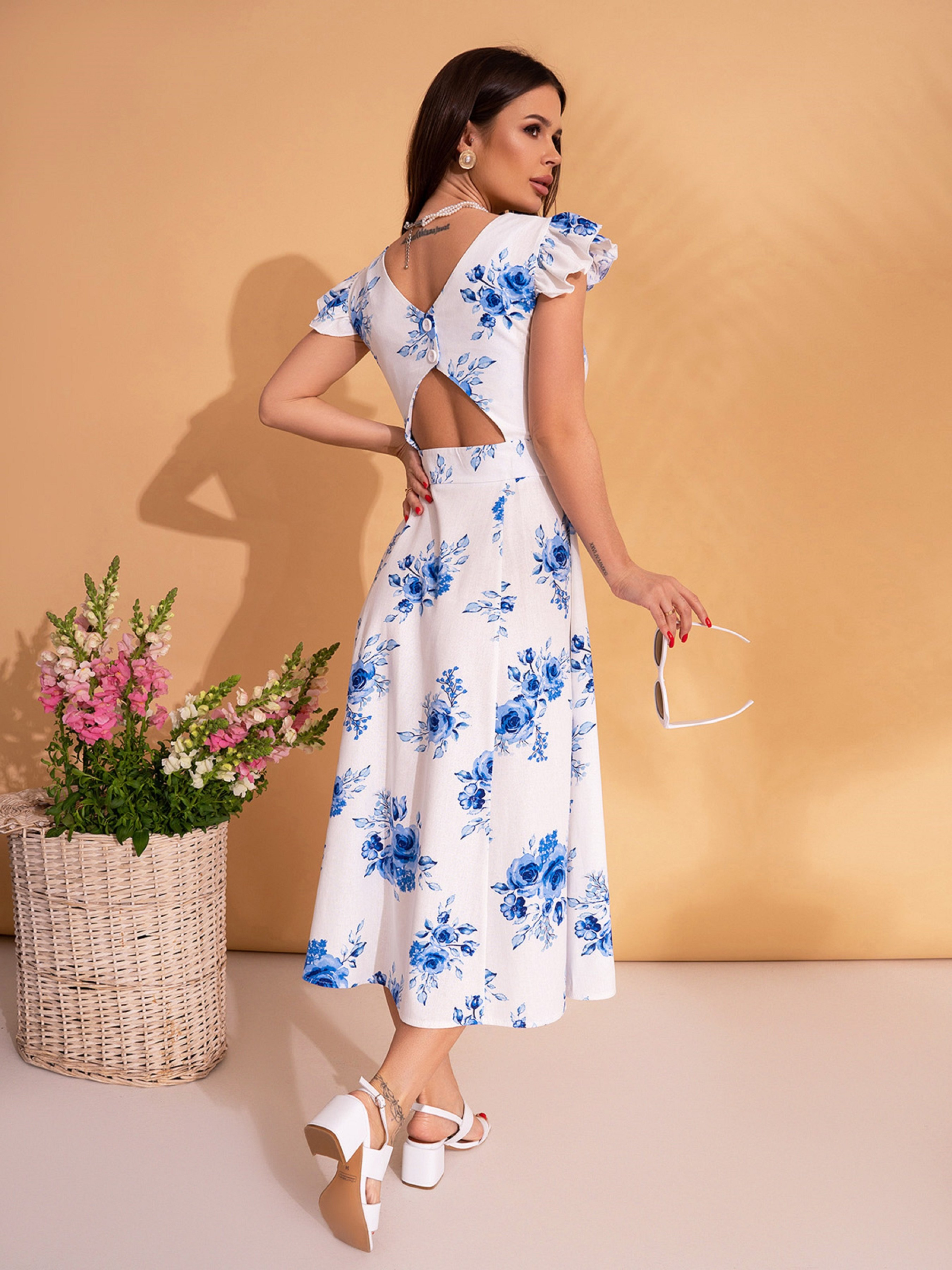 Бело-синее льняное платье с расклешенным низом миди длины и цветочным принтом. Модель приталенного кроя с полукруглой глубокой горловиной и рюшами вдоль пройм рукавов. Модель декорирована пуговицами и вырезом на спинке. Сбоку модели молния. Полуобхват: Грудь: S (42), M (44), L (46), XL (48), Талия: S (33), M (35), L (37), XL (39), Бедра: S (57), M (59), L (61), XL (63), Длина изделия - 115, Ткань: Низкой эластичности.