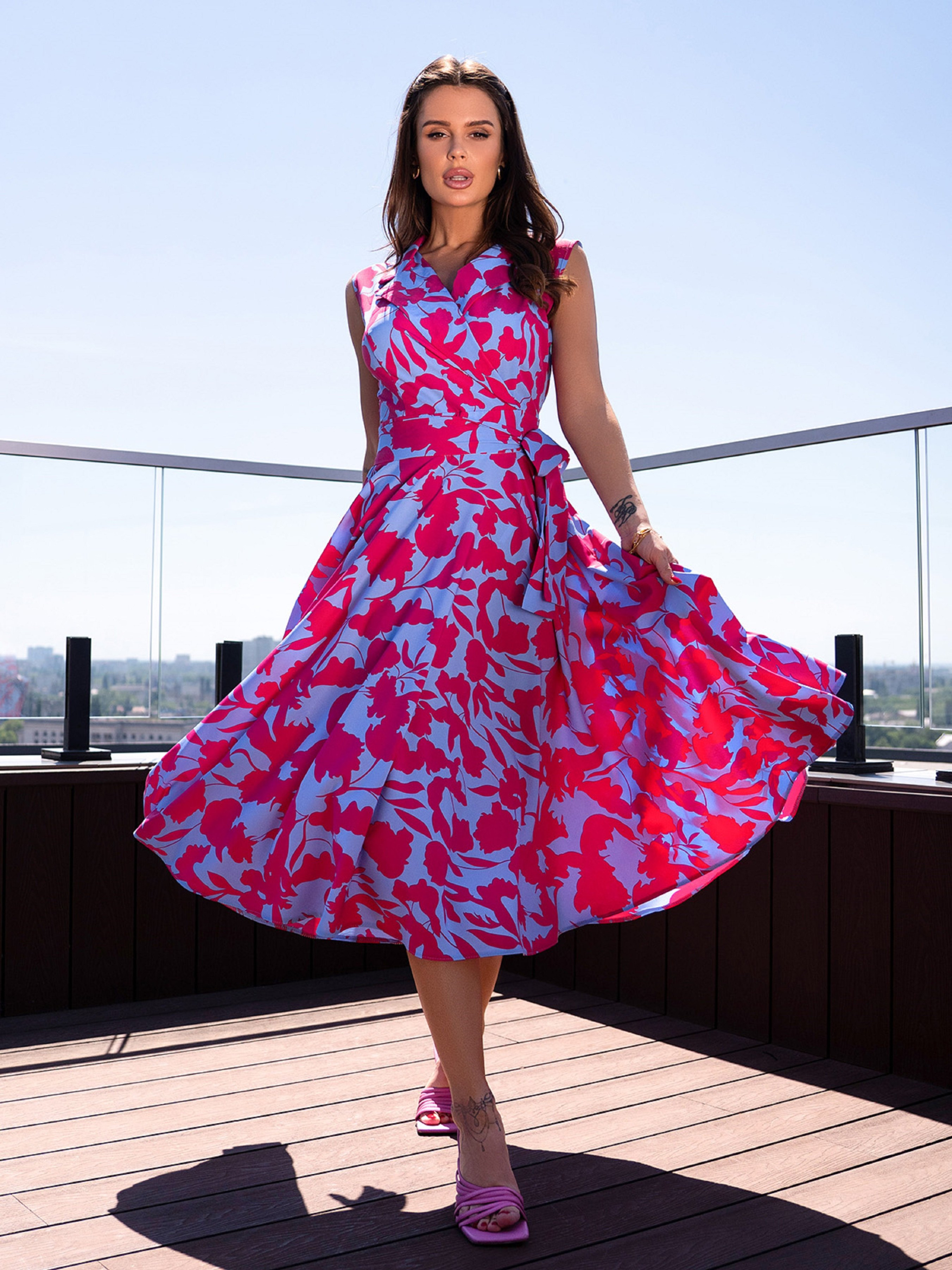 Яркое красно-голубое платье-тренч с декольте на запах и английским воротником. Платье из софта с приталенным кроем и расклешенным низом миди длины. Модель без рукавов комплектуется съемным поясом. Полуобхват: Грудь: S (45), M (47), L (49), XL (51), Талия: S (35), M (37), L (39), XL (40), Бедра: S (78), M (80), L (82), XL (84), Длина изделия - 114, Ткань: Низкой эластичности.