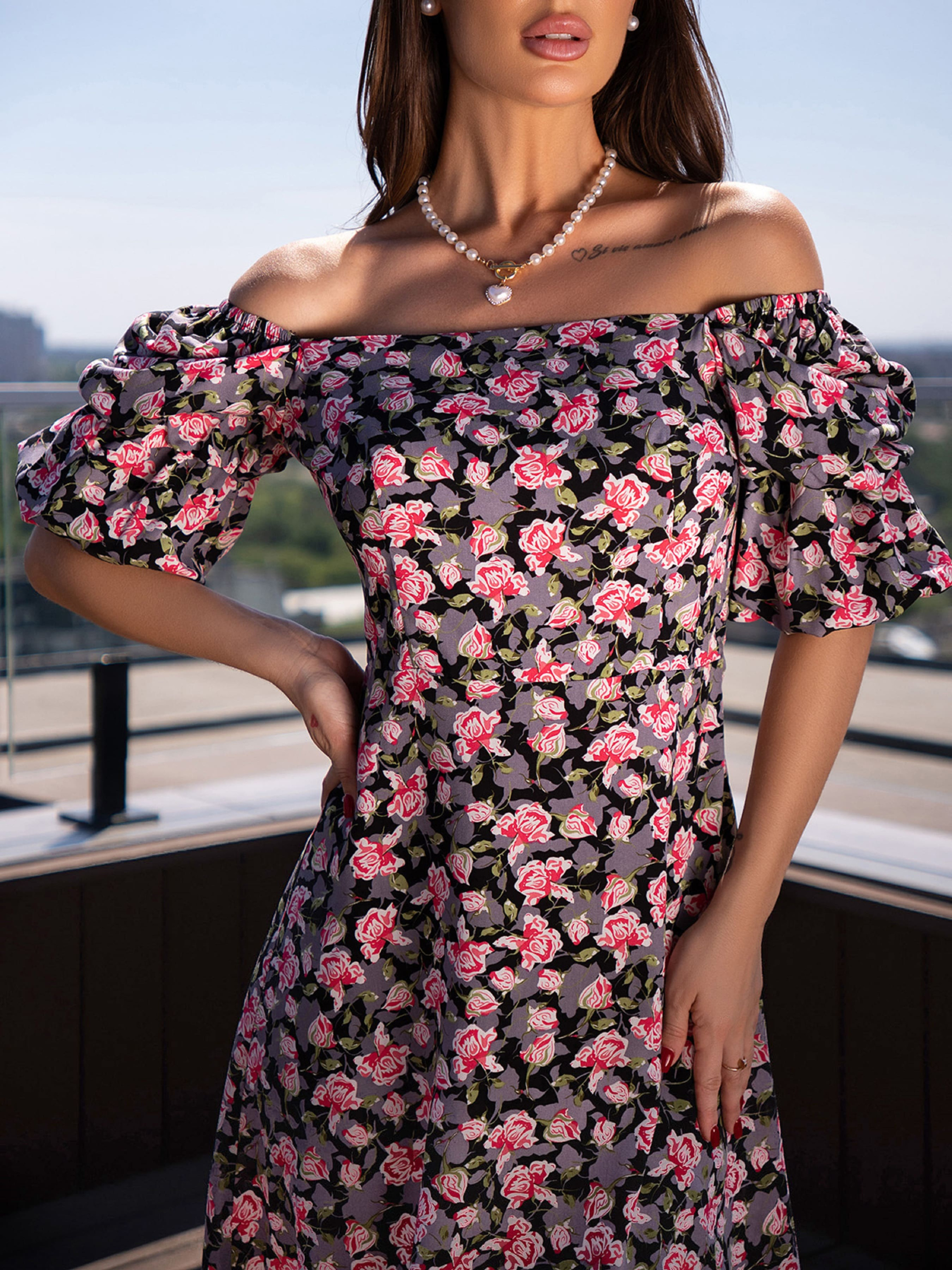 Черное мини платье облегающего кроя с открытыми плечами. Модель на молнии с короткими объемными рукавами на резинках. Платье выполнено из тонкого штапеля с цветочным принтом.Полуобхват: Грудь: S (41), M (43), L (45), XL (47), Талия: S (34), M (36), L (38), XL (40), Бедра: S (44), M (46), L (48), XL (50), Длина изделия - 82, Рукав - 27, Ткань: Низкой эластичности.